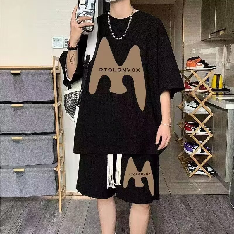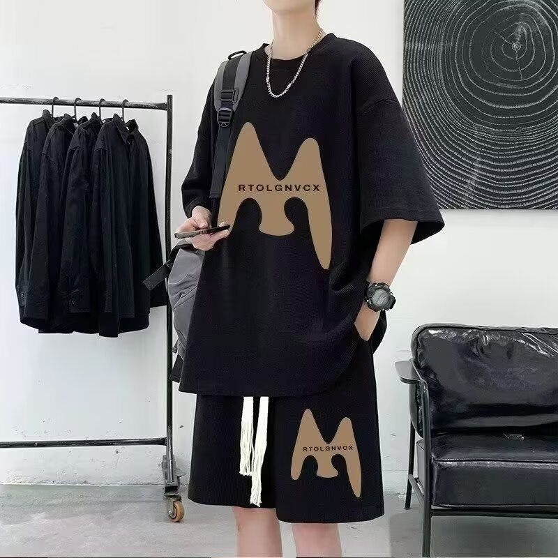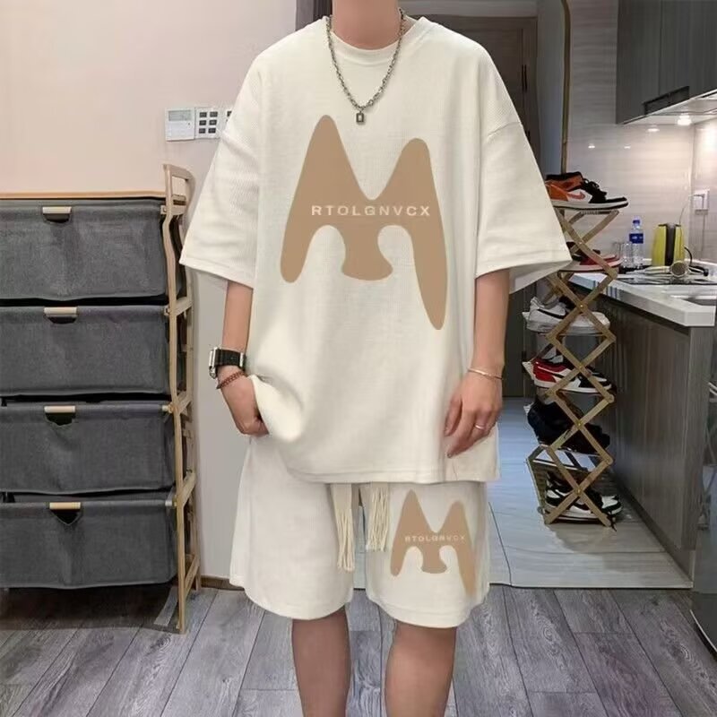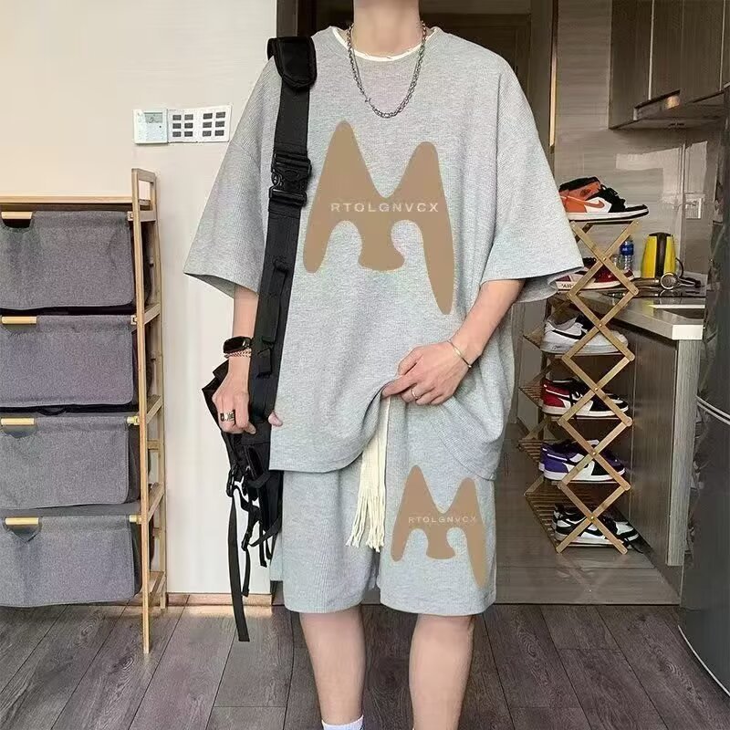 Camisas menos ropa verano para hombres nuevo waffle traje de manga corta deportes casuales de dos piezas en uno guapo y suelto