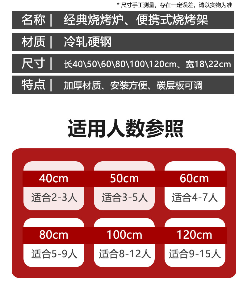 | Especificaciones de la parrilla / plato | Asamblea extra gruesa - horno de parrilla 40 * 18, Asamblea extra gruesa - horno de parrilla 50 * 18, Asamblea extra gruesa - horno de parrilla 60 * 18, Asamblea extra gruesa - horno de parrilla 80 * 18, Asamblea extra gruesa - horno de parrilla 40 * 18 + set de parrilla de siete piezas, Asamblea extra gruesa - horno de parrilla de 50 * 18 + set de parrilla de siete piezas, Asamblea extra gruesa - horno de parrilla de 60 * 18 + set de parrilla de siete piezas, Asamblea extra gruesa - horno de parrilla de 80 * 18 + set de parrilla de siete piezas, 50 palo plano de barbacoa, carbono de barbacoa de árboles de fruta 5 kg, 5 kg de carbono + bloque de encendido + clip, carbono de barbacoa de árboles de fruta 10 kg, 10 kg de carbono + bloque de encendido + clip. |