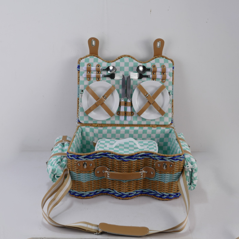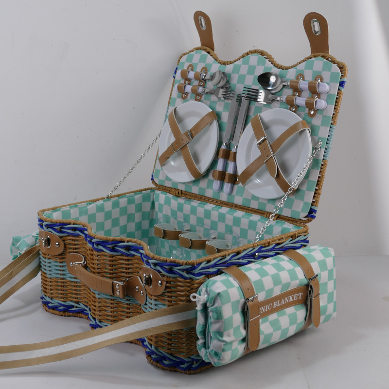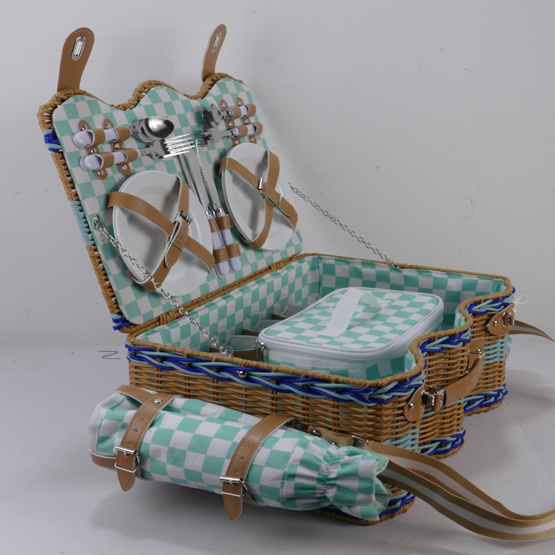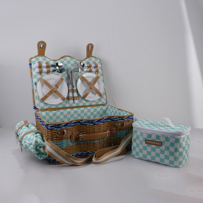 Comercio exterior de alta calidad imitación de caña de plástico trenzado canasta de picnic canasta de almacenamiento de cuatro personas canasta de picnic con almohadilla de picnic