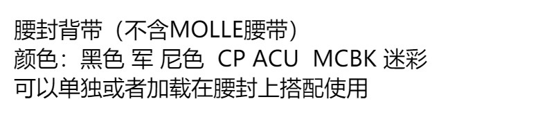 | Color | CP, Black CP, Camuflaje, Niche, Verde Militar, ACU, Negro |