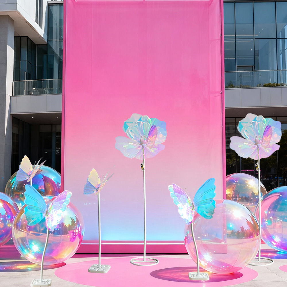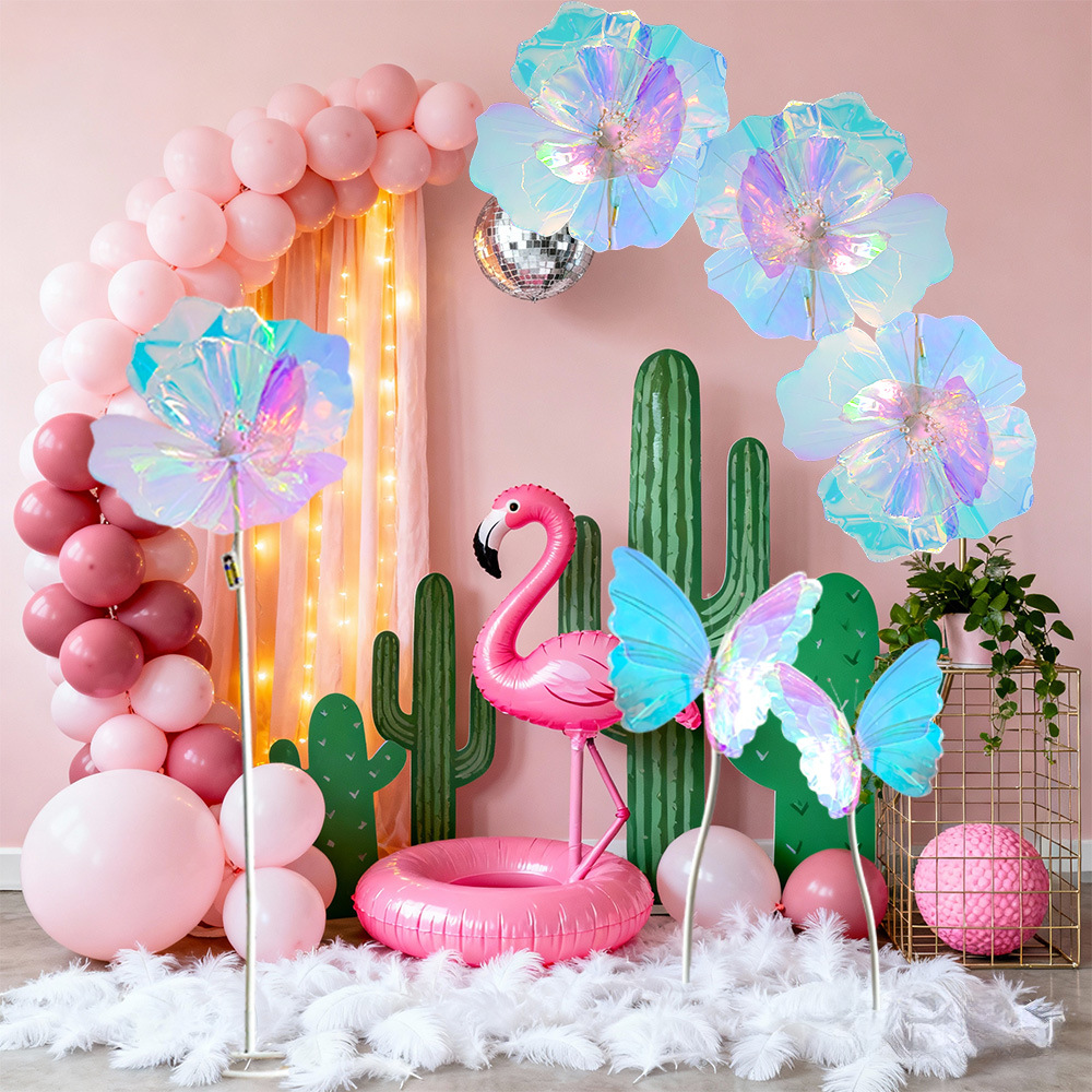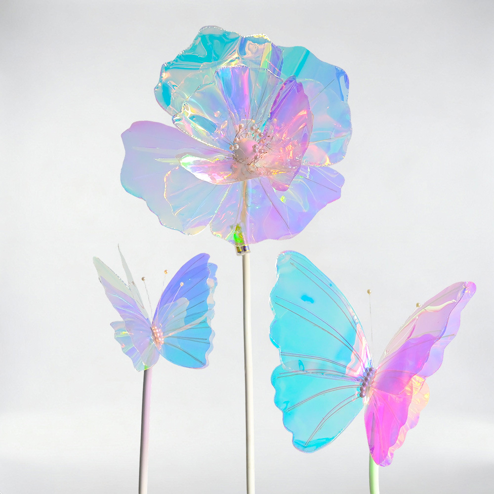 Flores láser flash, tarjetas de perforación de fotos, mariposa, decoración floral, accesorios de decoración de apertura del centro comercial