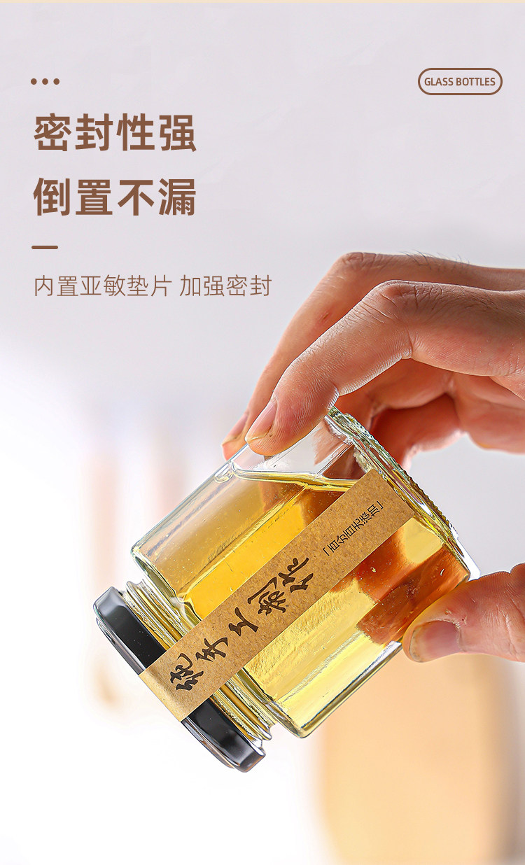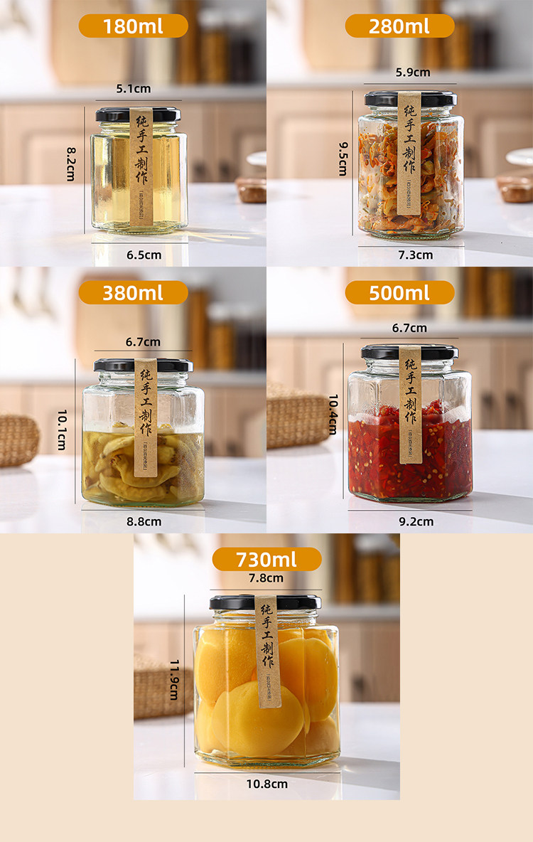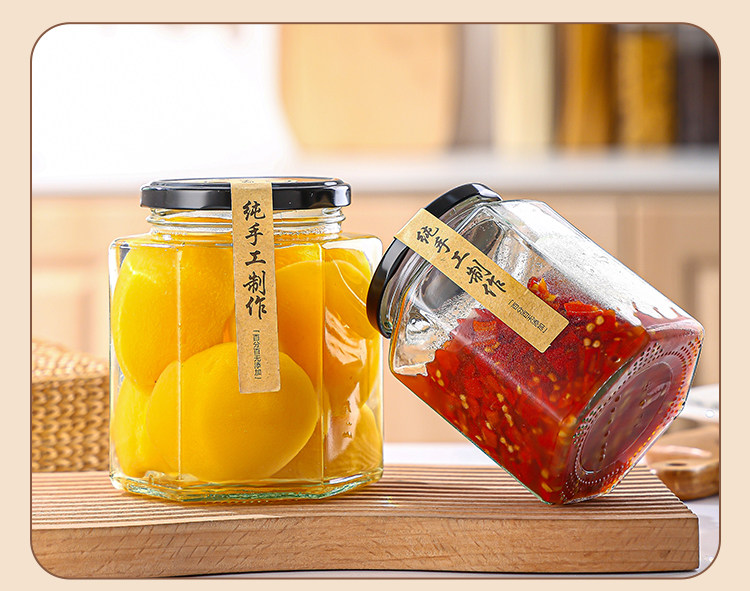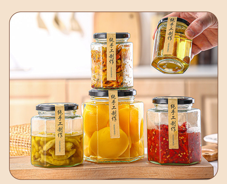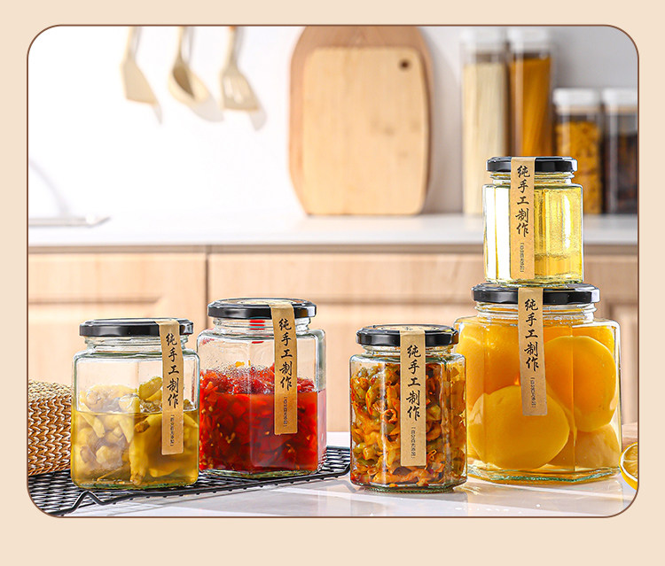 Botella de vidrio hexagonal botella sellada frasco grado alimenticio crema de limón con tapa una libra de miel salsa de chile mermelada botella hexagonal vacía