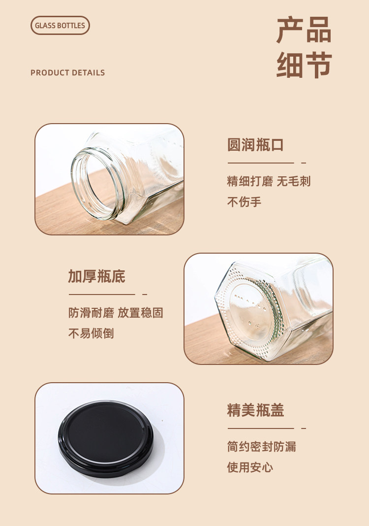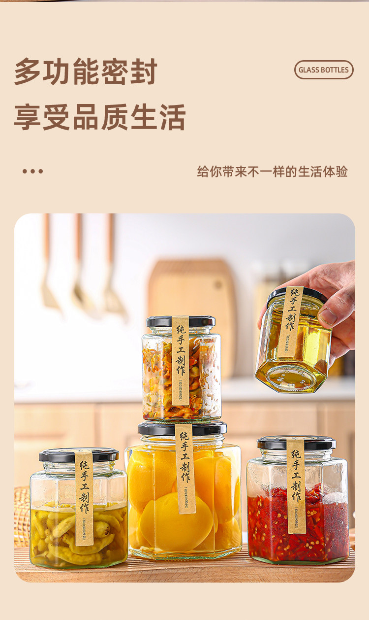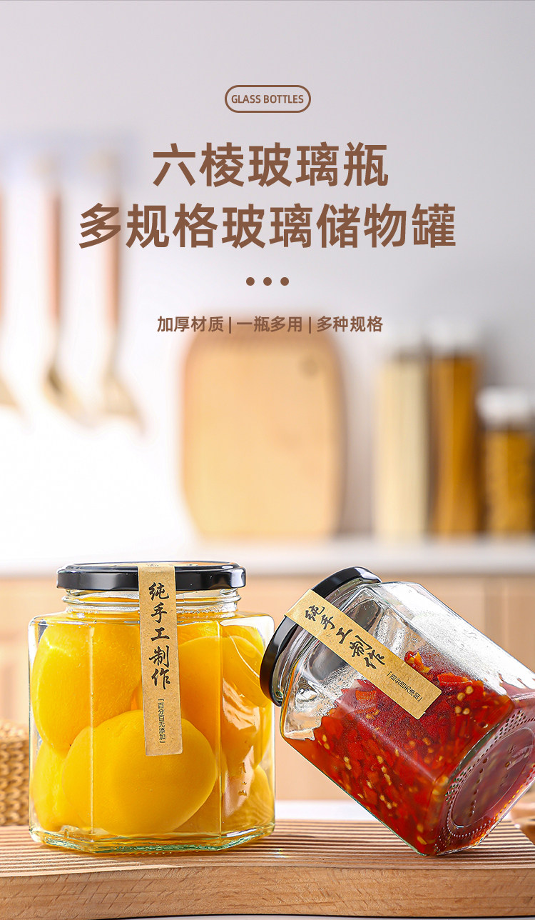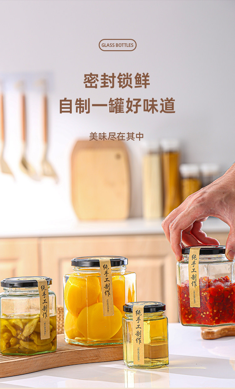 Botella de vidrio hexagonal botella sellada frasco grado alimenticio crema de limón con tapa una libra de miel salsa de chile mermelada botella hexagonal vacía