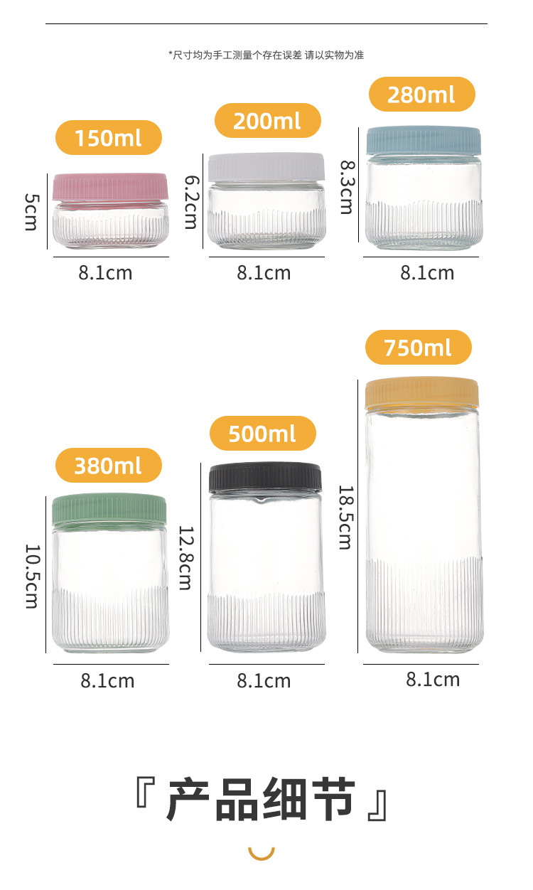 | Especificaciones | Botella de Mason rayada de 750ml, Botella de Mason rayada de 280ml, Botella de Mason rayada de 500ml, Botella de Mason rayada de 380ml, Botella de Mason rayada de 150ml, Botella de Mason rayada de 200ml |