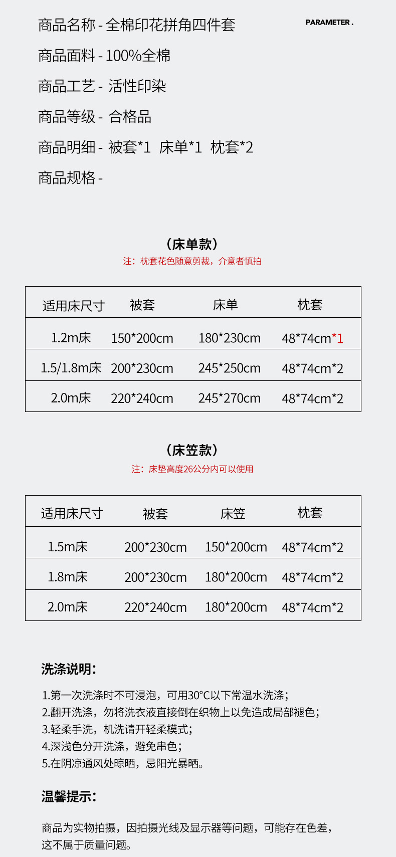 | Especificaciones de tamaño | 1.2m sábanas de tres piezas [aplicable a 150 * 200 edredones], 1.5m sábanas de cuatro piezas [aplicable a 200 * 230 edredones], 1.8m sábanas de cuatro piezas [aplicable a 200 * 230 edredones], 2m sábanas de cuatro piezas [aplicable a 220 * 240 edredones], 1.5m sábanas de cuatro piezas [aplicable a 200 * 230 edredones], 1.8m sábanas de cuatro piezas [aplicable a 200 * 230 edredones] |