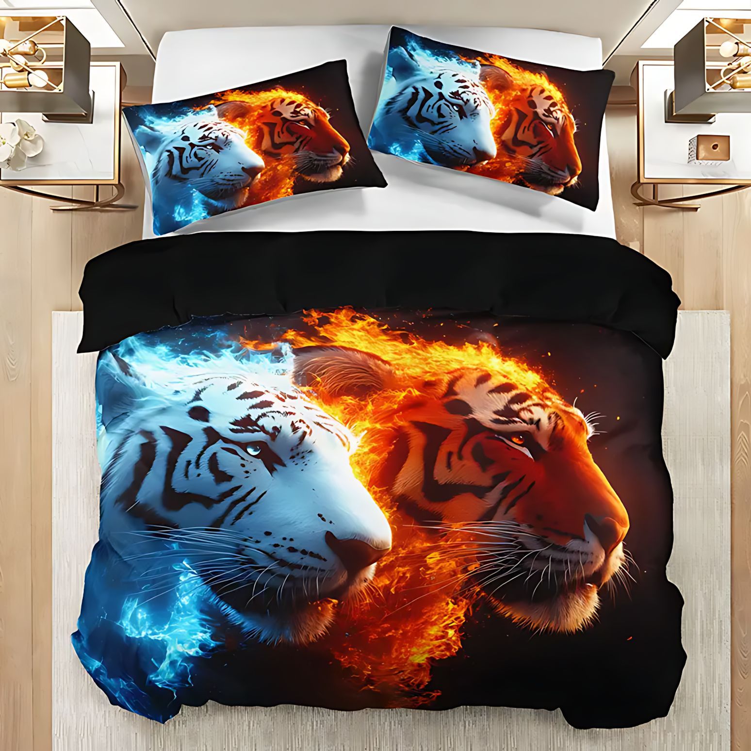 TEMU / JIT Nuevo producto transfronterizo Flame Tiger casa abrasión colcha de cama cubierta de almohada conjunto de ropa de cama para diseñar