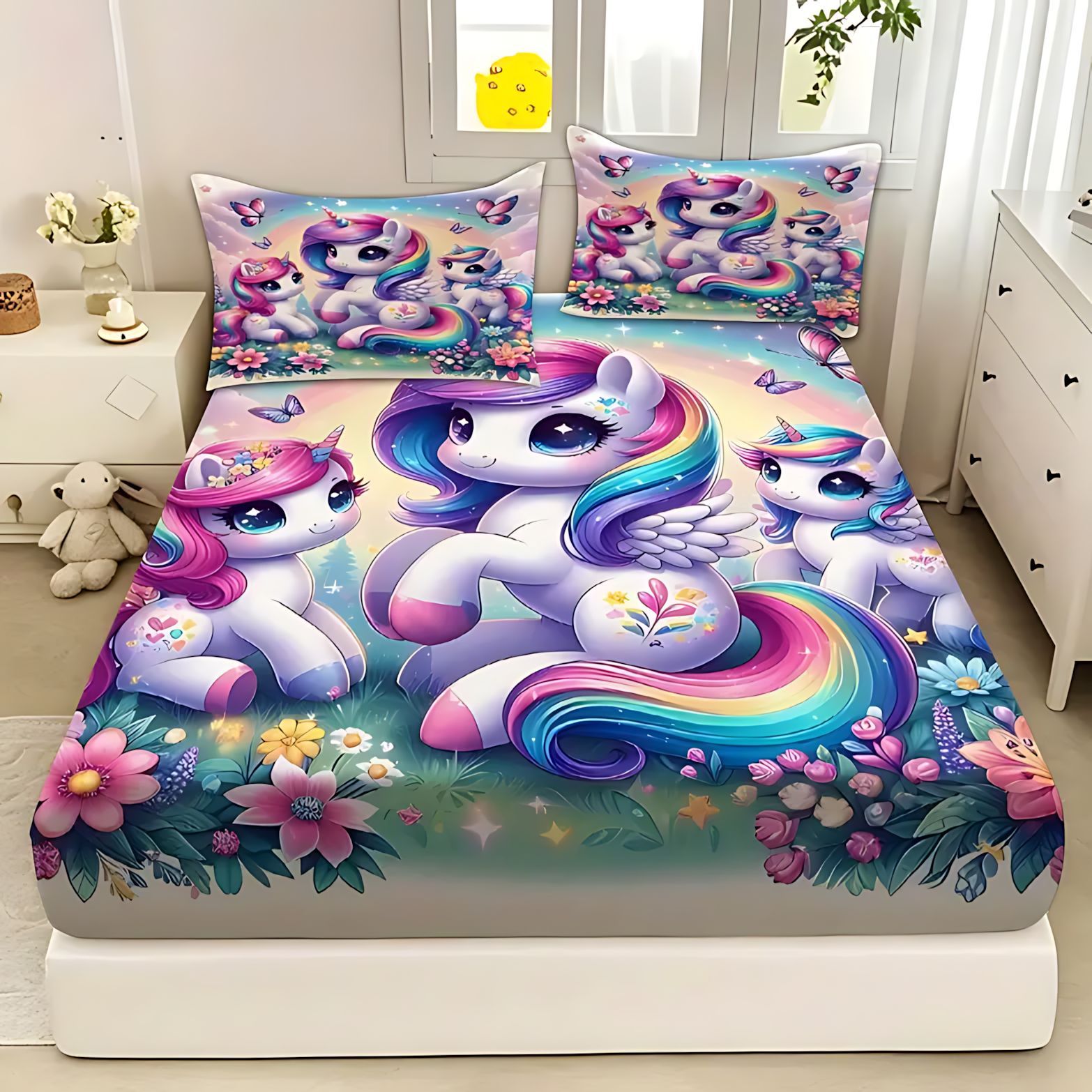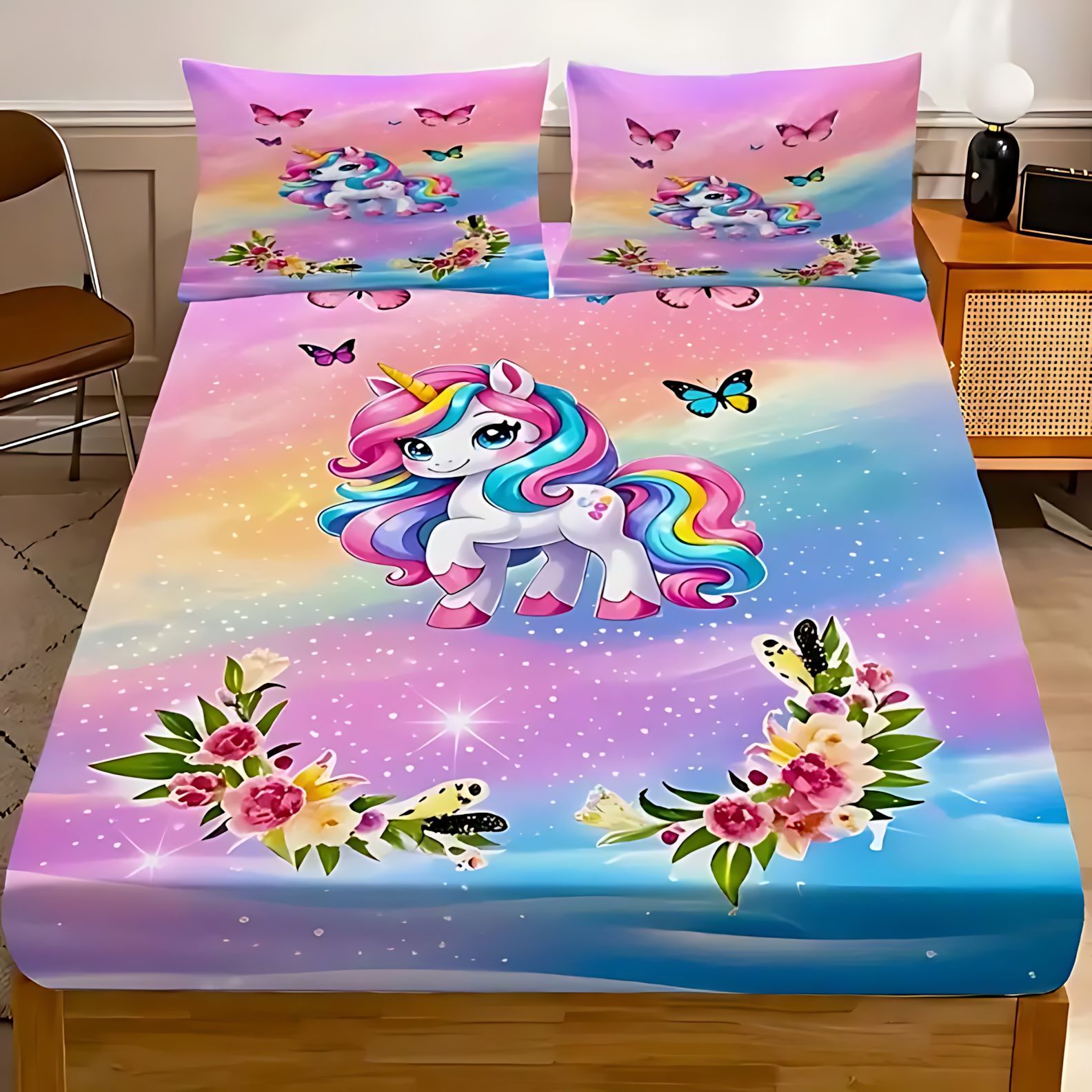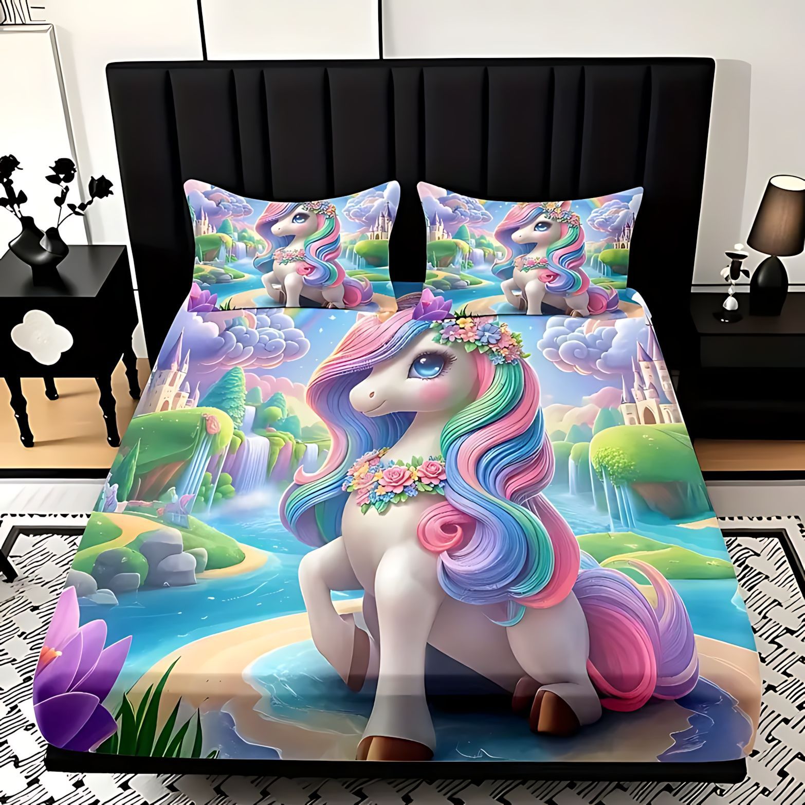 TEMU / JIT dulce y lindo unicornio impresión digital 3D cama de cama de cama de cama de tres piezas