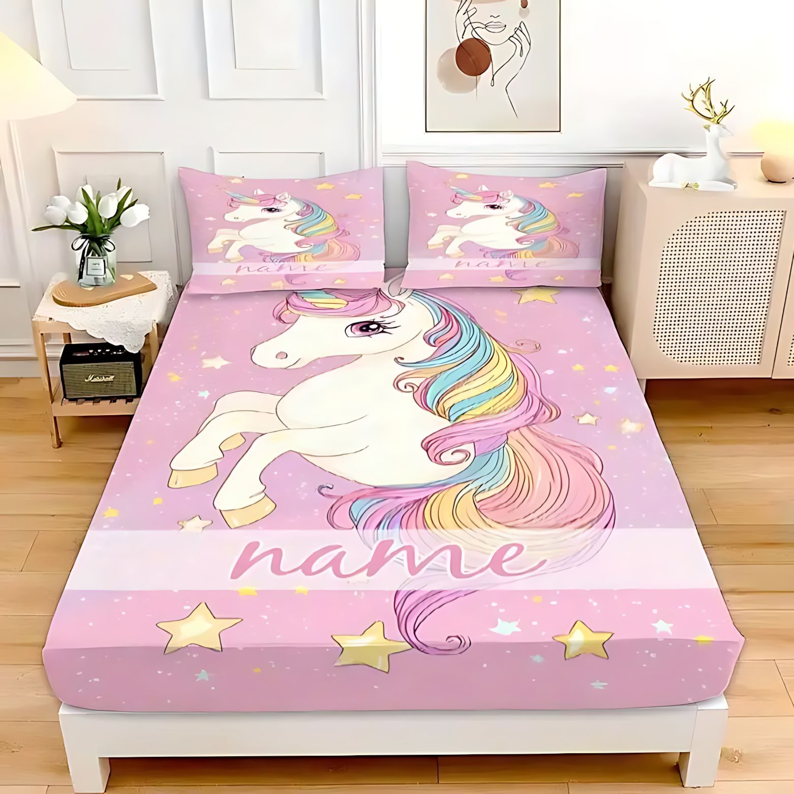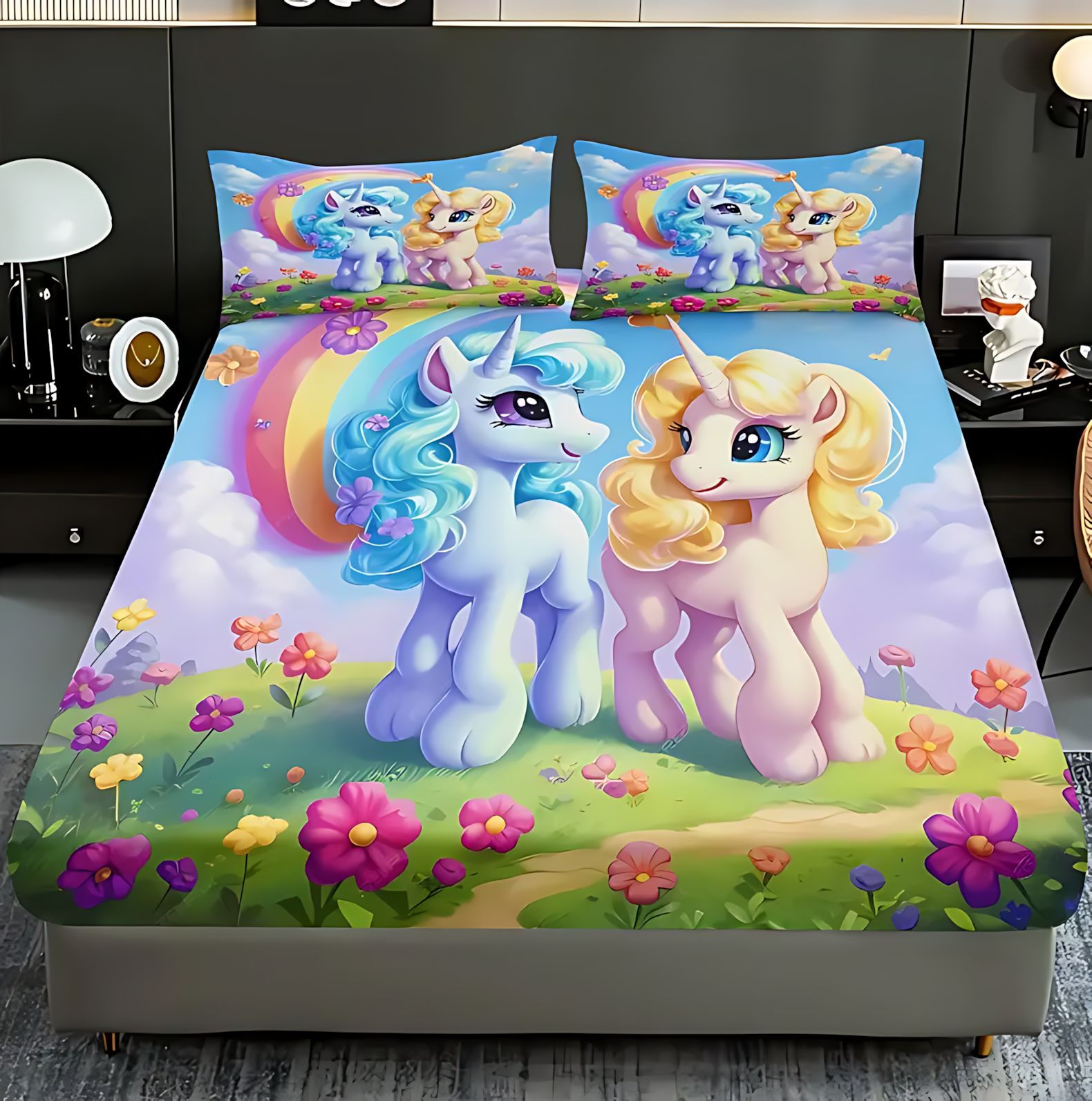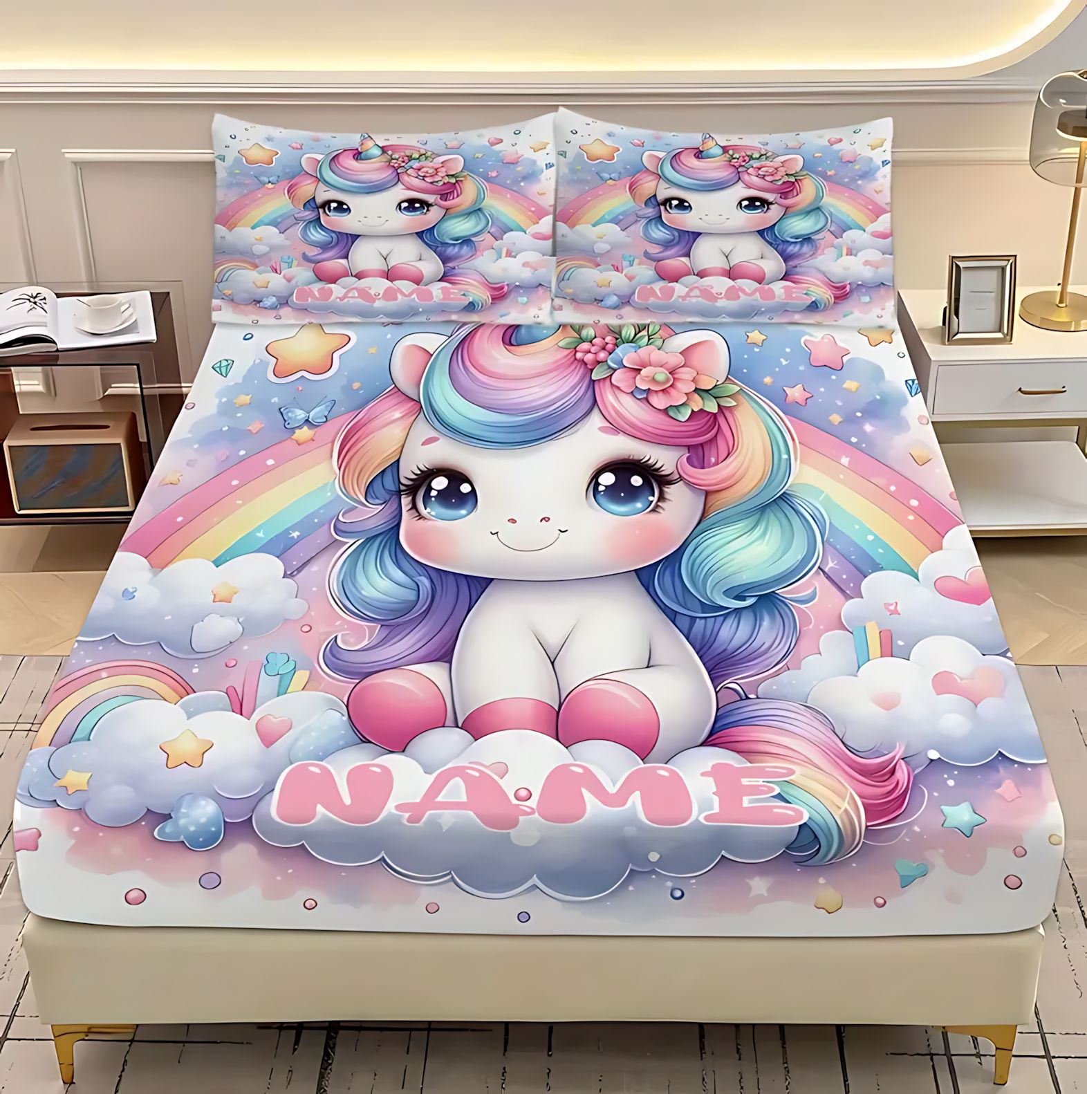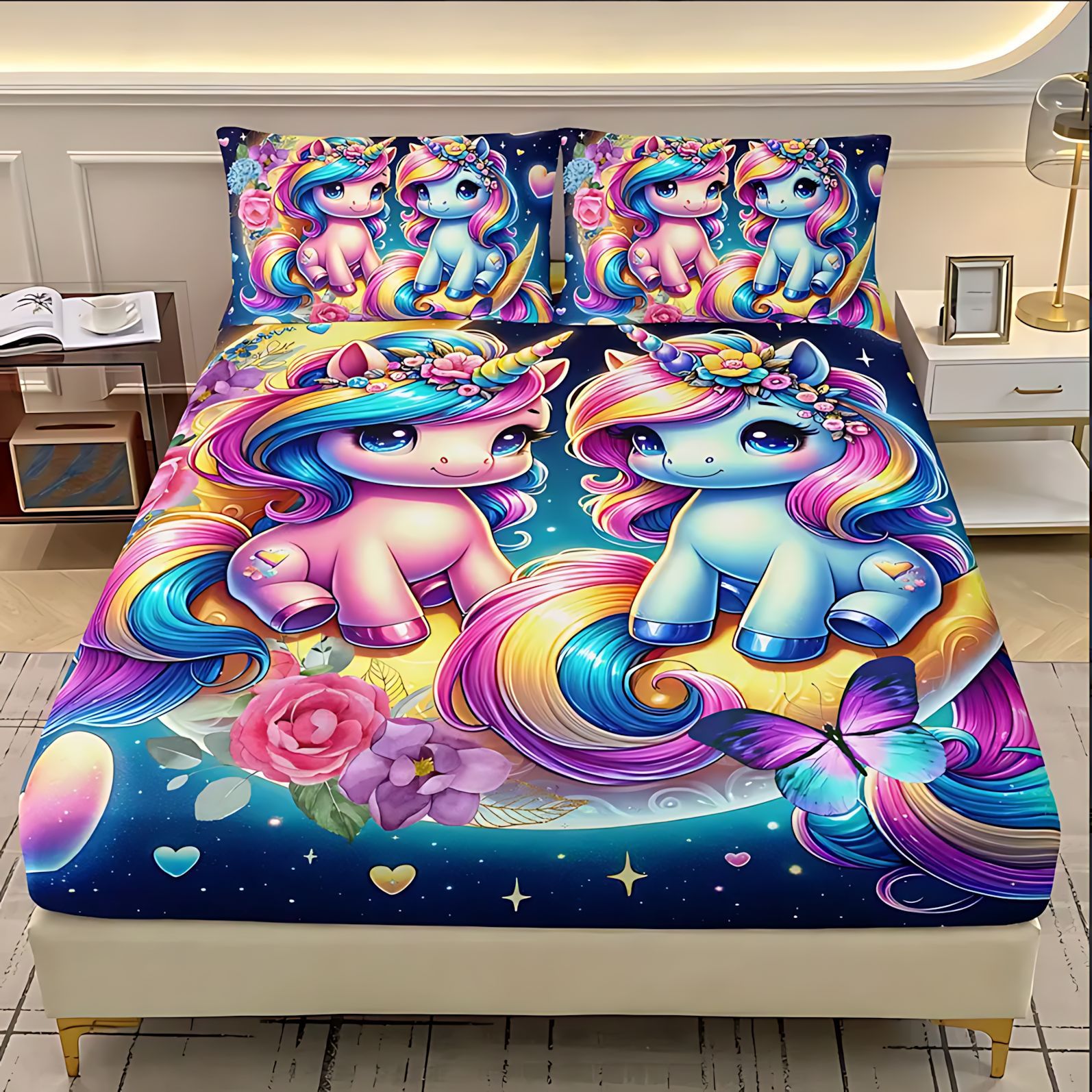 TEMU / JIT dulce y lindo unicornio impresión digital 3D cama de cama de cama de cama de tres piezas