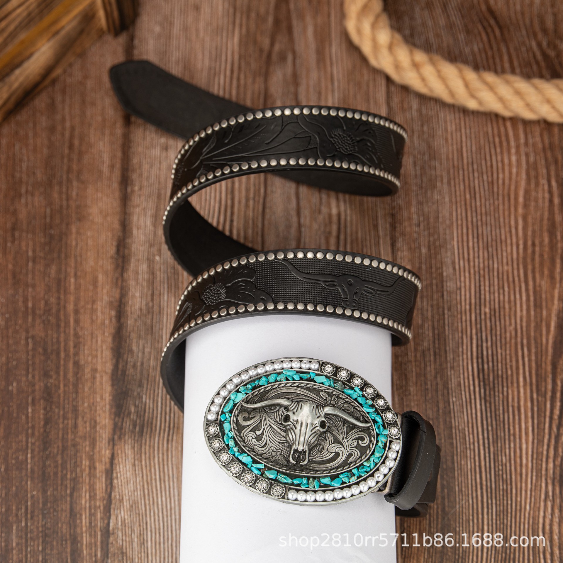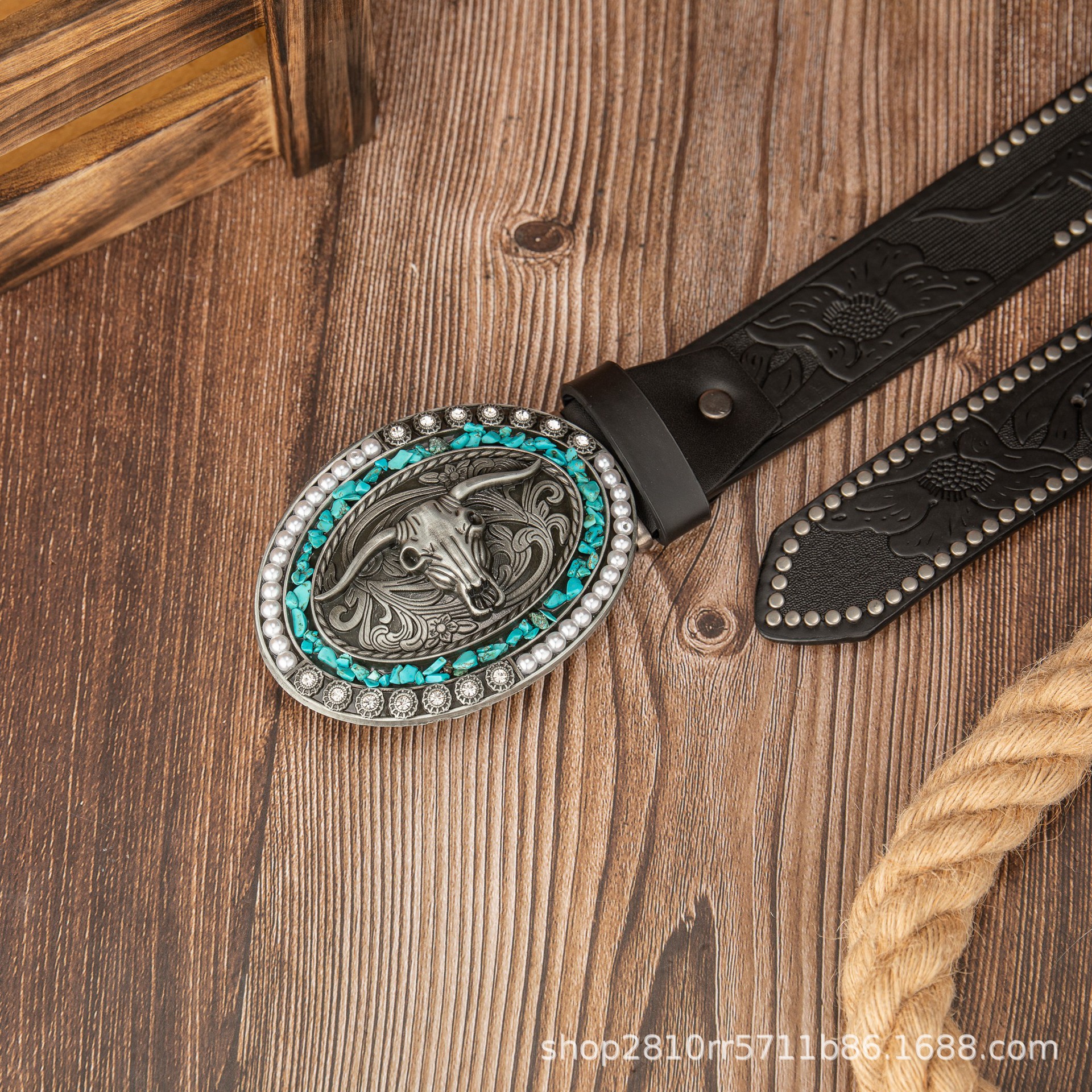 Cross-border retro nuevo estilo azul turquesa cuentas de madera cabeza de toro hebilla cinturón de cuero PU punk europeo y americano