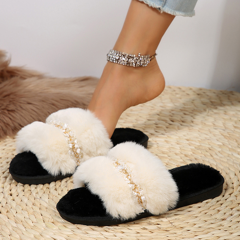 Una cadena de estilo europeo con una parte inferior plana y zapatillas de terciopelo para mujeres, interior y exterior, nuevas zapatillas de algodón de invierno para mujeres