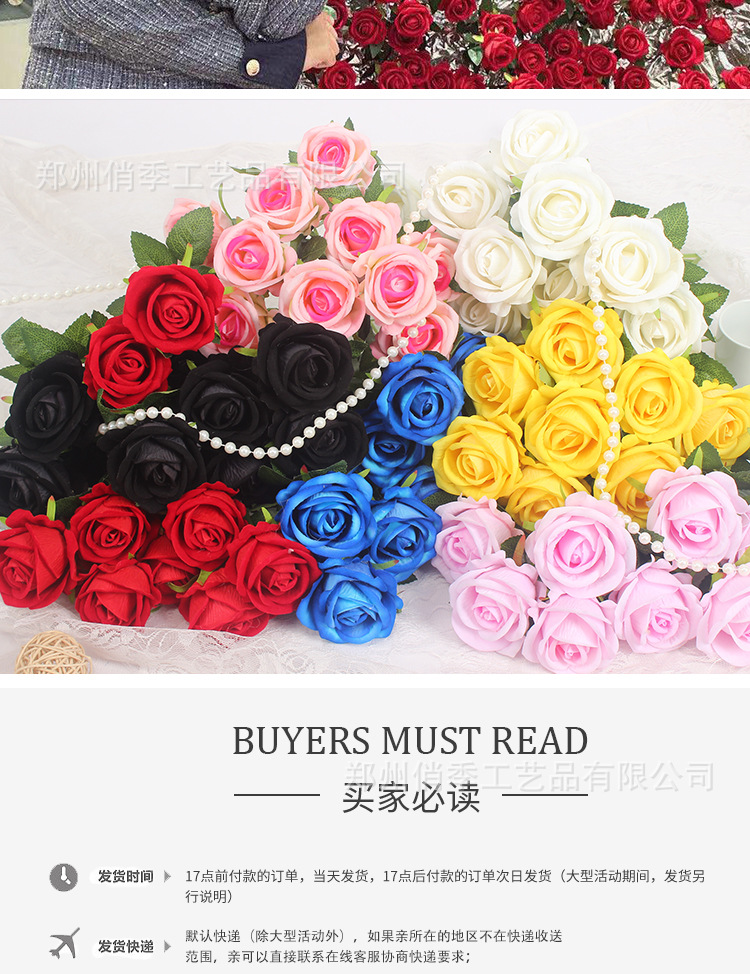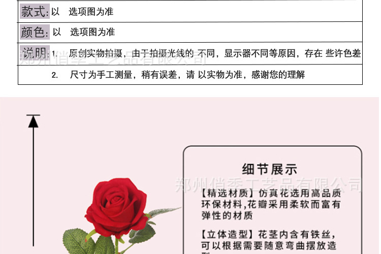 | Colores | Rosa de franela roja/10 ramas,Rosa de franela roja oscura/10 ramas,Champagne franela rosa/10 ramas,Rosa de franela azul zafiro/10 ramas,Rosa rosa de franela roja/10 ramas,Rosa de franela morada clara/10 ramas,Rosa de franela amarilla Ya/10 ramas,Rosa de franela blanca/10 ramas,Rosa de franela negra/10 ramas,Rosa de franela rosa/10 ramas,Rosa única roja Alice/10 ramas,Paño de seda rojo 3 cabezas rosa leffita roja/10 ramas,3 rosas Manta rojas rosas/10 ramas,Tela de seda roja 3 cabezas Alice Rose/10 ramas,3 rosas rojas de Manta/10 ramas,Rojo de una sola rama con varilla Lefimei/10 ramas (sin hojas),Tubo de aluminio y plástico de 1216mm 5 metros (más de 5 metros de cabello conectado),Alicates/asa para cortar flores,Papel de aluminio 1 rollo/26 m,Un rollo de alambre de púas/20 metros,Tablero de espuma verde 1 hoja/espesor 3cm,5 pares de guantes de seguro laboral,25CM bridas/1 paquete,12CM bridas largas/bolsa,15CM bridas largas/bolsa,20CM bridas largas/bolsa |