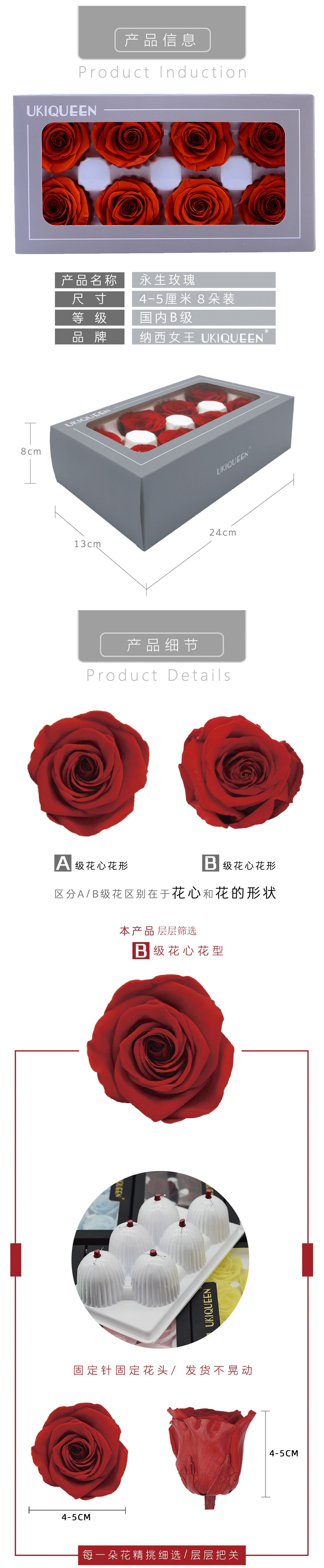 4-5cm 8 Flores, grado B DIY flores eternas, rosas eternas, Yunnan Kunming al por mayor, flores preservadas