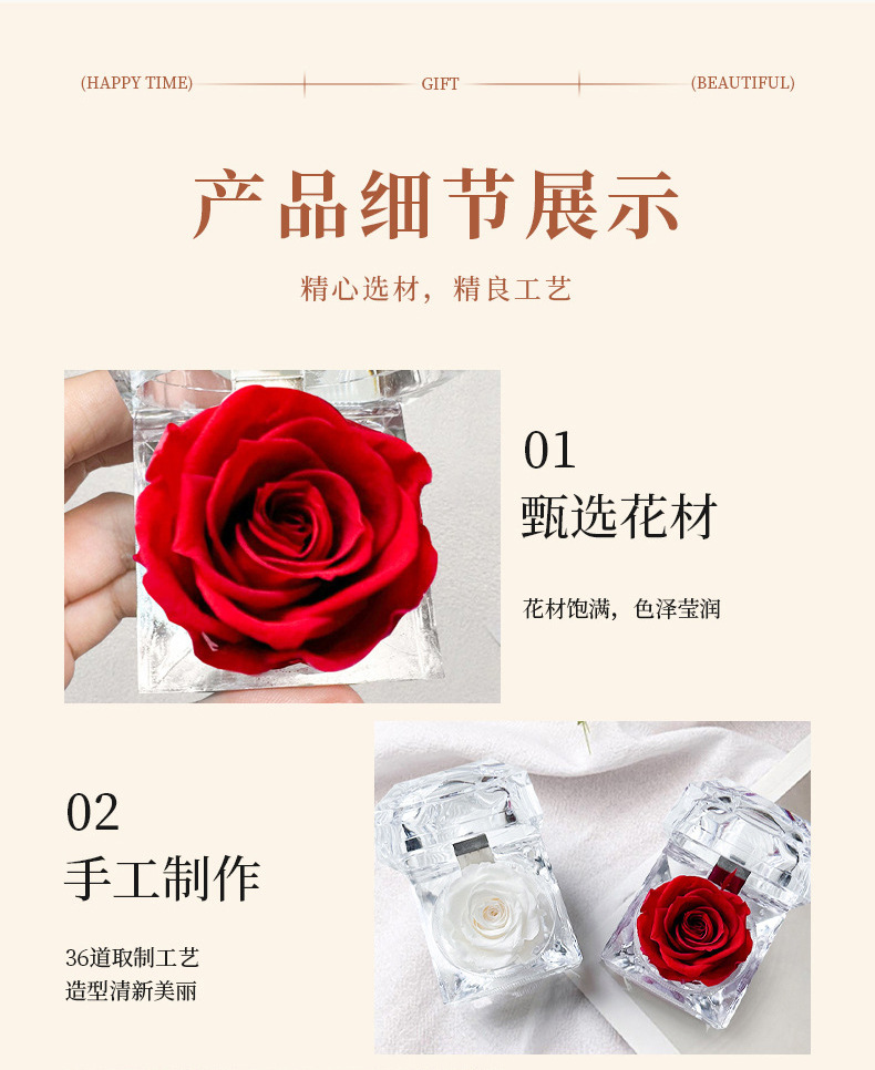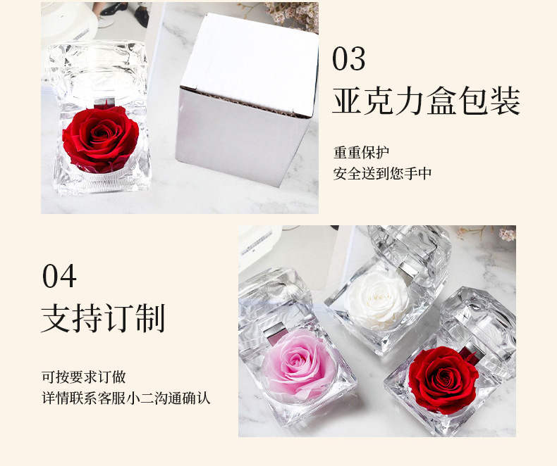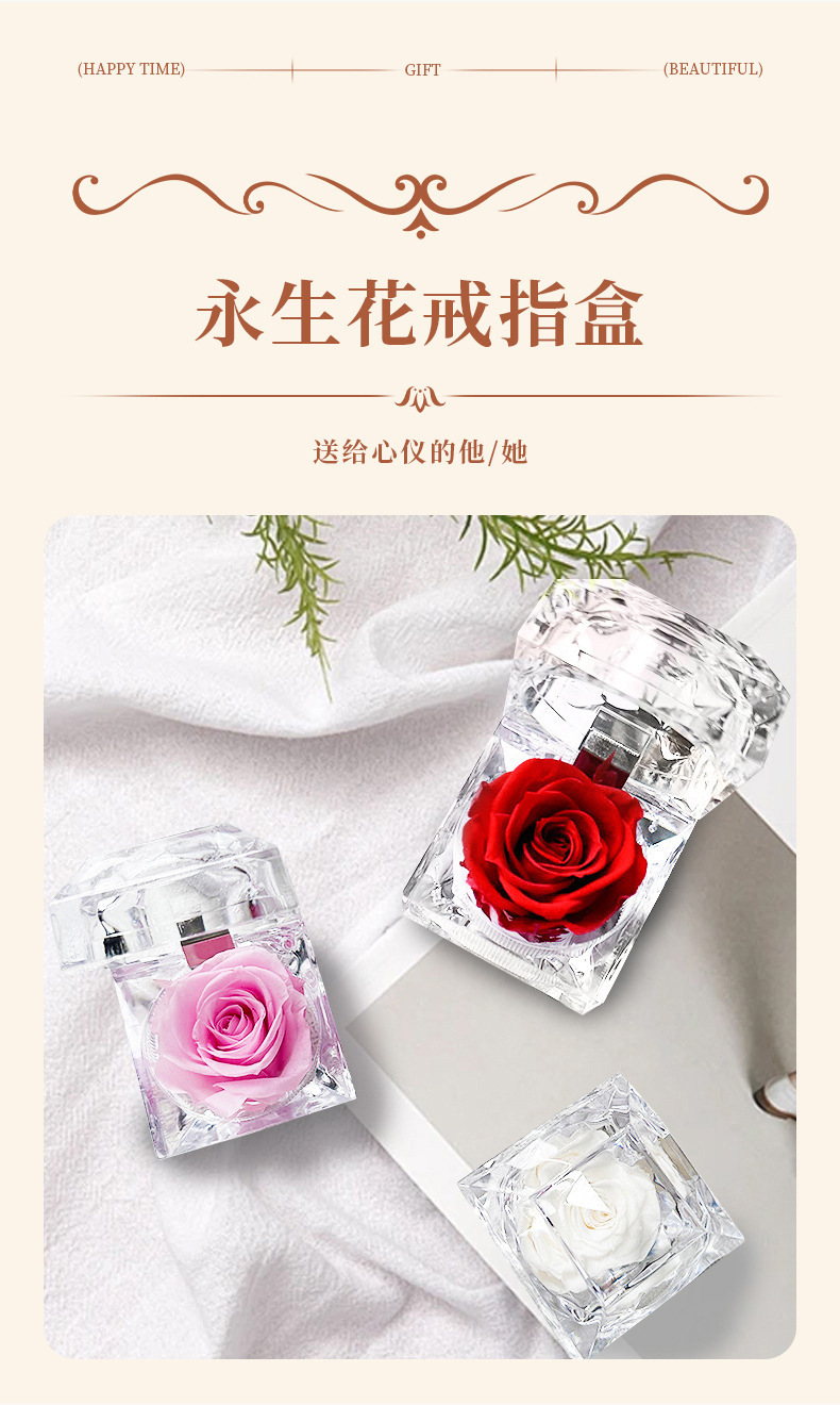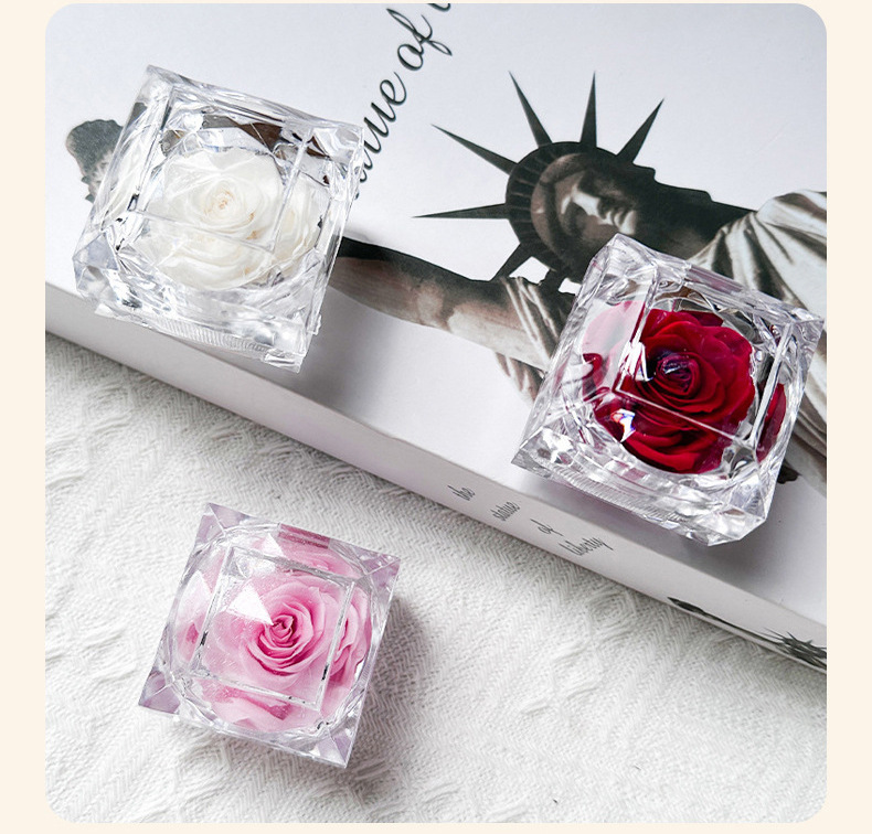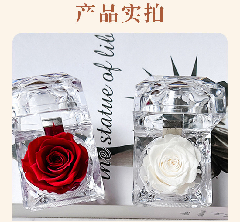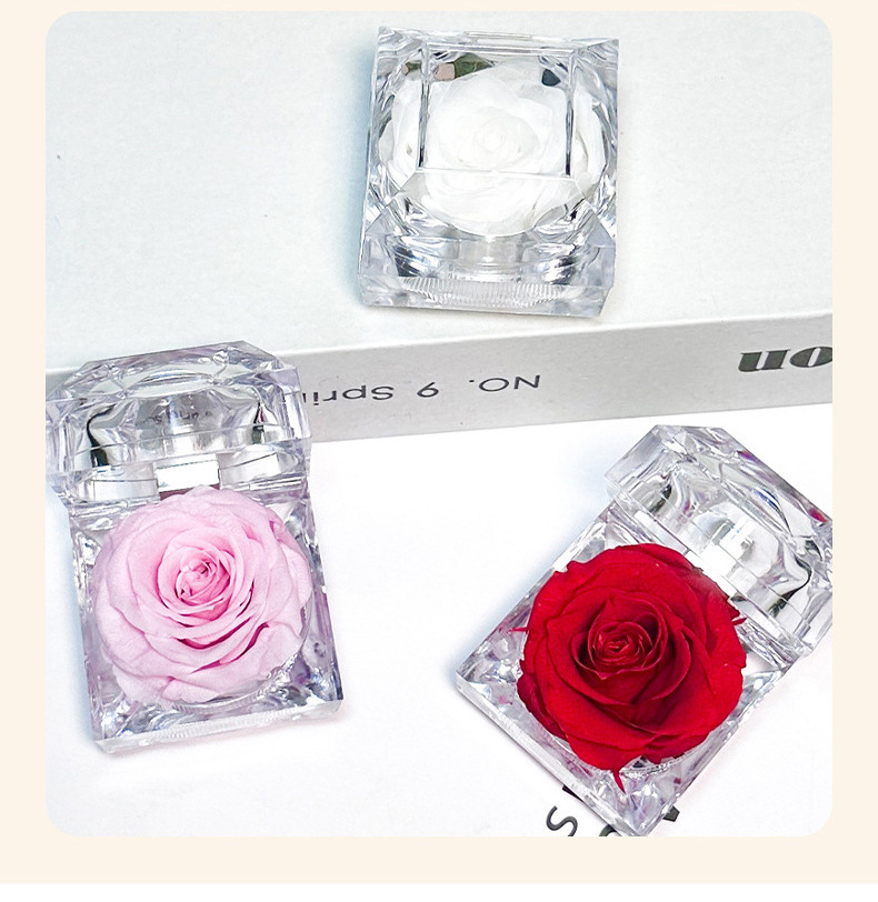 Caja de anillo acrílico transparente de rosa eterna confesión de flores verdaderas Qixiao regalo de día de San Valentín caja de regalo de anillo de vida eterna