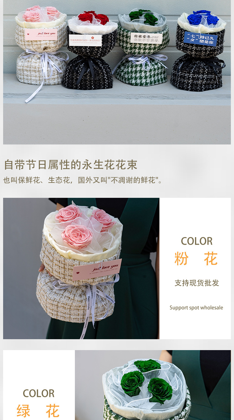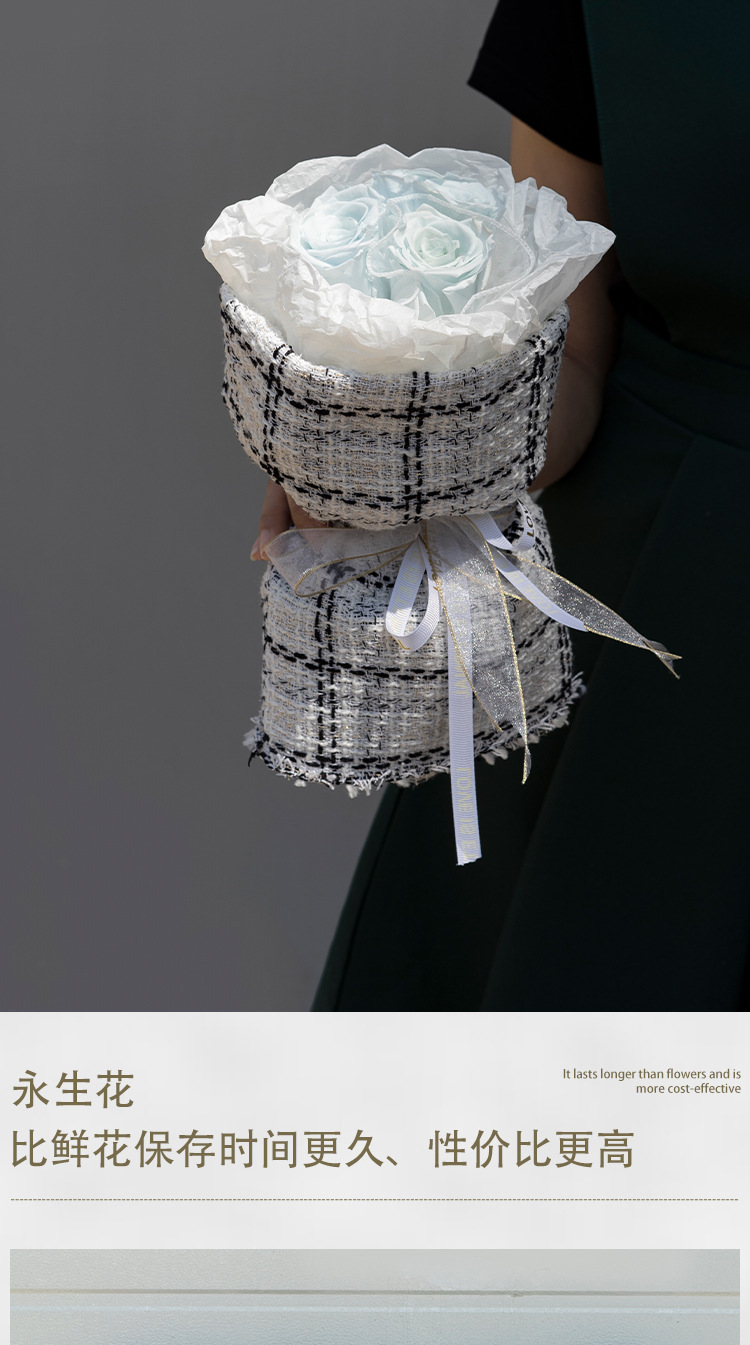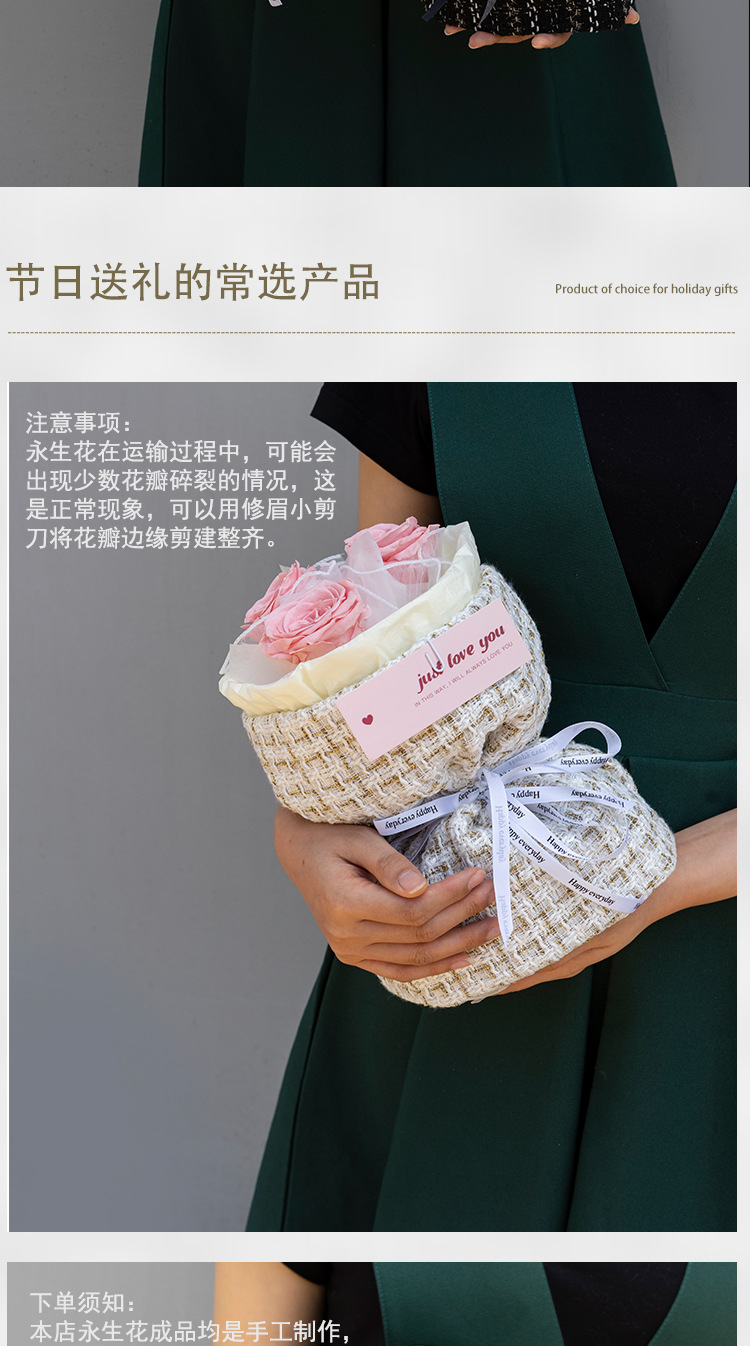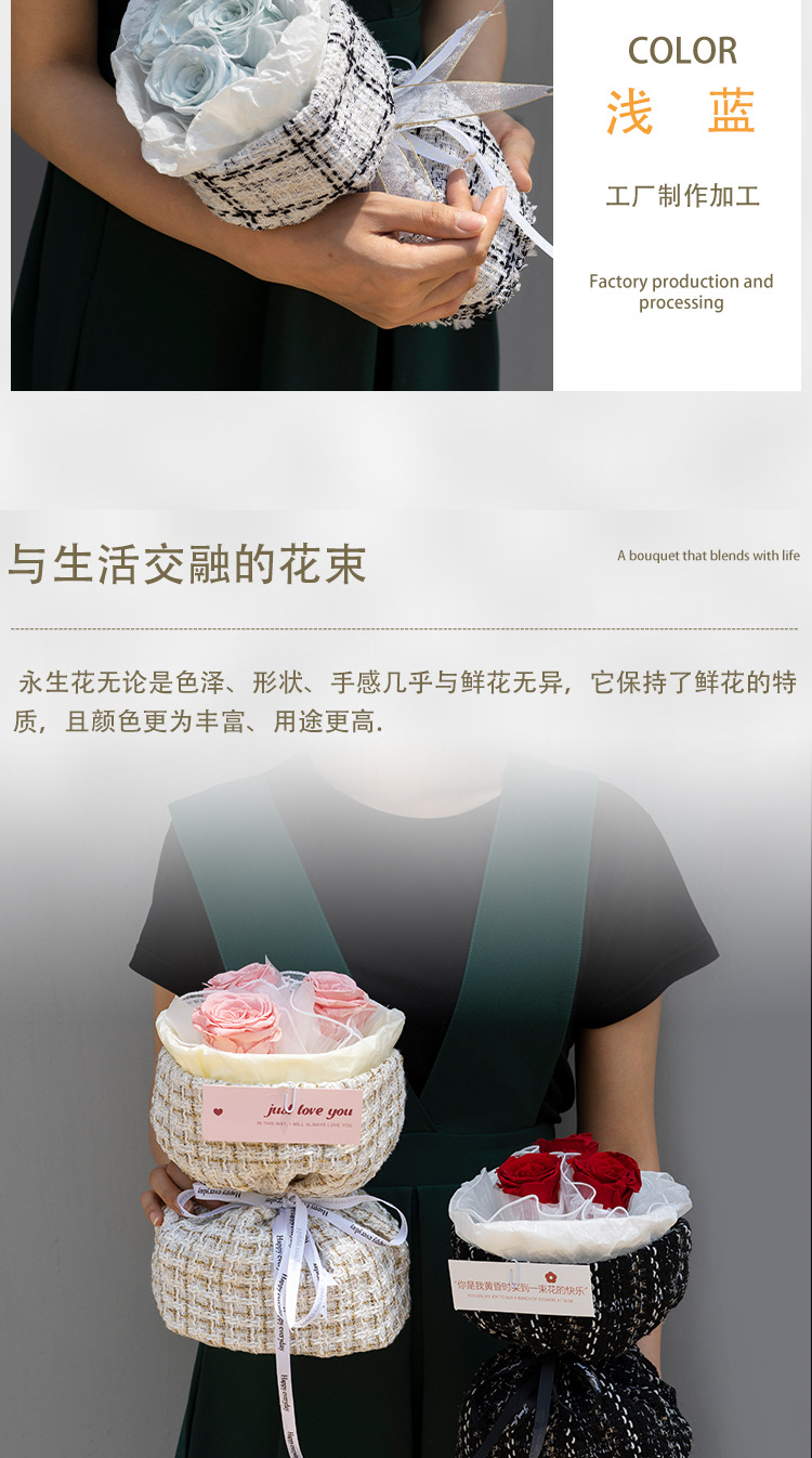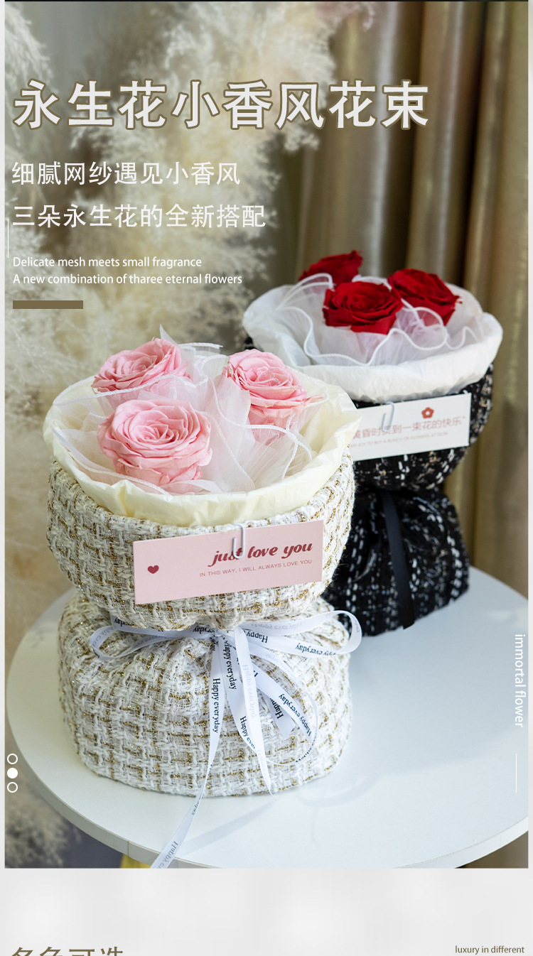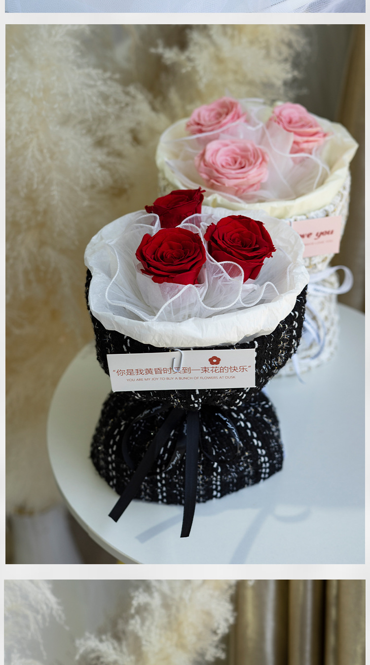 Ramo de rosas eternas de Yunnan en un pequeño estilo Chanel, producto terminado para el Día de San Valentín, adorno de regalo de alta gama, ramo eterno al por mayor.