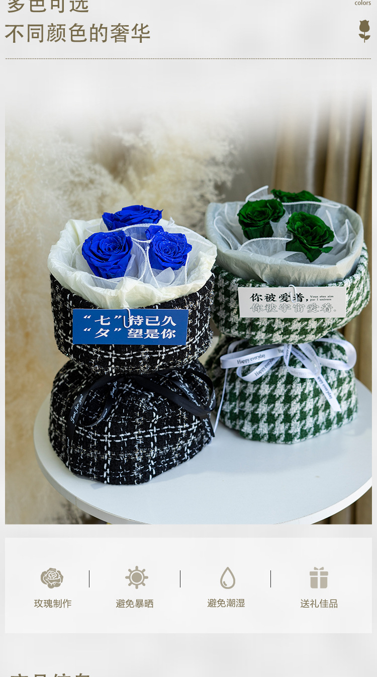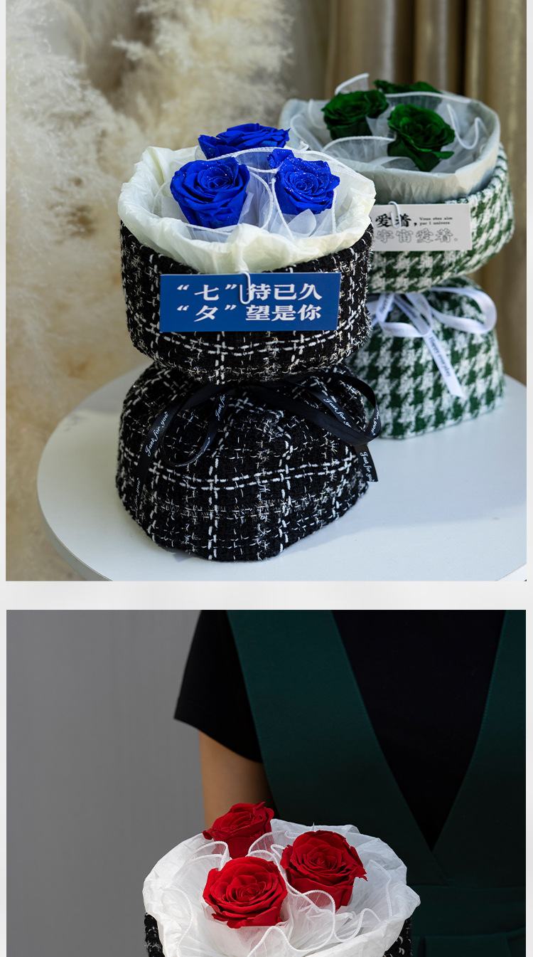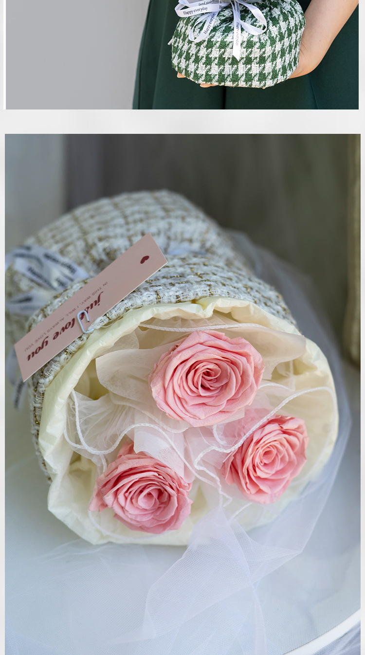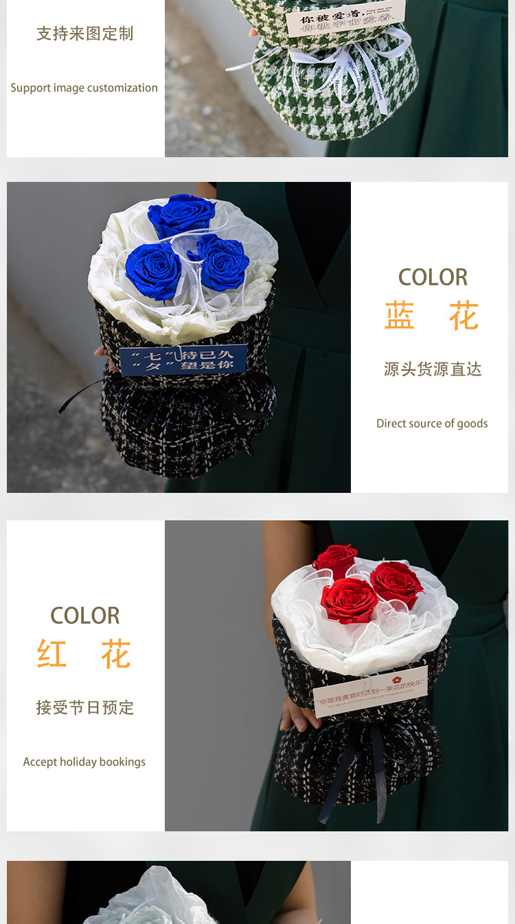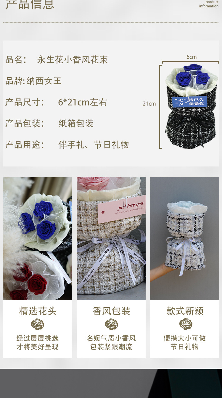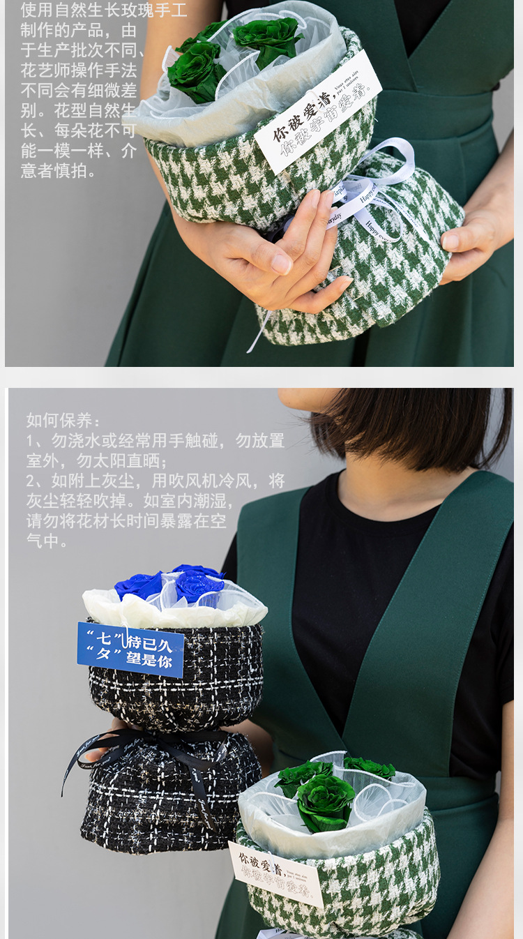 Ramo de rosas eternas de Yunnan en un pequeño estilo Chanel, producto terminado para el Día de San Valentín, adorno de regalo de alta gama, ramo eterno al por mayor.