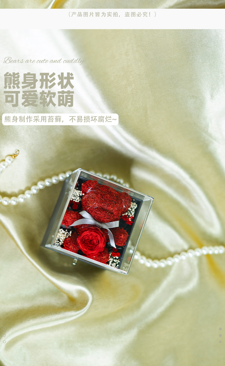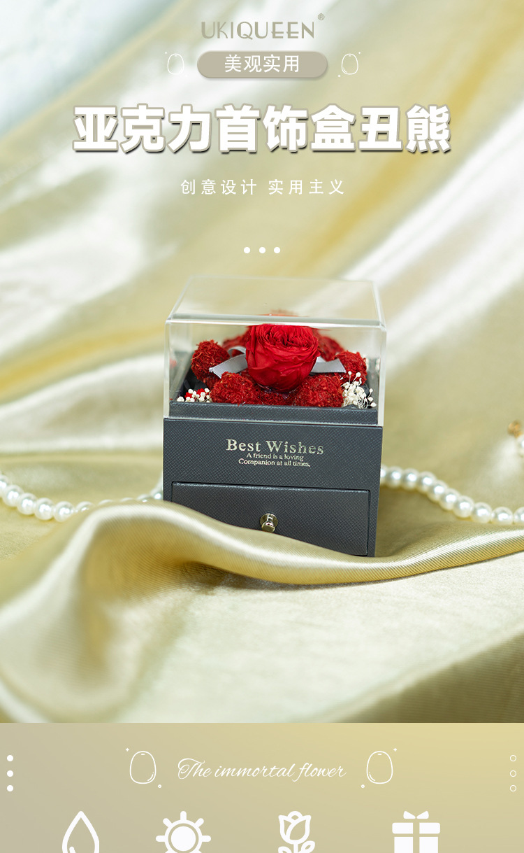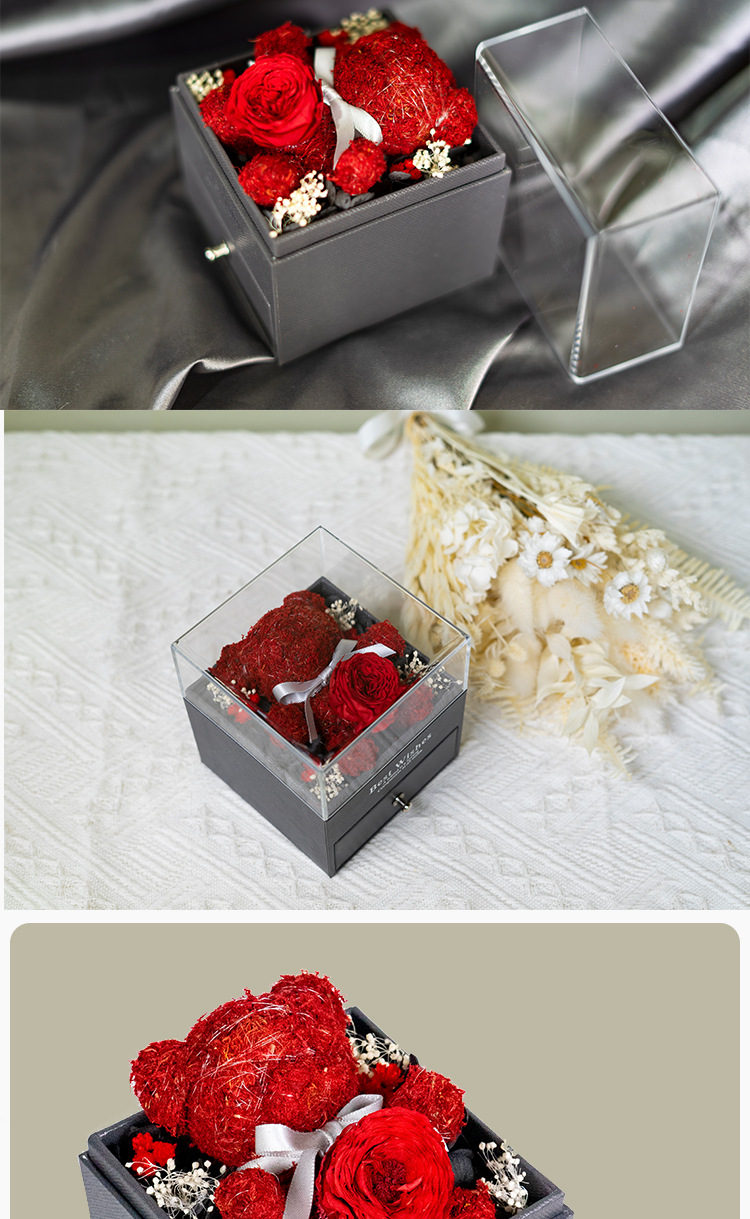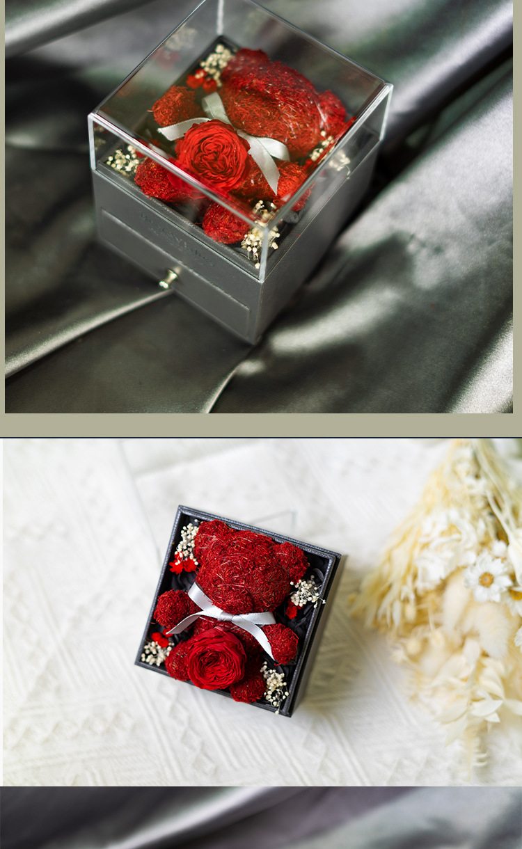 Caja de almacenamiento de joyas acrílica con diseño de oso de musgo de flor eterna, éxito de ventas de Amazon, venta al por mayor de fábrica para comercio exterior, regalo de flor eterna.