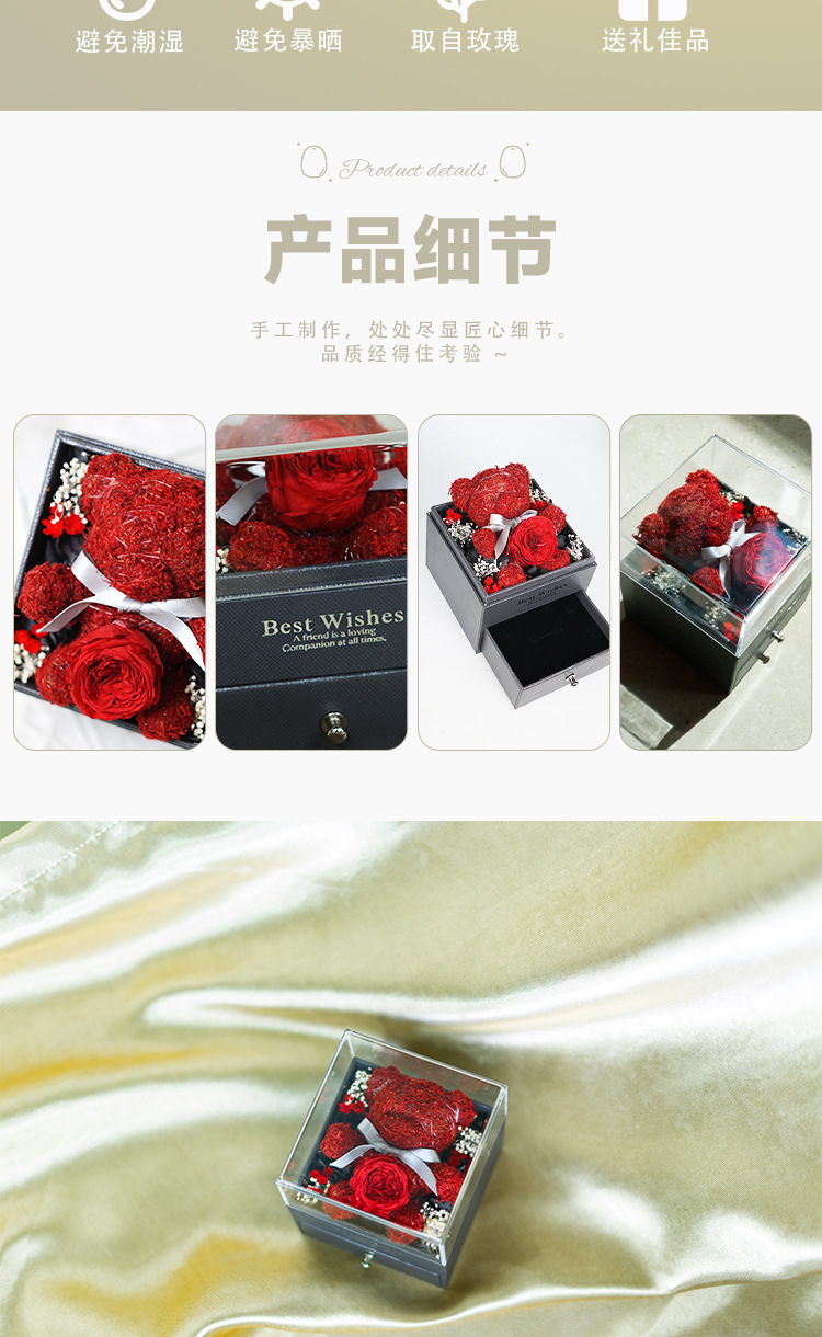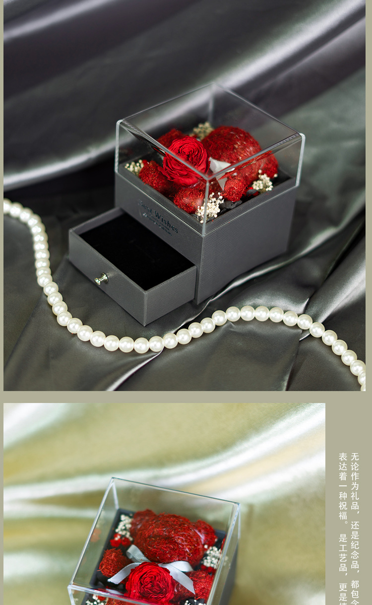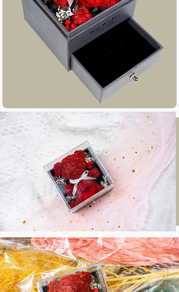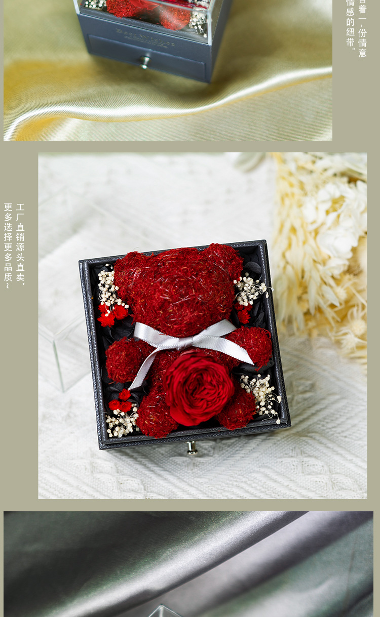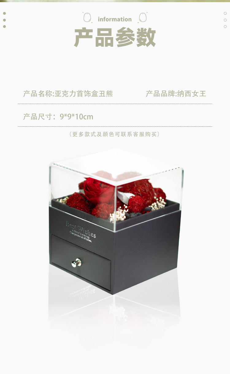 Caja de almacenamiento de joyas acrílica con diseño de oso de musgo de flor eterna, éxito de ventas de Amazon, venta al por mayor de fábrica para comercio exterior, regalo de flor eterna.