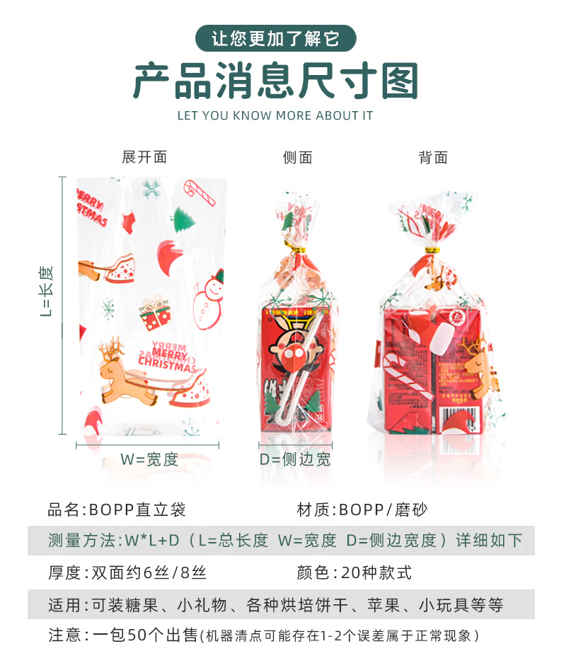 | Especificaciones y modelos | 圣诞P024 50个/配送扎条-小号:13*19+5CM,圣诞P024 50个/配送扎条-中号:16*24+6CM,圣诞P024 50个/配送扎条-大号:20*28+7cm,穿牛仔裤的小伙伴 50个/配送扎条-小号:13*19+5CM,穿牛仔裤的小伙伴 50个/配送扎条-中号:16*24+6CM,穿牛仔裤的小伙伴 50个/配送扎条-大号:20*28+7cm,圣诞P024 亮面 50个/配送扎条-中号:16*24+6CM,新年元素A款 50个/配送扎条-小号:13*19+5CM,新年元素A款 50个/配送扎条-中号:16*24+6CM,新年元素A款 50个/配送扎条-大号:20*28+7cm,新年元素B款 50个/配送扎条-小号:13*19+5CM,新年元素B款 50个/配送扎条-中号:16*24+6CM,新年元素B款 50个/配送扎条-大号:20*28+7cm,爱吃吨吨 50个/配送扎条-小号:13*19+5CM,假期元素 50个/配送扎条-小号:13*19+5CM,假期元素 50个/配送扎条-中号:16*24+6CM,假期元素 50个/配送扎条-大号:20*28+7cm,爆米发 50个/配送扎条-小号:13*19+5CM,爆米发 50个/配送扎条-中号:16*24+6CM,爆米发 50个/配送扎条-大号:20*28+7cm,全彩色 礼盒 50个/配送扎条-小号:13*19+5CM,全彩色 礼盒 50个/配送扎条-中号:16*24+6CM,全彩色 礼盒 50个/配送扎条-大号:20*28+7cm,棕色姜饼人 50个/配送扎条-小号:13*19+5CM,棕色姜饼人 50个/配送扎条-中号:16*24+6CM,棕色姜饼人 50个/配送扎条-大号:20*28+7cm,全彩色 元气森林 50个/配送扎条-小号:13*19+5CM,全彩色 元气森林 50个/配送扎条-中号:16*24+6CM,全彩色 元气森林 50个/配送扎条-大号:20*28+7cm,全彩色 星球杯 50个/配送扎条-小号:13*19+5CM,全彩色 星球杯 50个/配送扎条-中号:16*24+6CM,全彩色 星球杯 50个/配送扎条-大号:20*28+7cm,红色车厘子 50个/配送扎条-小号:13*19+5CM,红色车厘子 50个/配送扎条-中号:16*24+6CM,红色车厘子 50个/配送扎条-大号:20*28+7cm,红色 新年兔 50个/配送扎条-中号:16*24+6CM,粉色草莓 50个/配送扎条-小号:13*19+5CM,粉色草莓 50个/配送扎条-中号:16*24+6CM,粉色草莓 50个/配送扎条-大号:20*28+7cm,粉色水蜜桃 50个/配送扎条-小号:13*19+5CM,粉色水蜜桃 50个/配送扎条-中号:16*24+6CM,粉色水蜜桃 50个/配送扎条-大号:20*28+7cm,粉色圆点 50个/配送扎条-小号:13*19+5CM,粉色圆点 50个/配送扎条-中号:16*24+6CM,粉色圆点 50个/配送扎条-大号:20*28+7cm,粉色条上心心 50个/配送扎条-小号:13*19+5CM,粉色条上心心 50个/配送扎条-中号:16*24+6CM,粉色条上心心 50个/配送扎条-大号:20*28+7cm,蓝色圆点 50个/配送扎条-小号:13*19+5CM,蓝色圆点 50个/配送扎条-中号:16*24+6CM,蓝色圆点 50个/配送扎条-大号:20*28+7cm,蓝色海星海螺 50个/配送扎条-小号:13*19+5CM,蓝色海星海螺 50个/配送扎条-中号:16*24+6CM,蓝色海星海螺 50个/配送扎条-大号:20*28+7cm,蓝色小鸟 50个/配送扎条-小号:13*19+5CM,蓝色小鸟 50个/配送扎条-中号:16*24+6CM,蓝色小鸟 50个/配送扎条-大号:20*28+7cm,金色 50个/配送扎条-大号:20*28+7cm,金色花 50个/配送扎条-小号:13*19+5CM,金色花 50个/配送扎条-中号:16*24+6CM,白色羽毛 50个/配送扎条-小号:13*19+5CM,白色羽毛 50个/配送扎条-中号:16*24+6CM,白色羽毛 50个/配送扎条-大号:20*28+7cm,白色网格 50个/配送扎条-中号:16*24+6CM,黑色小熊 50个/配送扎条-小号:13*19+5CM,黑色小熊 50个/配送扎条-中号:16*24+6CM,黑色小熊 50个/配送扎条-大号:20*28+7cm,黄色彩虹 50个/配送扎条-小号:13*19+5CM,黄色彩虹 50个/配送扎条-中号:16*24+6CM,黄色彩虹 50个/配送扎条-大号:20*28+7cm,红色福字 50个/配送扎条-大号:20*28+7cm,紫色 万圣节 50个/配送扎条-小号:13*19+5CM,紫色 万圣节 50个/配送扎条-中号:16*24+6CM,圣诞2023四合一 50个/配送扎条-小号:13*19+5CM,圣诞2023四合一 50个/配送扎条-中号:16*24+6CM,圣诞2023四合一 50个/配送扎条-大号:20*28+7cm,红绿圣诞2022 50个/配送扎条-小号:13*19+5CM,红绿圣诞2022 50个/配送扎条-中号:16*24+6CM,红绿圣诞2022 50个/配送扎条-大号:20*28+7cm,红色扁绳40.5x0.7cm (不用看尺寸)-配件,红白相间圆绳35x0.4cm (不用看尺寸)-配件,圣诞红丝带+吊牌+回扣针【50个】 (不用看尺寸)-配件,全彩吊牌【50个】 (不用看尺寸)-配件,红粉蝴蝶结【50个】 (不用看尺寸)-配件,全彩色圆点蝴蝶结【50个】 (不用看尺寸)-配件,吊牌(红色老人)+挂绳-配件,吊牌(绿色雪人)+挂绳-配件 |