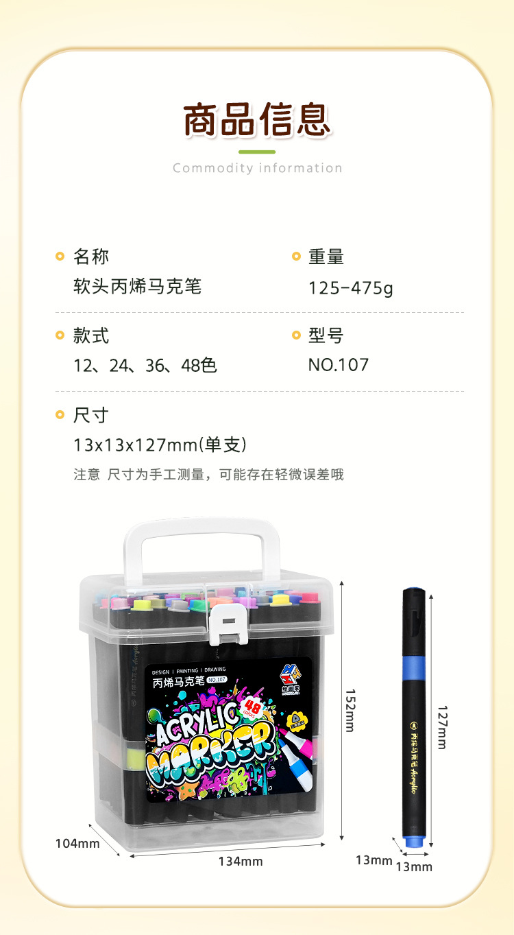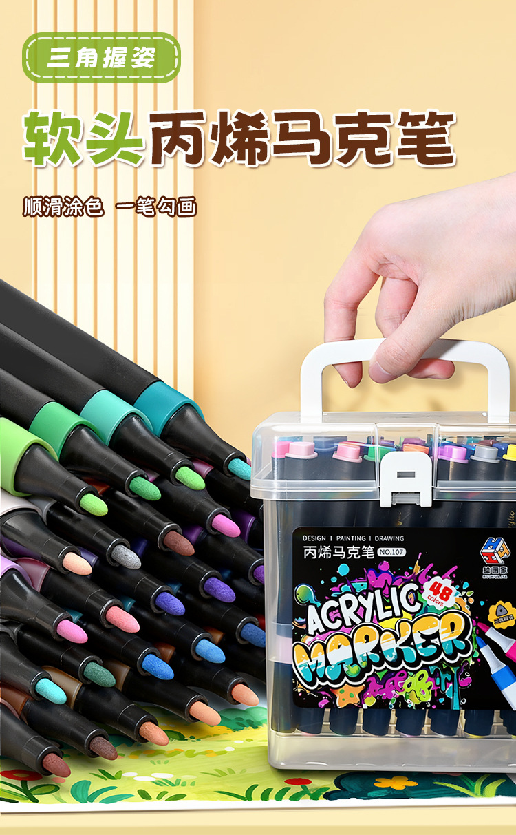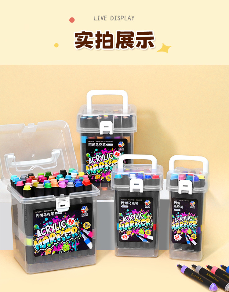 | Especificaciones | Marcador de acrílico de cabeza blanda 12 colores, marcador de acrílico de cabeza blanda 24 colores, marcador de acrílico de cabeza blanda 36 colores, marcador de acrílico de cabeza blanda 48 colores |