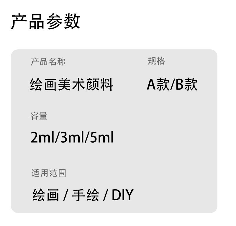 | Color | 2 ml 12 colores + 2 pinceles con envase 3 ml 12 colores + 2 pinceles con envase 5 ml 12 colores + 2 pinceles con envase |