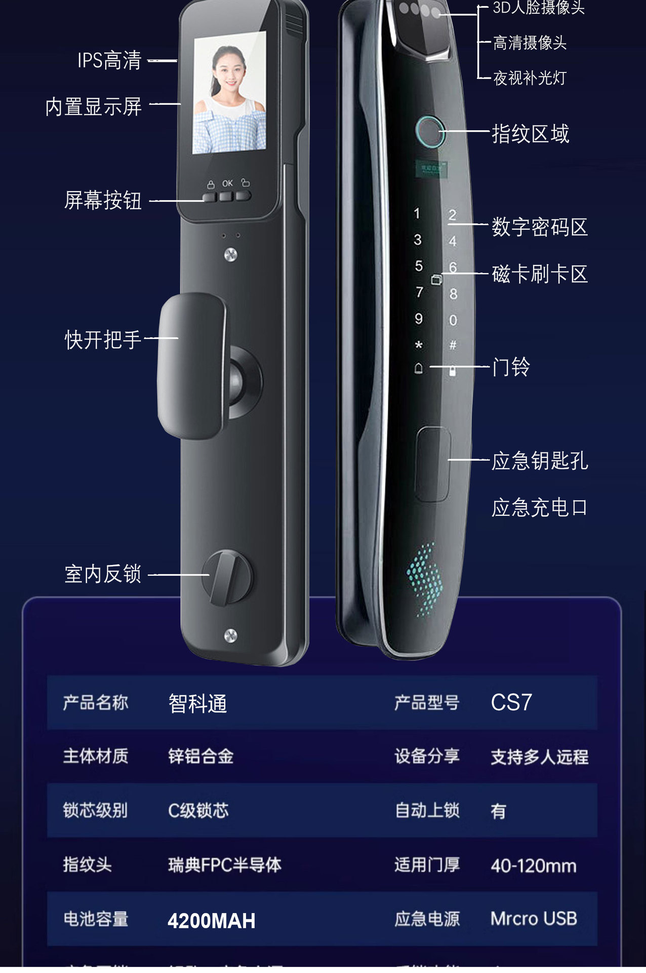 Modelo de intercomunicador cs7 (cara + monitoreo de intercomunicador remoto + apertura remota wifi + huella digital + contraseña + tarjeta de puerta + llave + contraseña temporal)