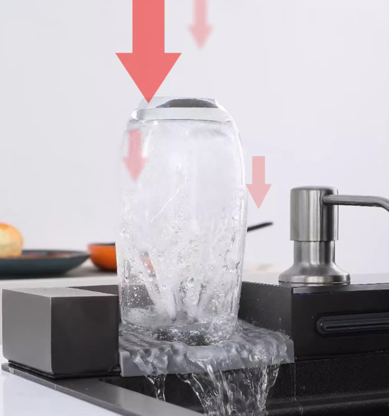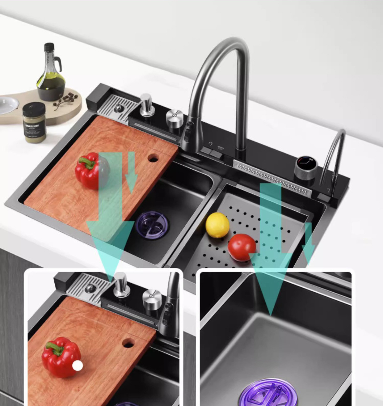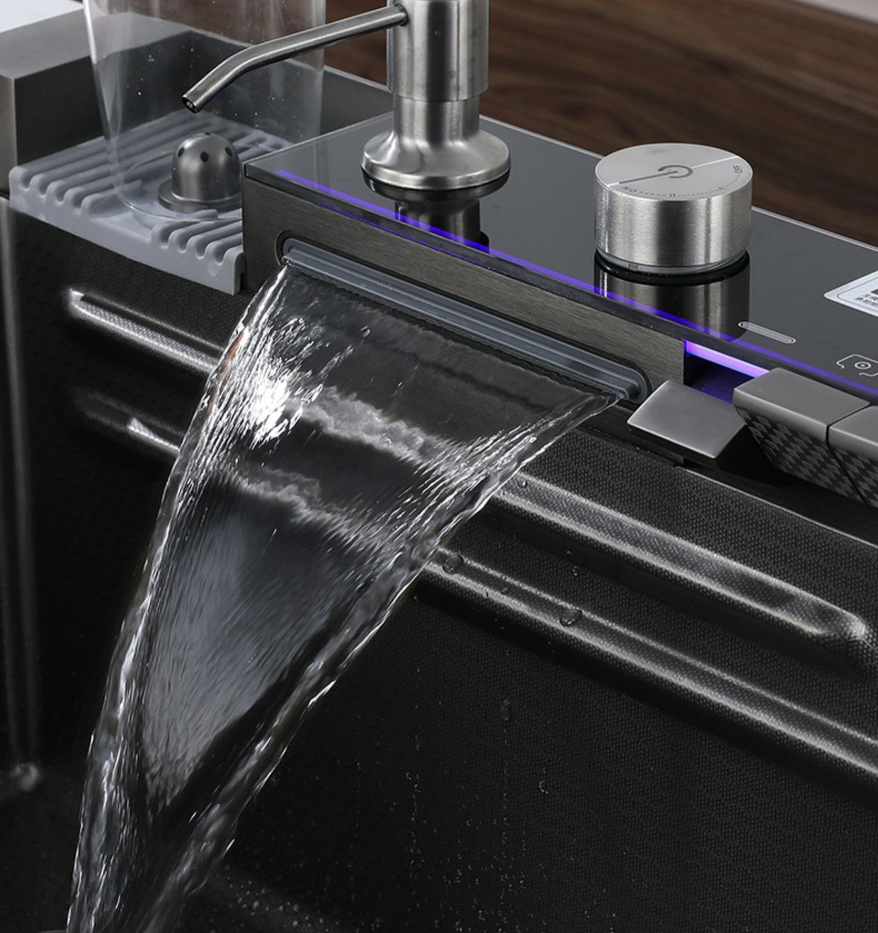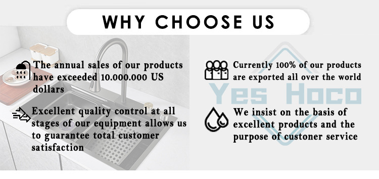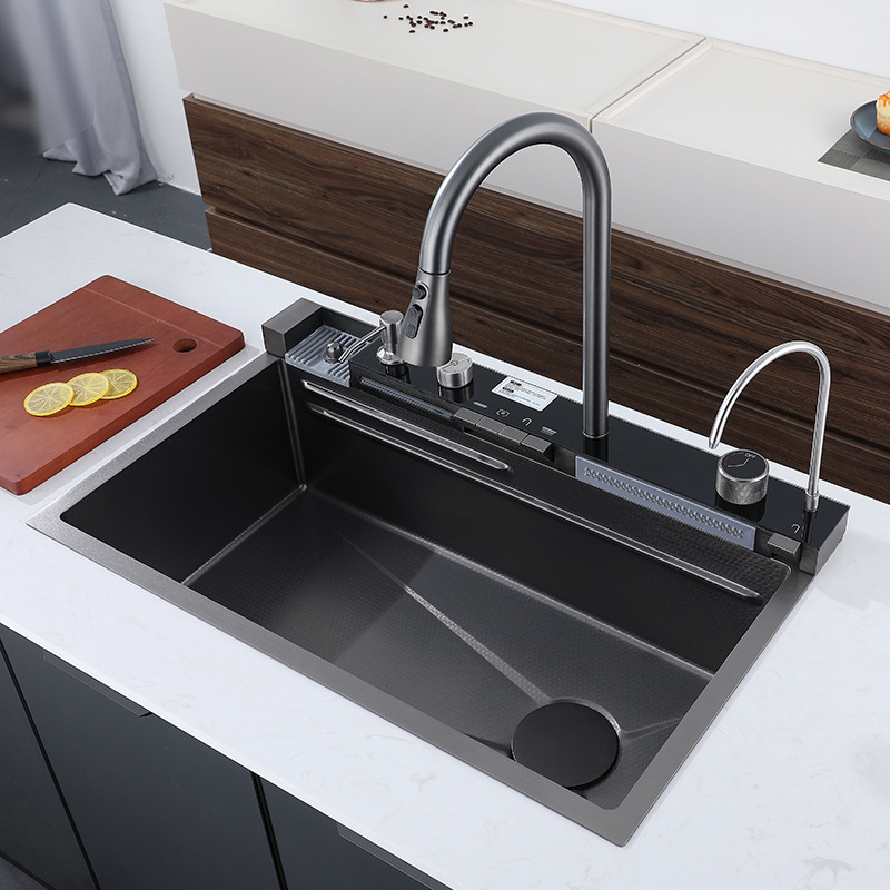 Venta directa de fábrica, fregadero de cocina moderno de una sola ranura, multifuncional, de acero inoxidable negro cepillado, con diseño de cascada inteligente