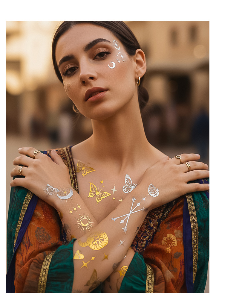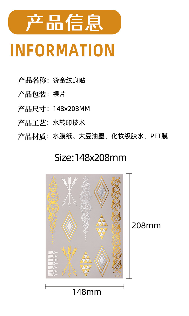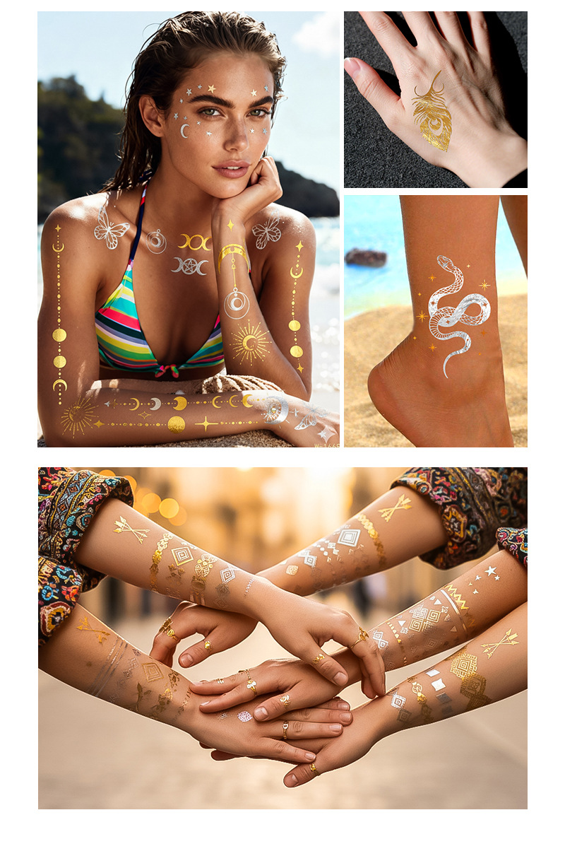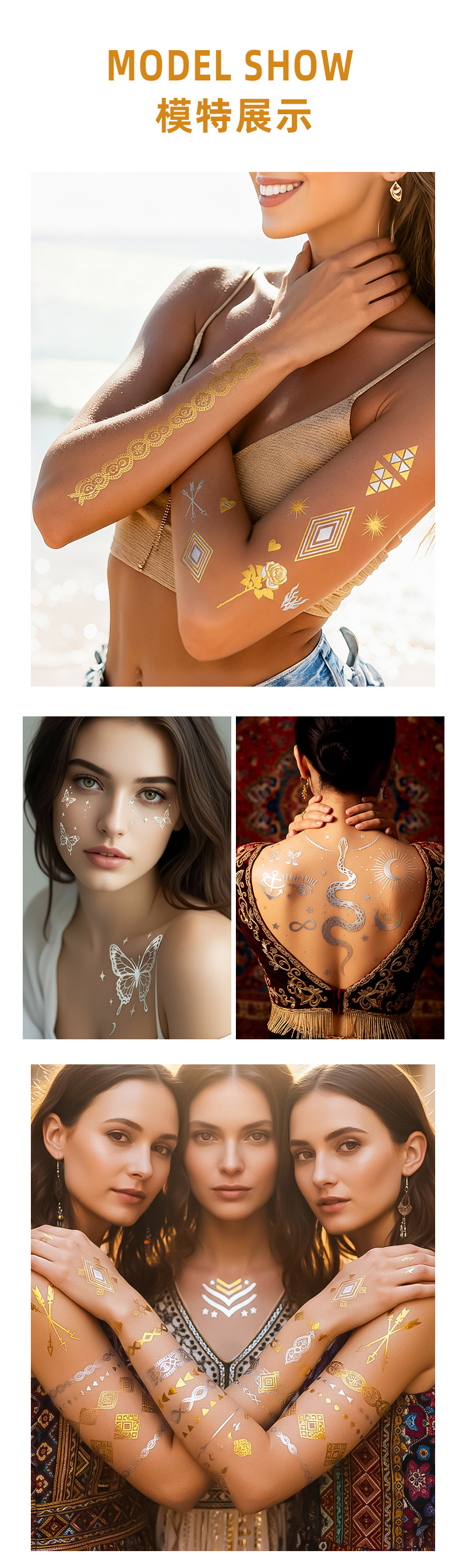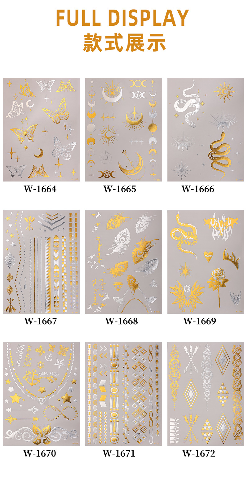 Pegatinas de tatuaje de estampado transfronterizo impermeable Europa y América plata estampado metal estampado tatuaje flash pegatinas de tatuaje desechables temporales personalizadas