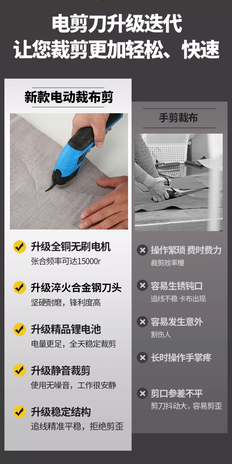 | Especificaciones | Tijeras de corte de tela rojas con batería de litio recargable y 1 hoja.,Tijeras de corte de tela azul con batería de litio recargable y 1 hoja. |