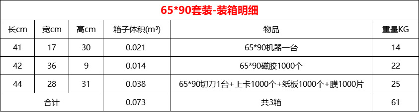 | Colores | 50*50 máquina de imán de nevera (9kg),Cuchillo de corte 50*50 (7kg),50*50 material de imán de nevera 100 juegos (1,5 kg),100 juegos de consumibles de caucho magnético acrílico 50*50 (2kg),50*50mm de acrílico consumibles 100 juegos (1.1 kg),Juego 50*50: cortadora de máquina 1000 juegos de consumibles magnéticos de cartón (31kg),Juego 50*50: cortadora de máquina 1000 juegos de consumibles de caucho magnético acrílico (36kg),Juego 50*50: cortadora de máquina 1000 juegos de consumibles de alfiler acrílico (29kg),63.5*63.5MM máquina de imanes de nevera (con molde)(11kg),Cortador de metal 63.5*63.5MM (8kg),Cortador plano de 63,5*63,5 MM,63,5*63,5mm frigorífico suministros 100 juegos (2,8 kg),63,5*63,5 100 juegos de consumibles de alfiler acrílico (2,3 kg),63.5*63.5MM Acrílico material de pegamento magnético 100 juegos (3.2kg),Juego 63.5*63.5: cortadora de máquina 1000 juegos de consumibles magnéticos de cartón (47kg),Juego 63.5*63.5: cortadora de máquina 1000 juegos de consumibles de caucho magnético acrílico (52kg),Juego 63.5*63.5: cortadora de máquina 1000 juegos de consumibles de alfiler acrílico (44kg),Juego de 63.5*63.5: máquina + cortador plano + 1000 juegos de cartón + consumibles de pegamento magnético.,Juego de 63.5*63.5: máquina + cortador plano + 1000 juegos de acrílico + consumibles de pegamento magnético.,Juego de 63.5*63.5: máquina + cortador plano + 1000 juegos de acrílico + consumibles de pines.,Máquina de imanes para refrigerador de 53*80MM (incluido el molde) (12kg),Cortador de metal rectangular de 53*80MM (9kg),Consumibles para imanes de nevera de 53*80 - Cartón, pegamento magnético tipo 100 juegos (2.8kg),Consumibles para imanes de nevera 53*80 - Pegamento magnético acrílico, 100 juegos (3.1kg),Suministros de imanes para refrigerador 53*80, estilo pin acrílico, 100 juegos (2,5 kg),Set 1: Máquina 53*80 + cortador + 1000 juegos de consumibles (versión cartón),Kit 2: Máquina 53*80 + Cortador + 1000 Juegos de Consumibles (Versión Acrílica),Kit 3: Máquina 53*80 + Cortador + 1000 Juegos de Consumibles (Estilo Pin Acrílico),Máquina de imanes para refrigerador de 65*90MM (14kg),Cortadora de papel metálica de 65*90MM (10kg),Suministros de imanes magnéticos para refrigerador de cartón de 65*90MM, 100 juegos (3,7 kg),Consumibles 65*90 - Pegamento magnético acrílico, 100 juegos (4.7kg),65*90 consumibles-acrílico estilo pin 100 juegos (3,7 kg),Conjunto 65*90: máquina + cortadora + 1000 juegos de consumibles (versión cartón) 61kg,Set 65*90: máquina + cortador + 1000 juegos de consumibles (modelo acrílico) 71kg,Juego 65*90: máquina + cortador + 1000 juegos de consumibles (tipo pin) 57kg,Máquina de imán de nevera 80*80 (16kg),Cuchillo de corte 80*80 (12kg),80*80 imanes de nevera consumibles 100 juegos (4,1 kg),Juego de 80*80: 1000 juegos de consumibles para cortadores de máquinas (69kg),Máquina de pegatinas para refrigerador 40*115 (pre-venta),Cortador 40*115 (pre-venta),Suministros de imanes para refrigerador 40*115, 100 juegos (Preventa) |