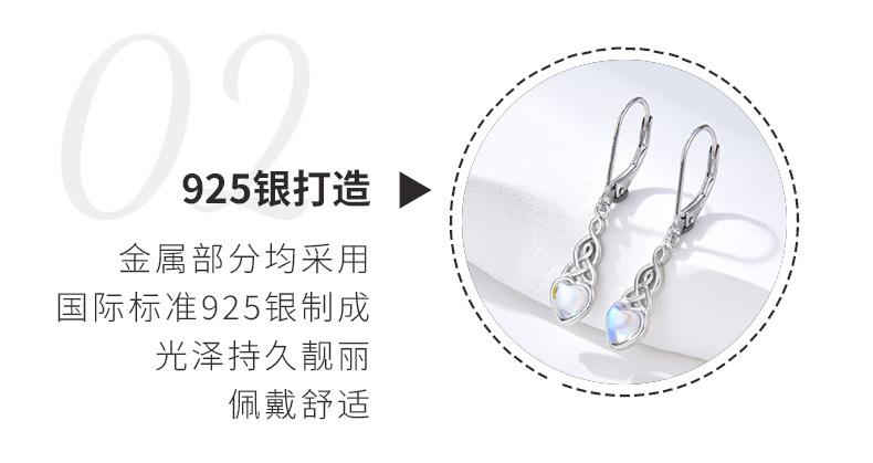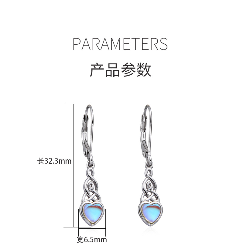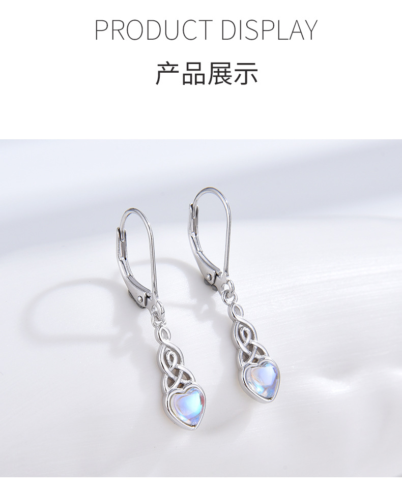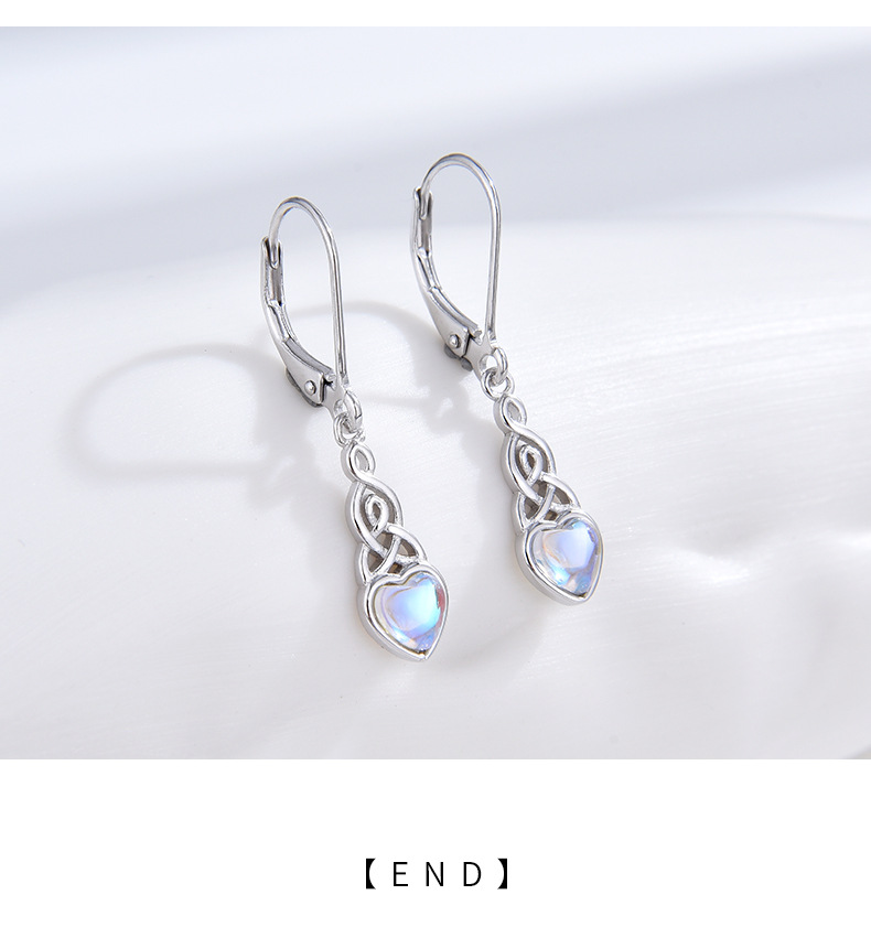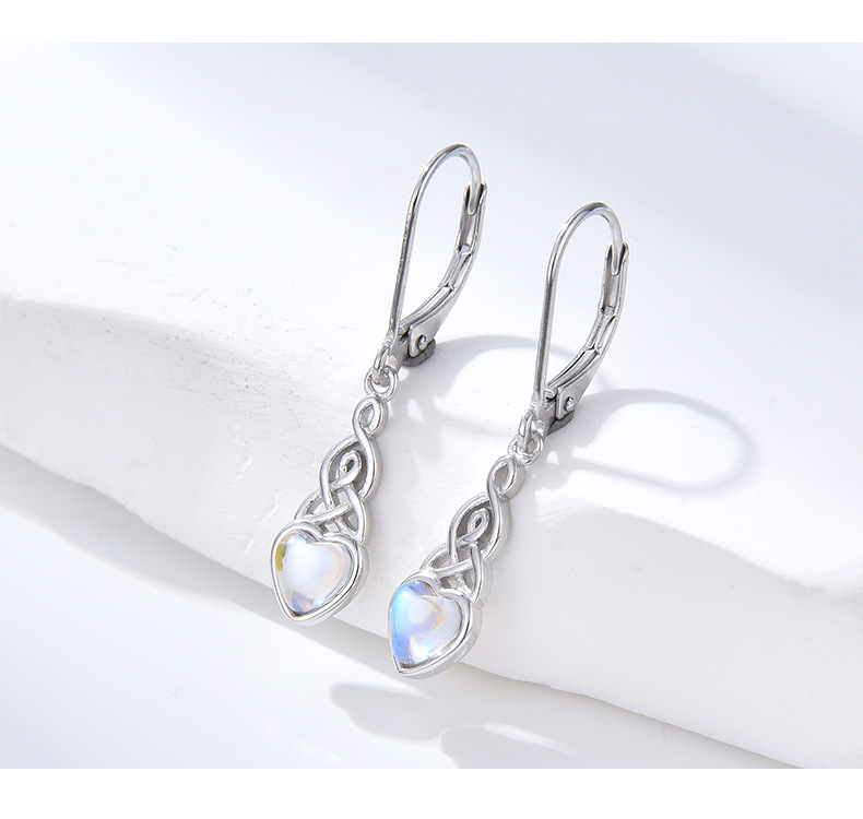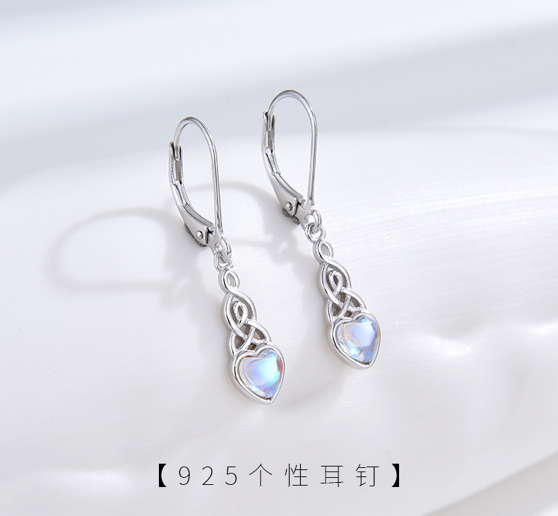 Pendientes en forma de corazón de plata S925 nuevos transfronterizos Pendientes de piedra lunar de nudo celta irlandés Pendientes simples de moda femenina