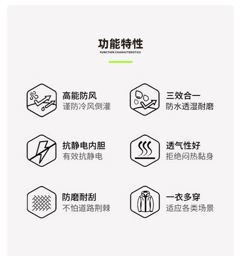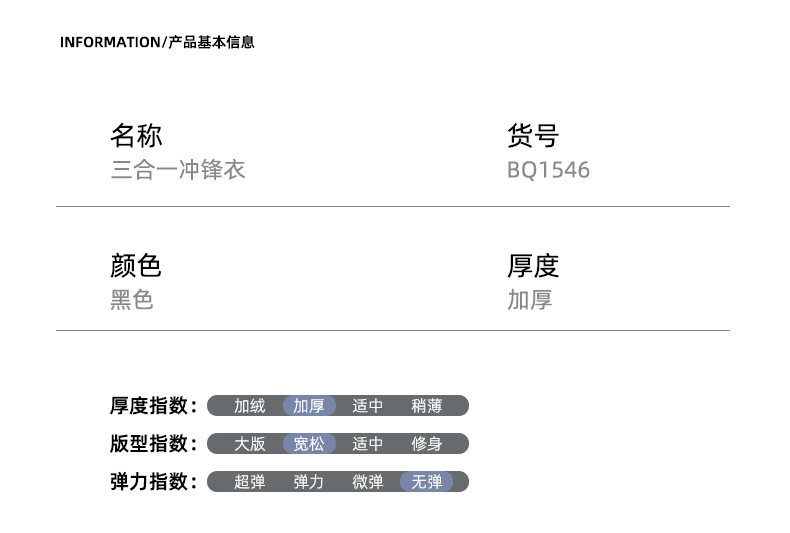 | Color | Primavera y otoño (una sola chaqueta), algodón (una sola chaqueta), chaqueta de asalto 3 - en - 1 (conjunto de dos piezas), algodón (3 - en - 1 con un conjunto de dos piezas), traje de asalto (forro de pluma), traje de asalto de algodón (forro de pluma) |