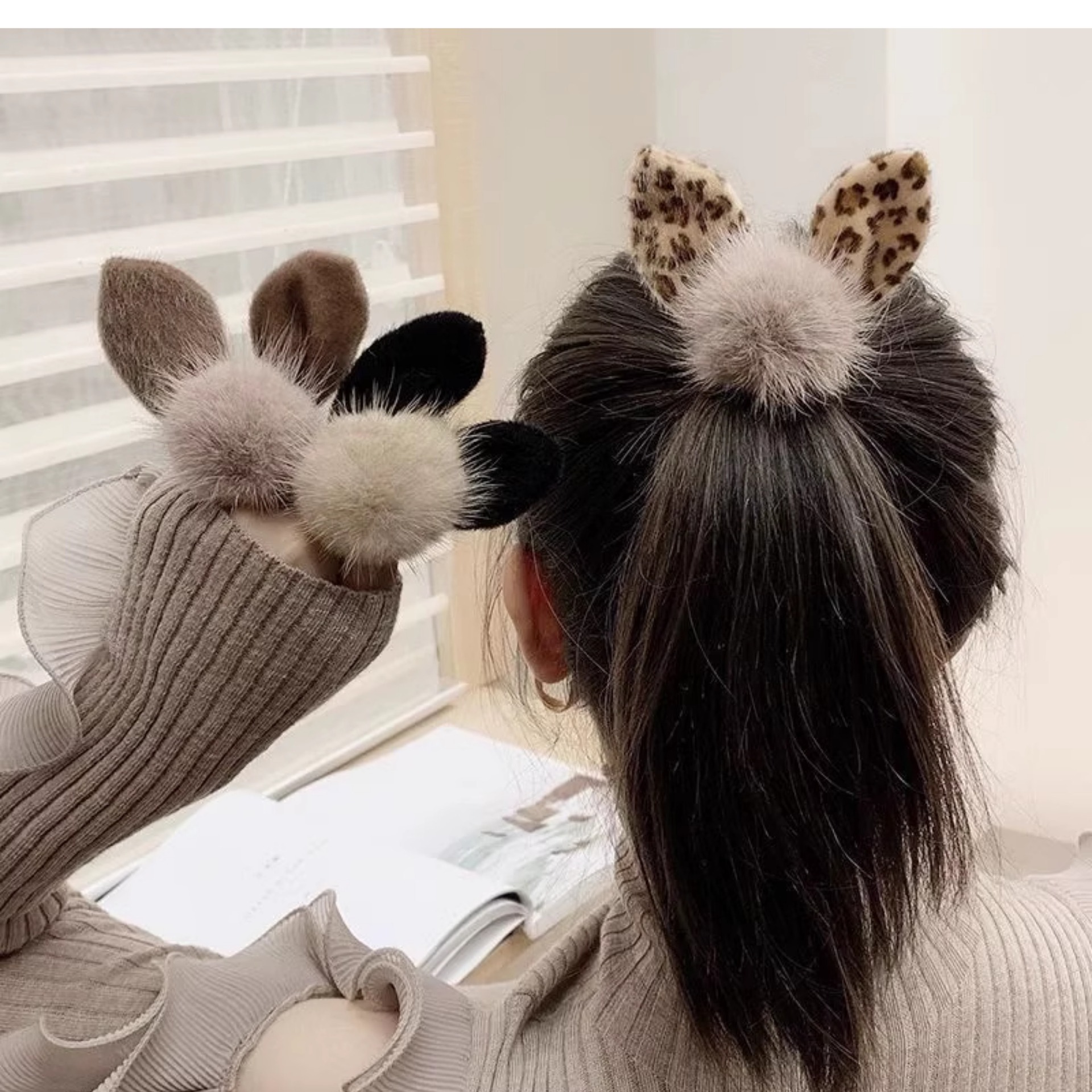 Nuevo estilo de cabello de pelo de cabello de pelo de orejas de cabello de cabello de correa de cola de caballo temperamento simple de alta elasticidad de invierno y otoño anillo de pelo de red cubierta de cuero roja