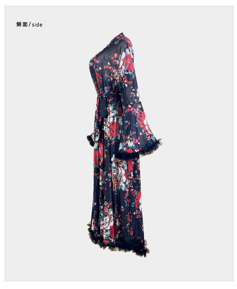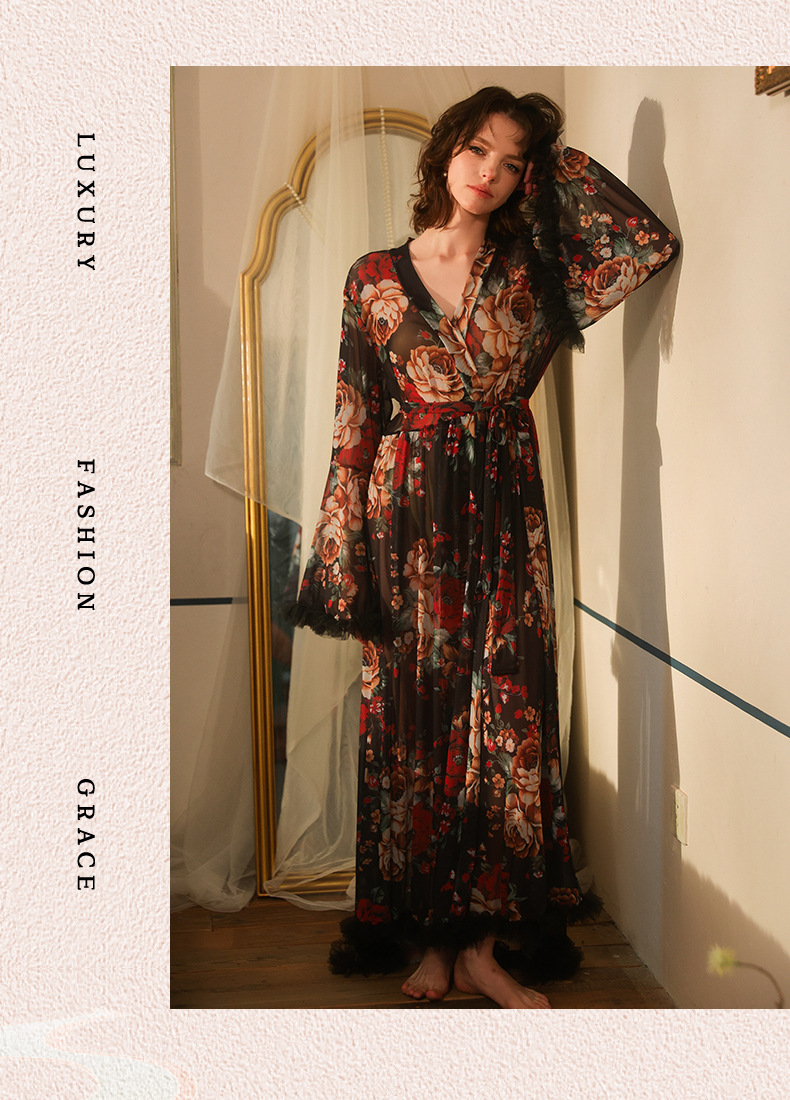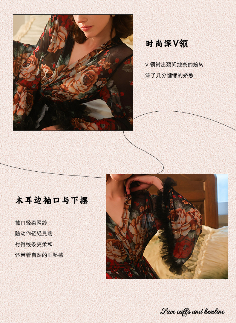 Atmosfera francesa retro floral a través de la ropa de dormir mangas largas de cuello en V bordes de lana decoración correa de cintura ropa de hogar 1119