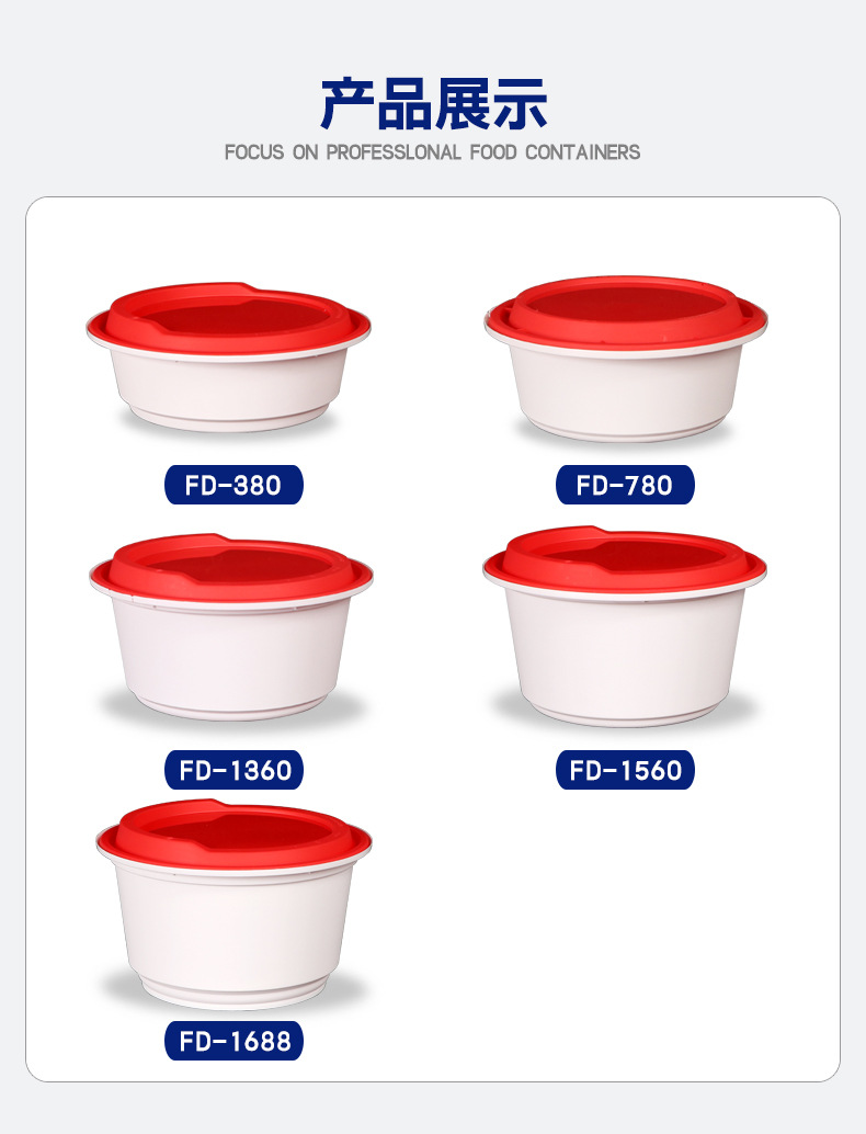 | Colores | Cubierta transparente de tazón blanco FD380 380ML(300 juegos),FD468 Tazón blanco Cubierta transparente 468ML(600 juegos),FD568 Tazón blanco Cubierta transparente 568ML(600 juegos),FD780 Tazón blanco Cubierta roja 780ML(300 juegos),FD1060 Tazón blanco Cubierta roja 1060ML(300 juegos),FD1360 Tazón blanco Tapa roja 1360ML(300 juegos),FD1560 Tazón blanco Cubierta roja 1560ML(300 juegos),FD1688 Tazón blanco Cubierta roja 1688ML(300 juegos) |