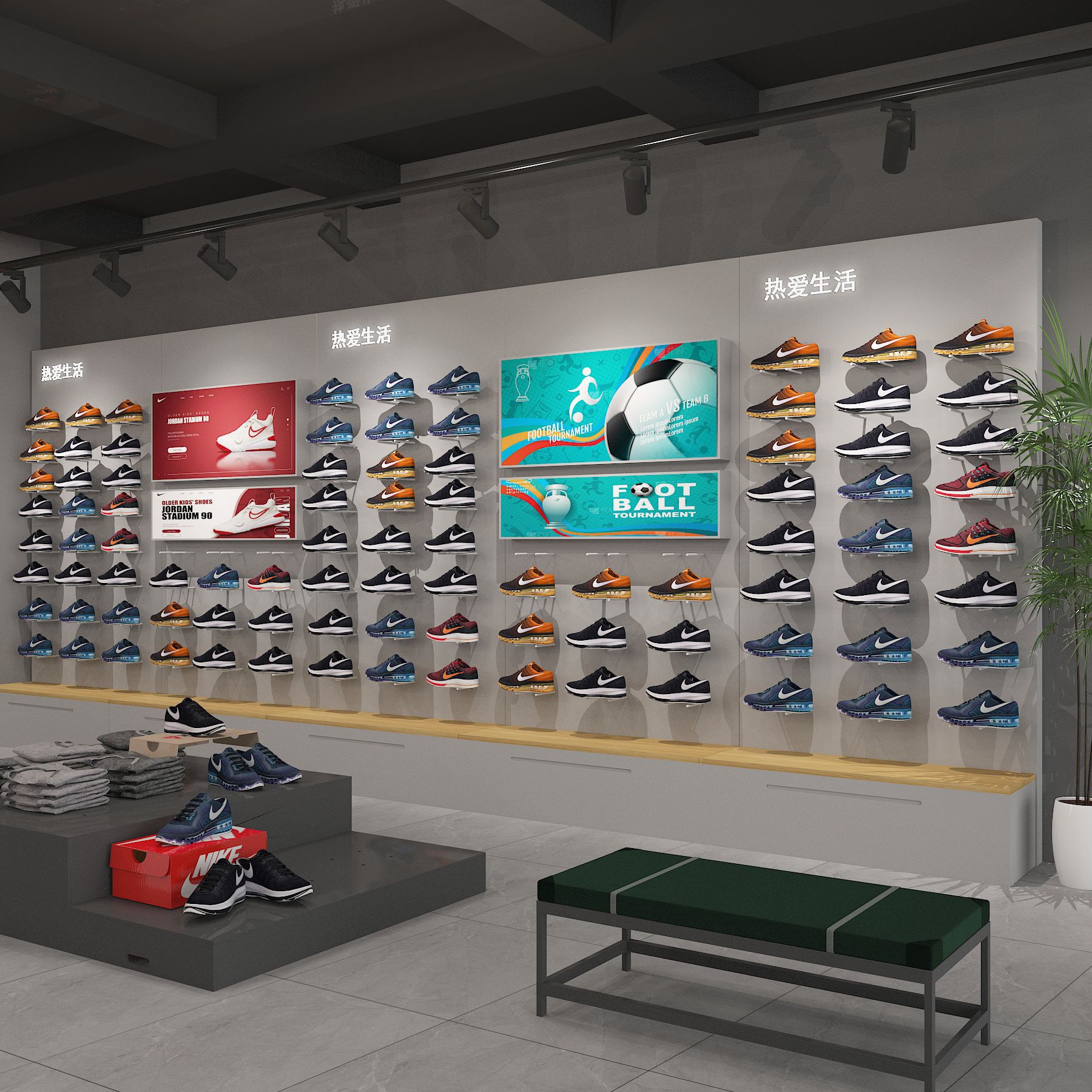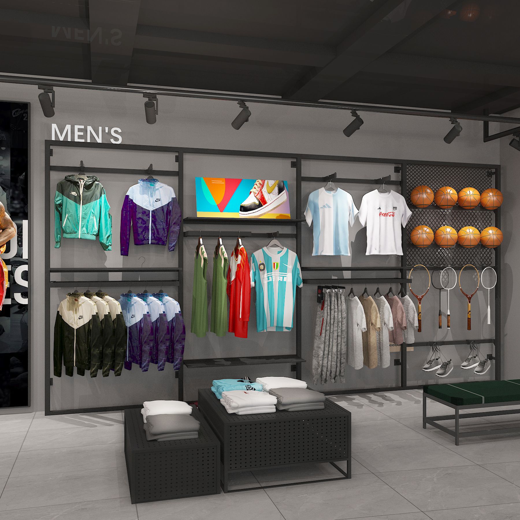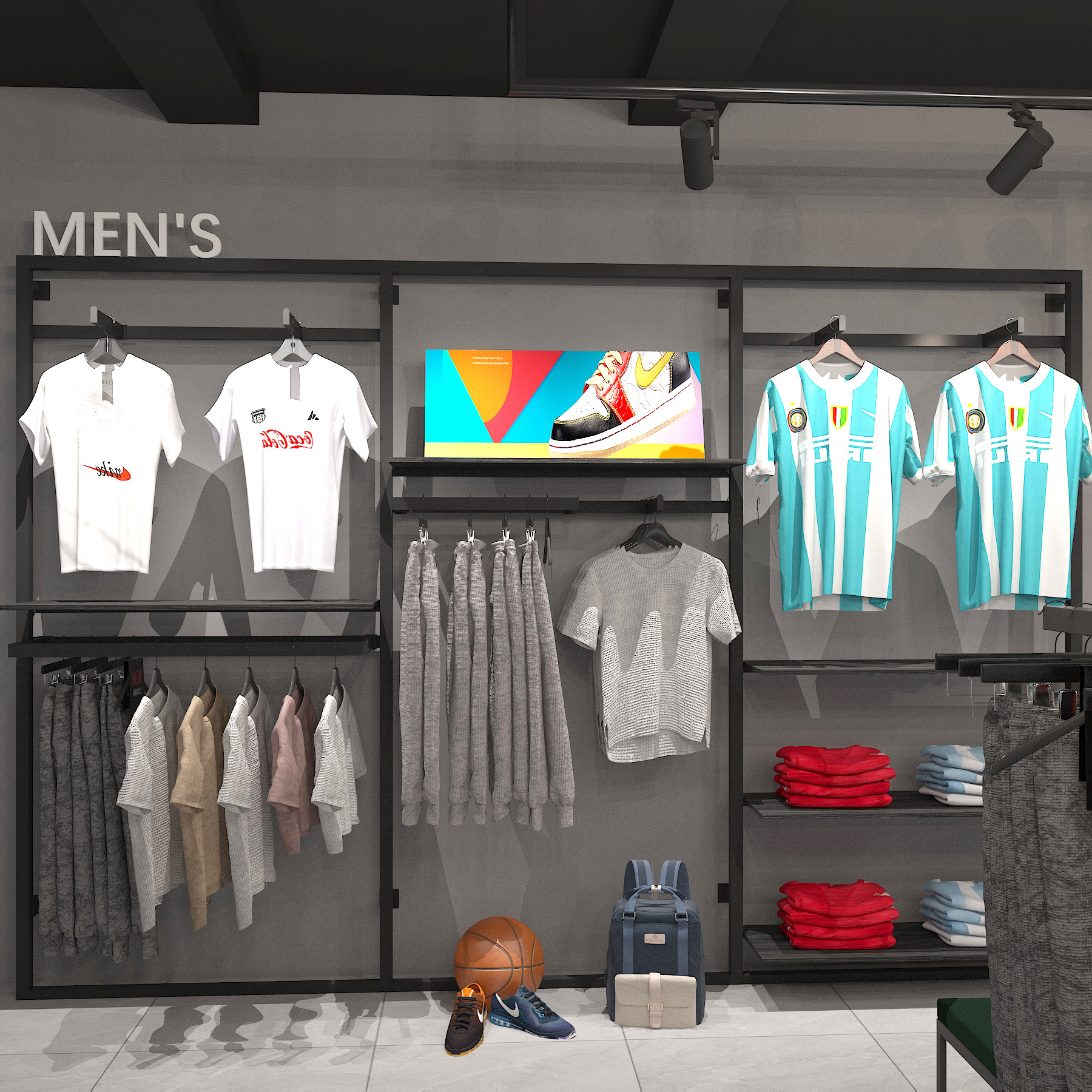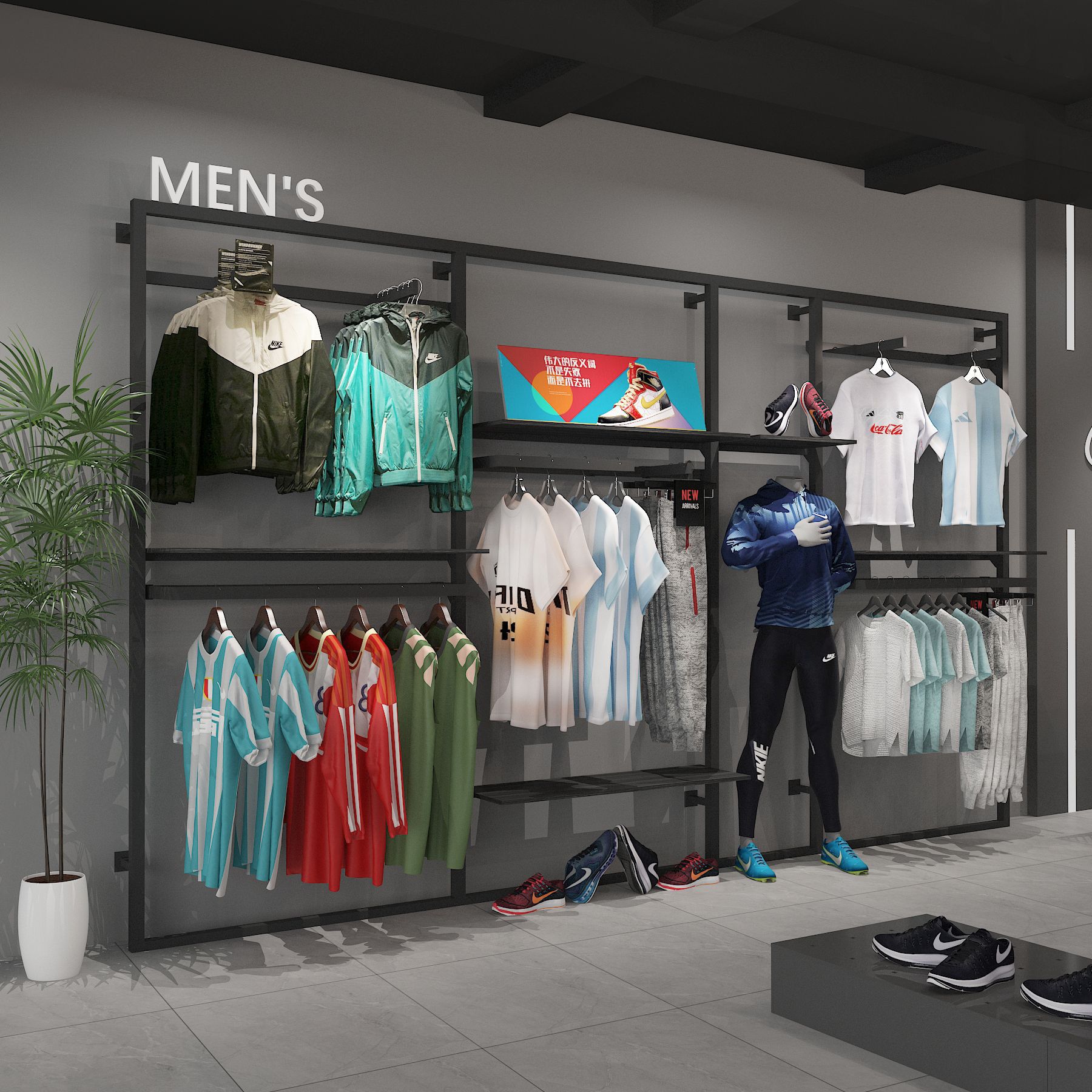 Estante de exhibición especial para tiendas de ropa deportiva y deportiva, estante de exhibición tipo piso para tiendas de ropa de hombre