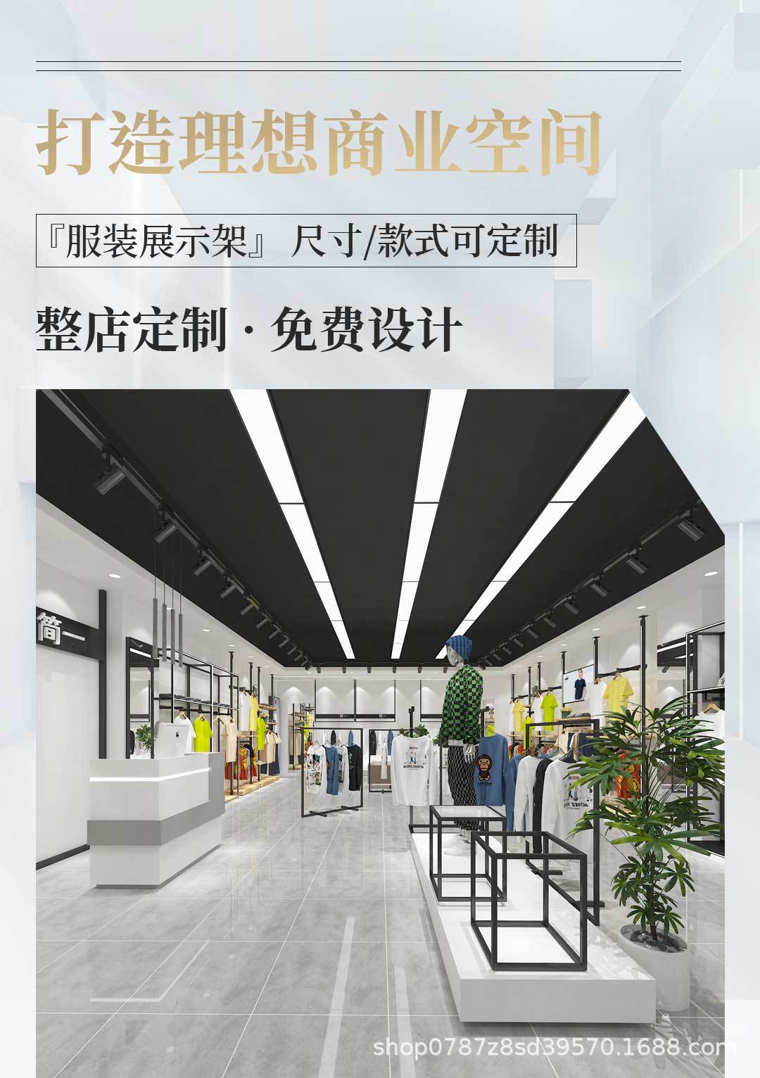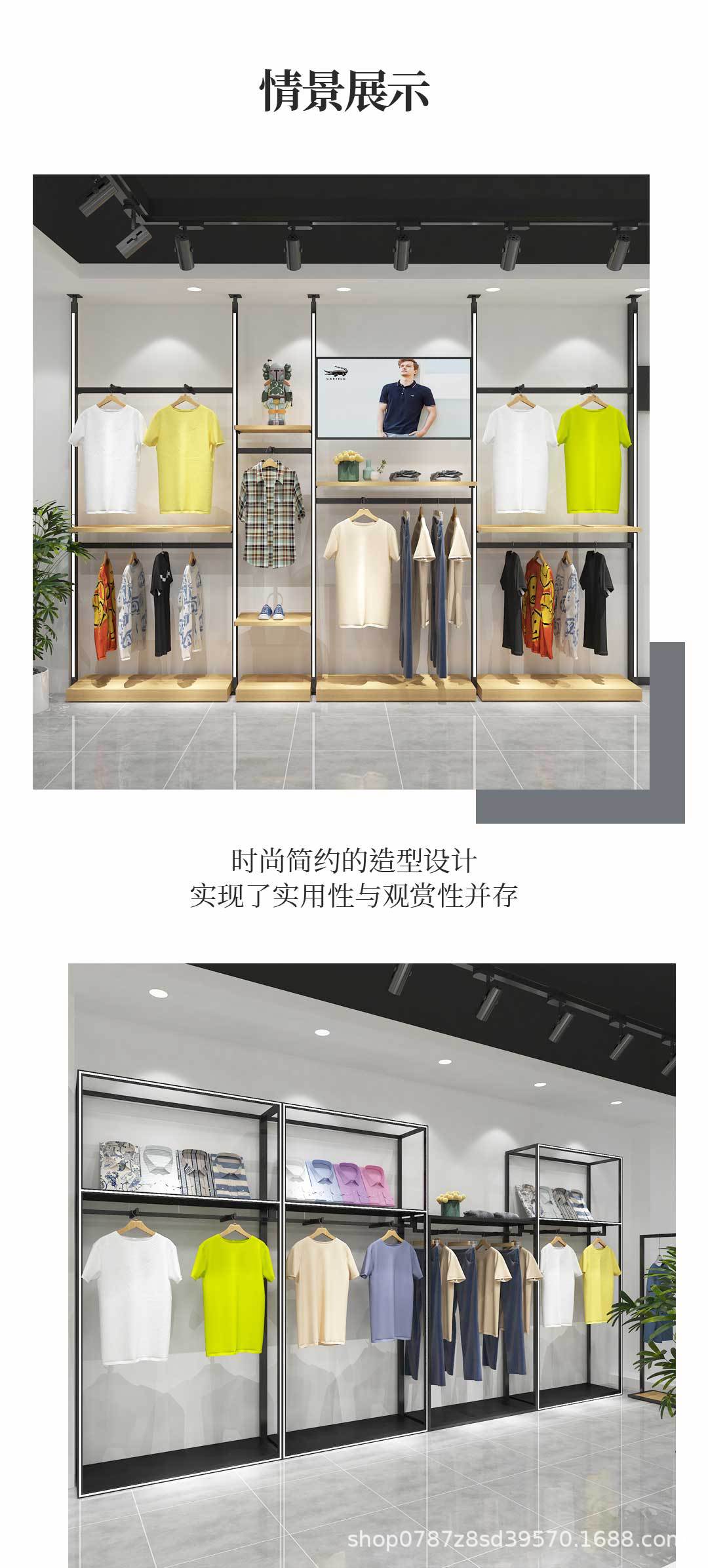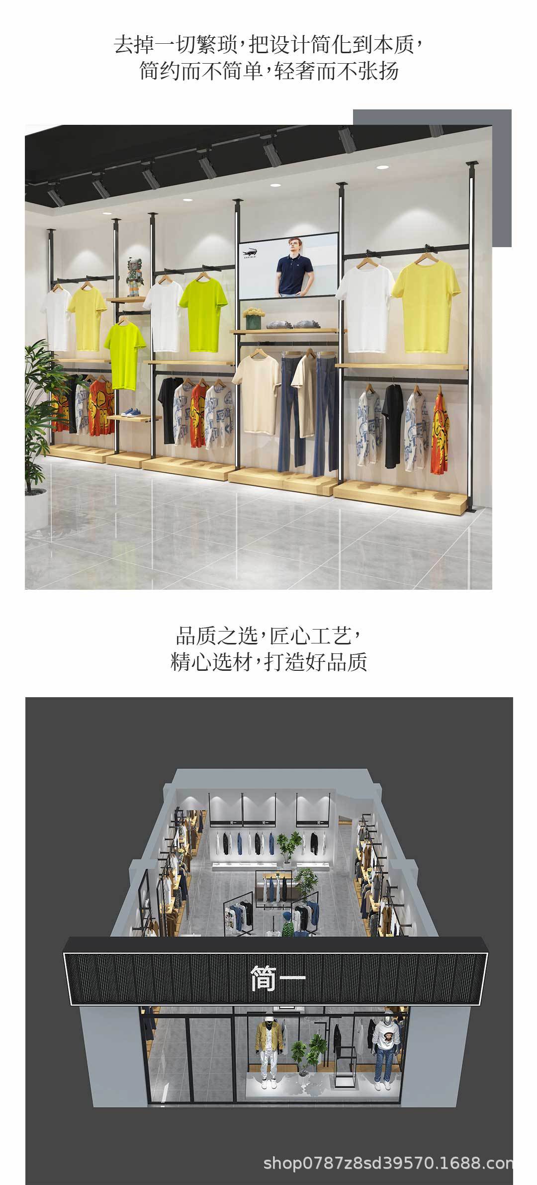 Estante de exhibición de la tienda de ropa para hombres con luces, perchas de la tienda de ropa, postes del cielo y la tierra, estantes de piso, estantes de exhibición en la pared