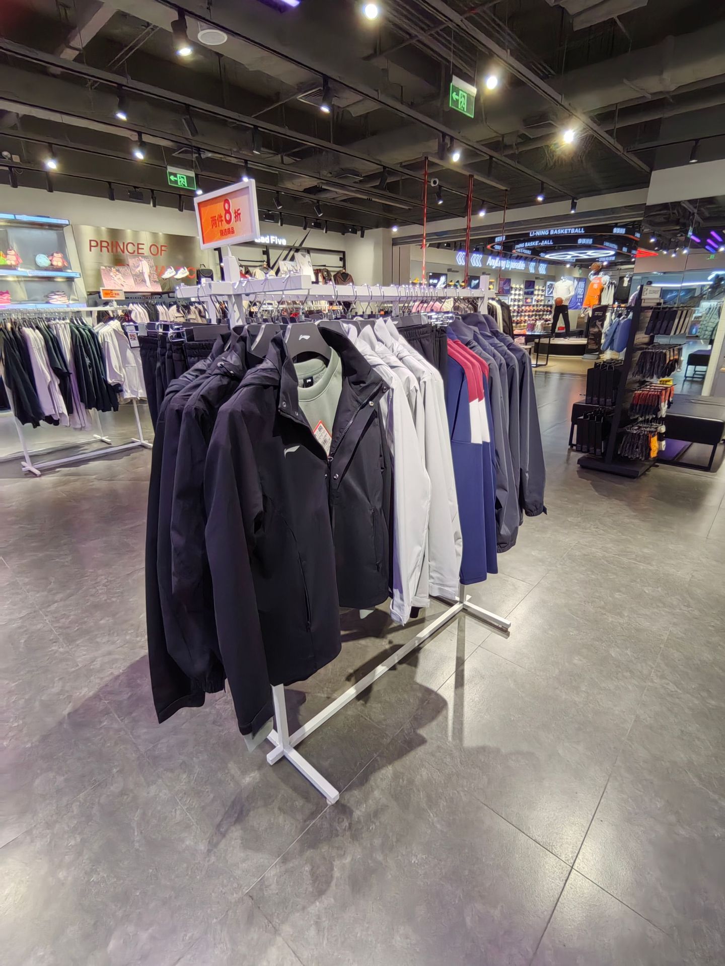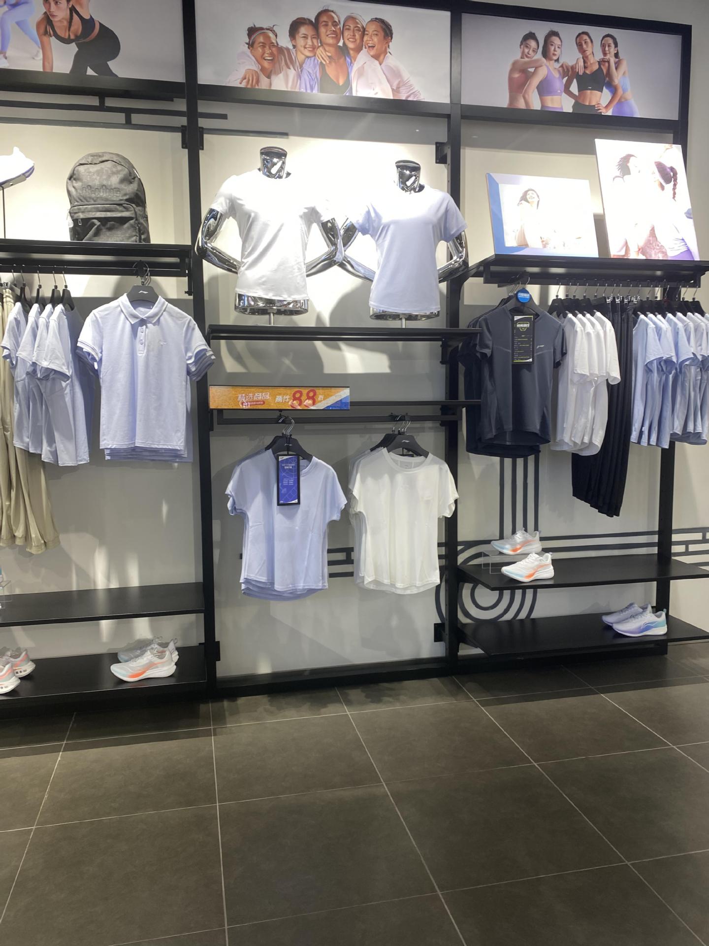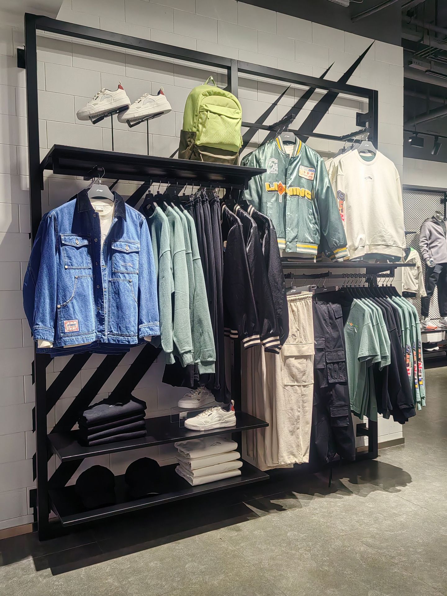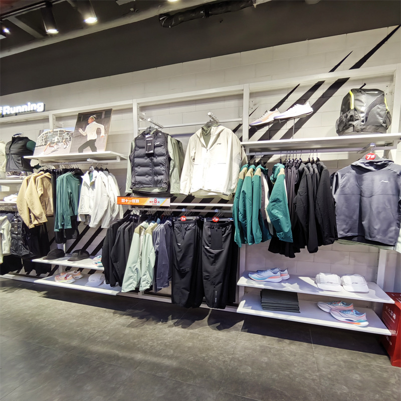 2025 nuevo estante de exhibición de tiendas de ropa deportiva estante de exhibición tienda de descuento centro comercial tipo piso de pared superior estante de doble capa