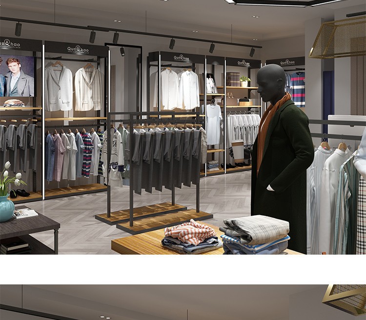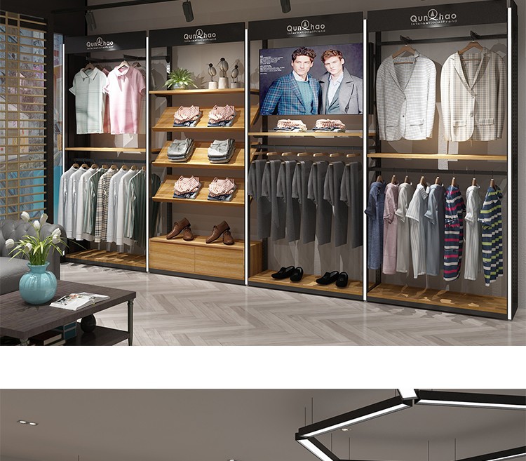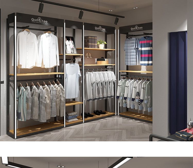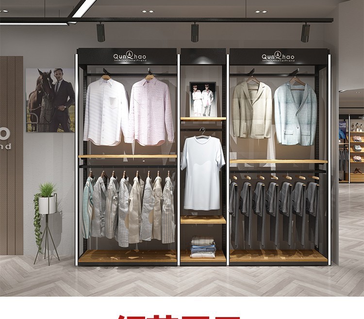 Tienda de ropa de ocio con luces estante de exhibición estante de exhibición tipo piso estante de exhibición comercial percha de ropa marca de moda hombre estante de tienda de ropa