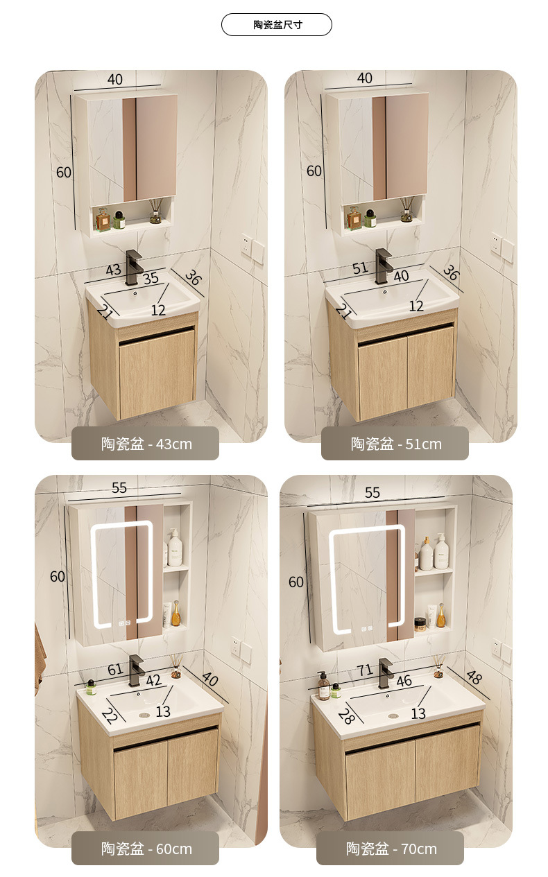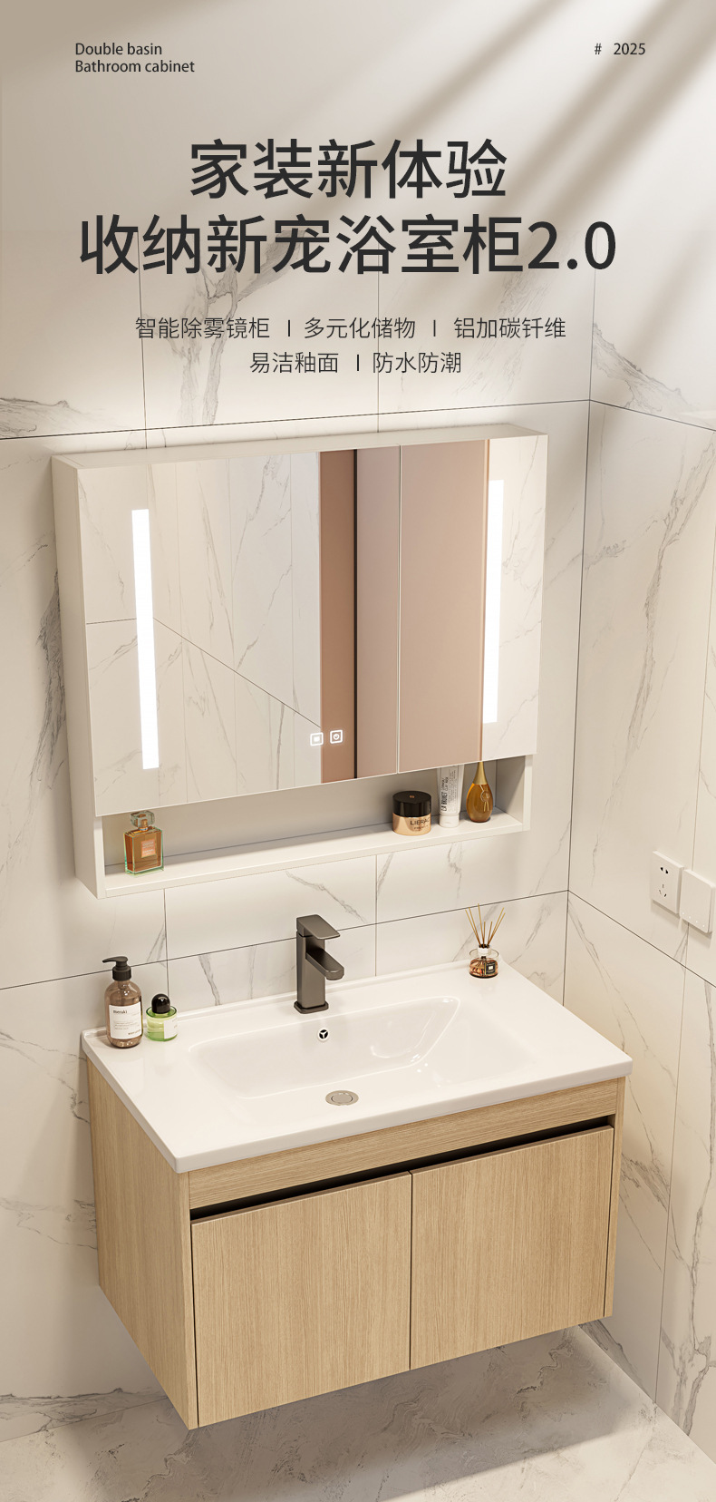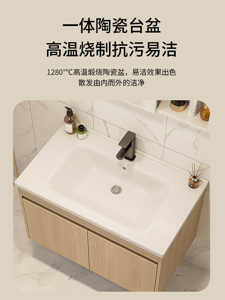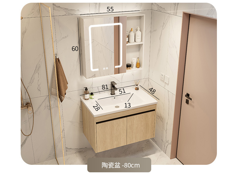 | Atributos | Gabinete de color de madera simple + cuenca de cerámica de alta temperatura + gabinete de lente de almacenamiento inteligente con luz anti-nebble |
