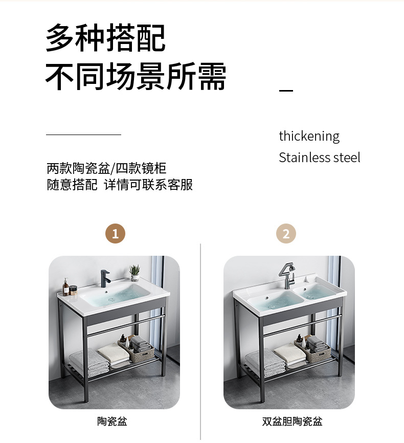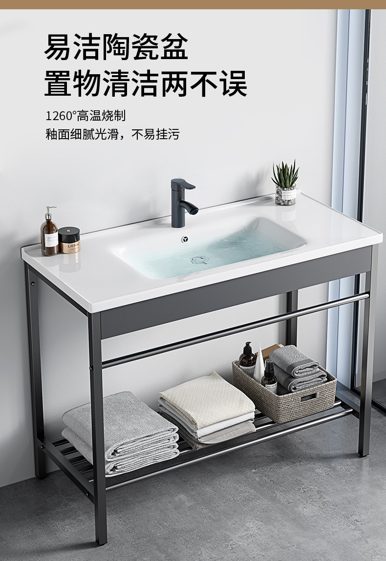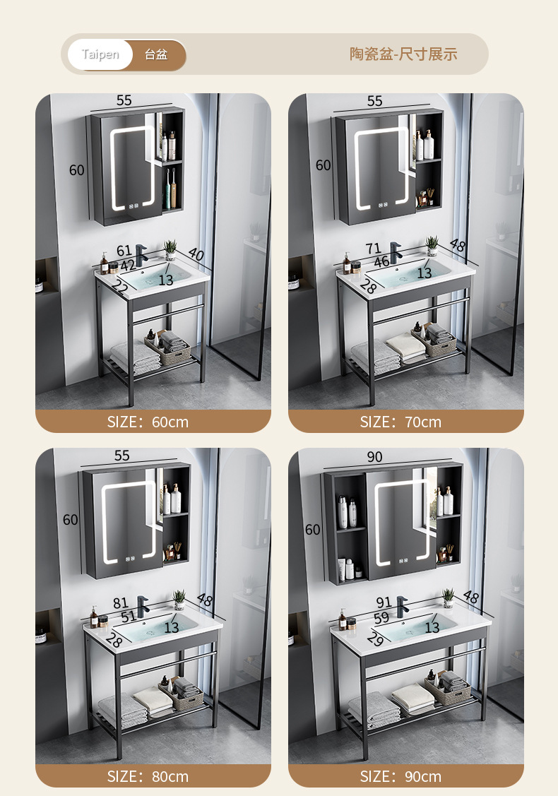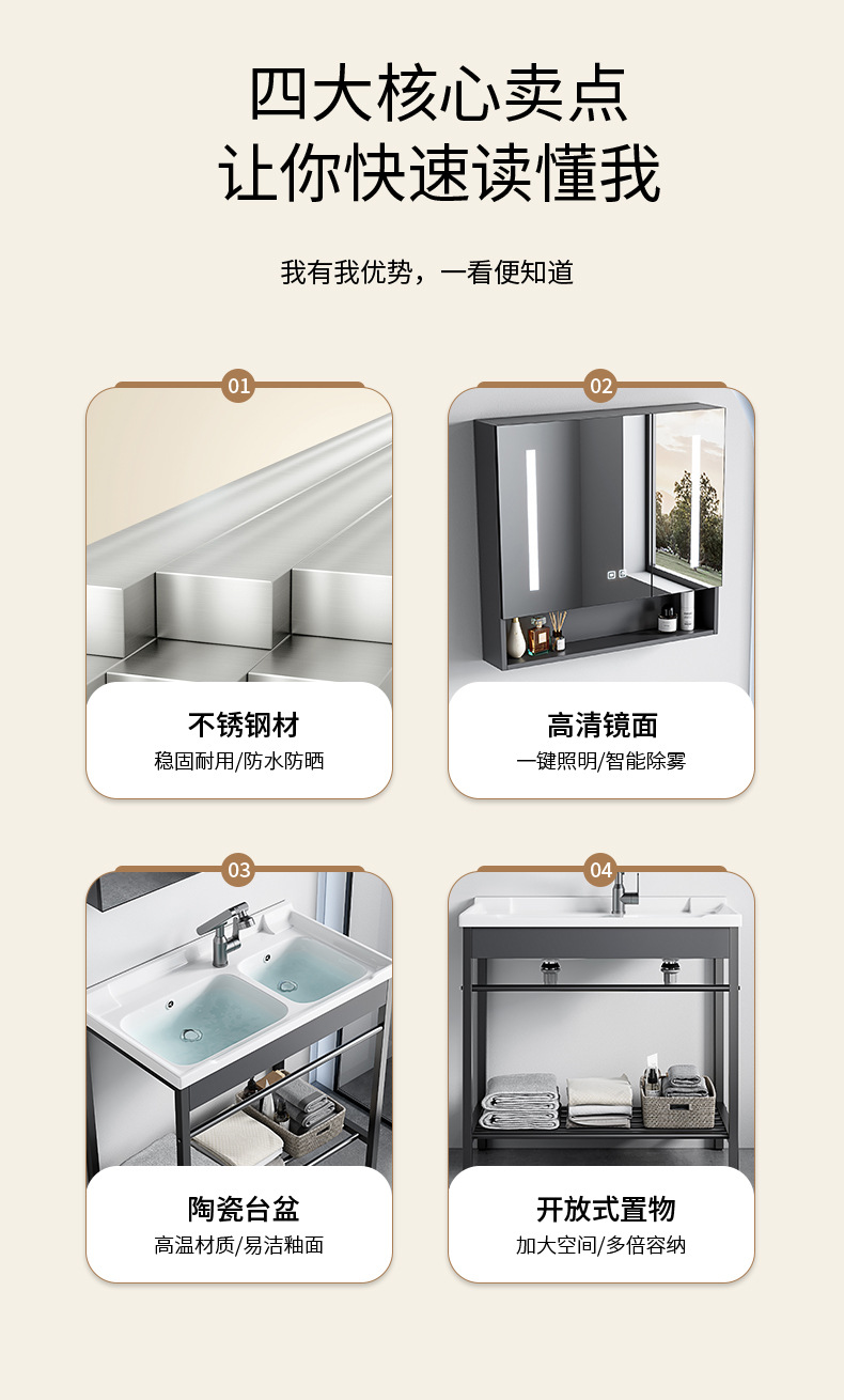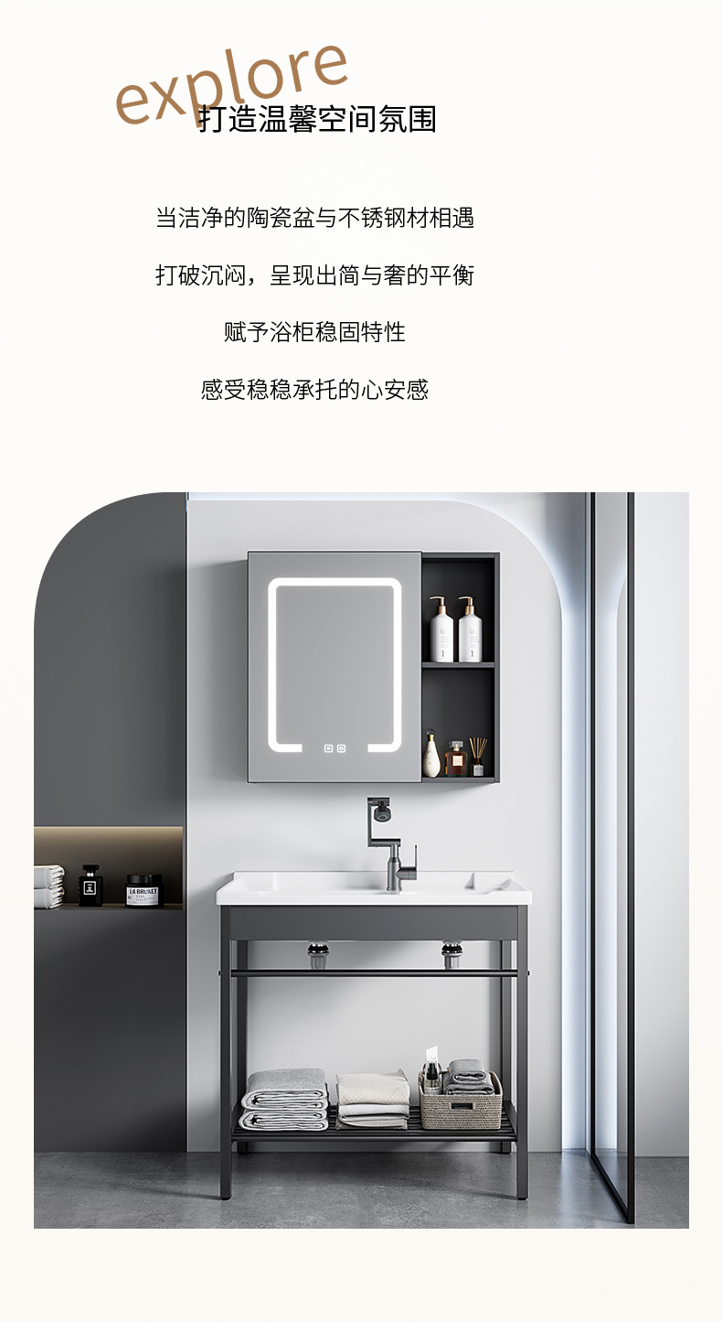 AtributosSoporte de acero inoxidable simple + cuenca de cerámica integrada + gabinete de espejo inteligente
