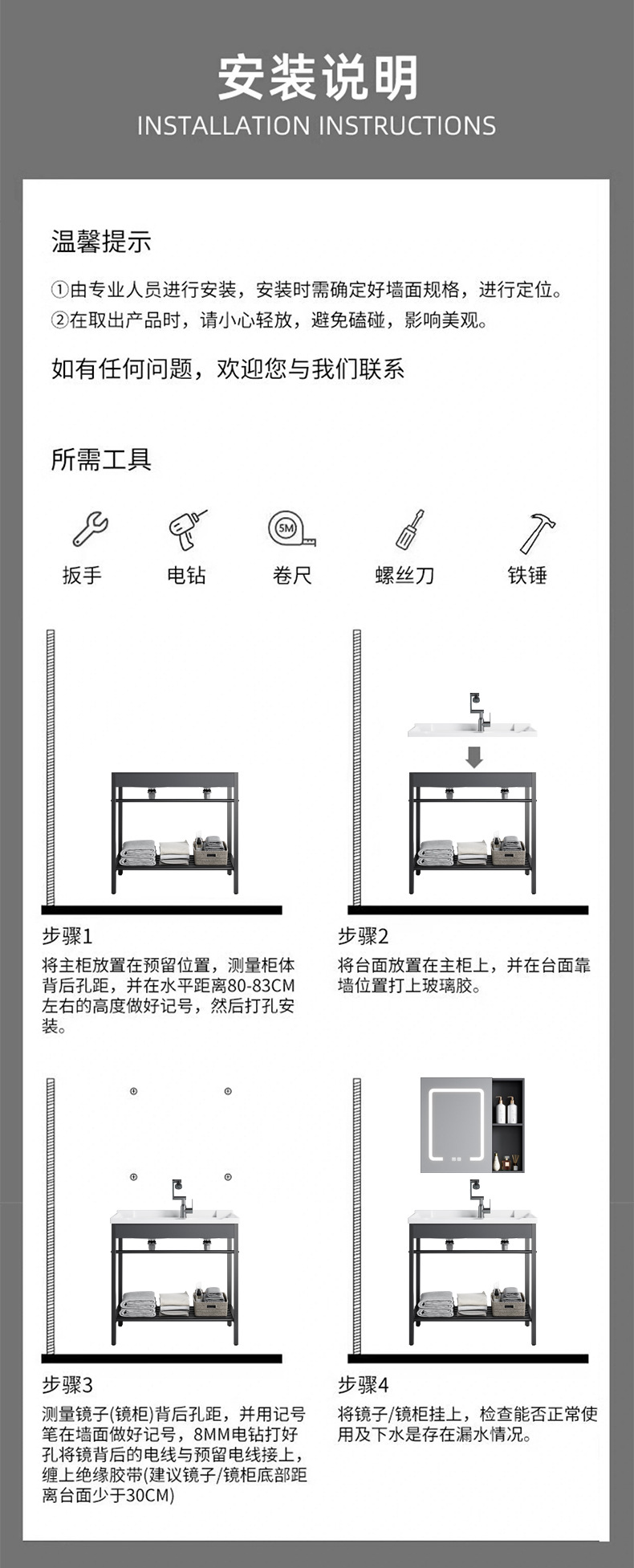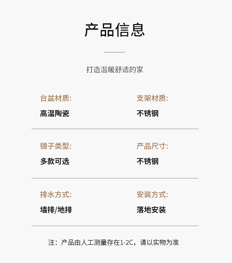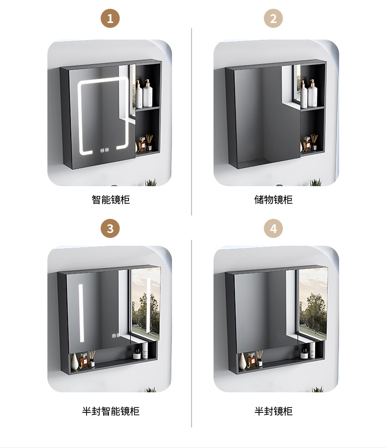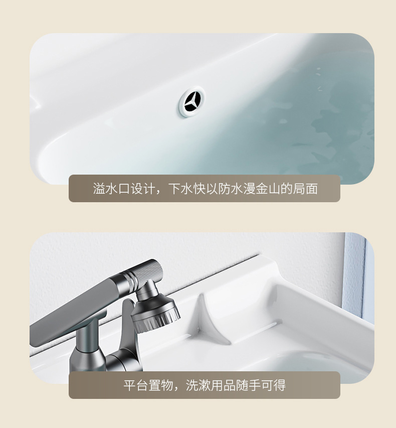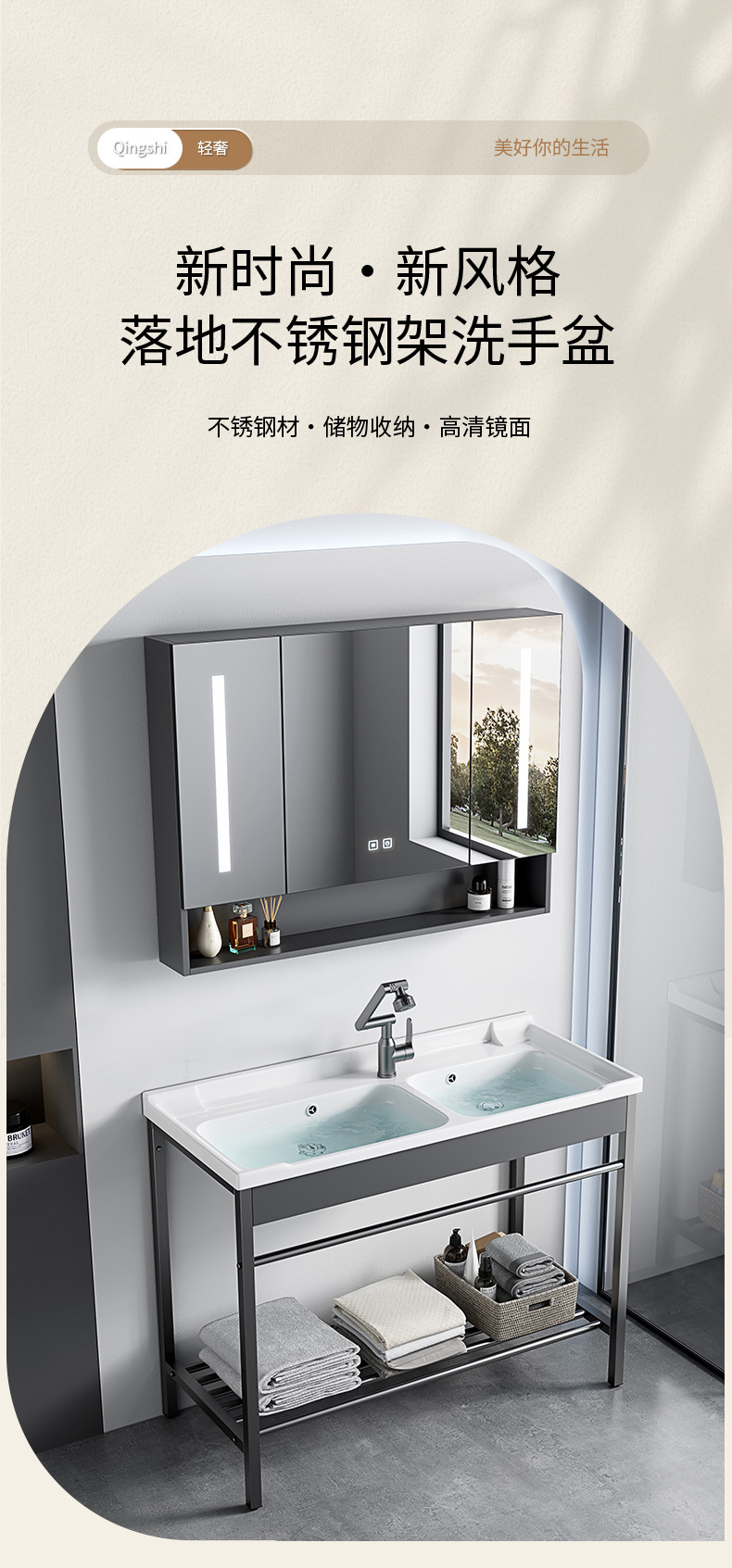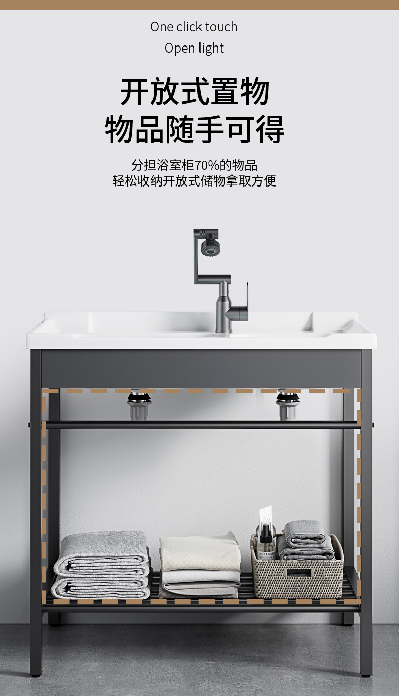 AtributosSoporte de acero inoxidable simple + cuenca de cerámica integrada + gabinete de espejo inteligente