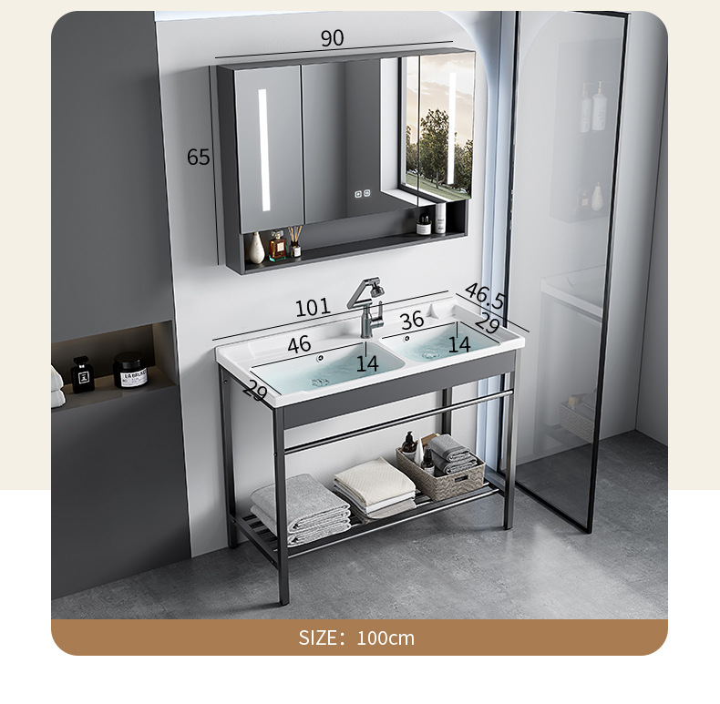 90 gabinete de doble cuenca de cerámica + gabinete de espejo medio sellado
