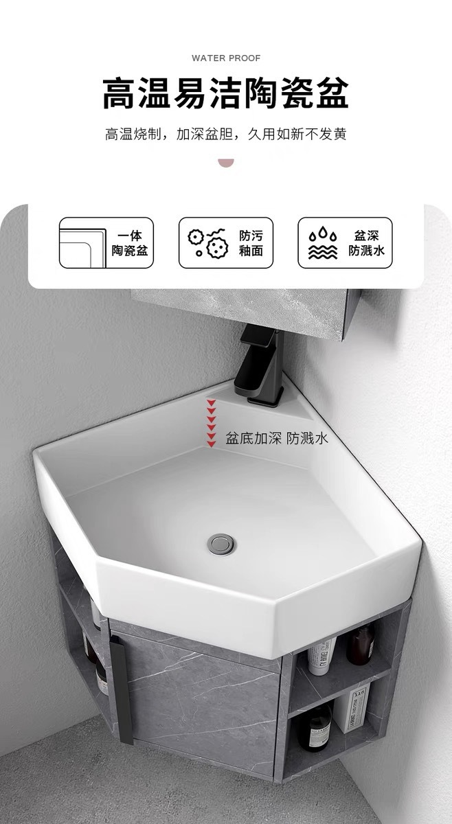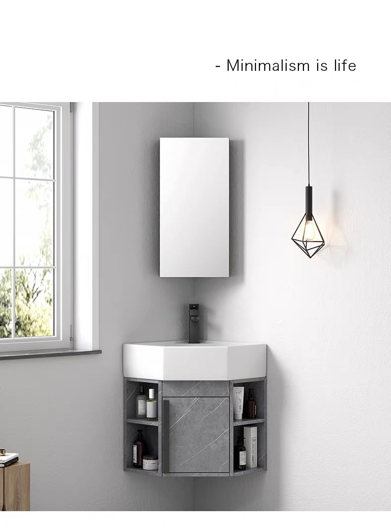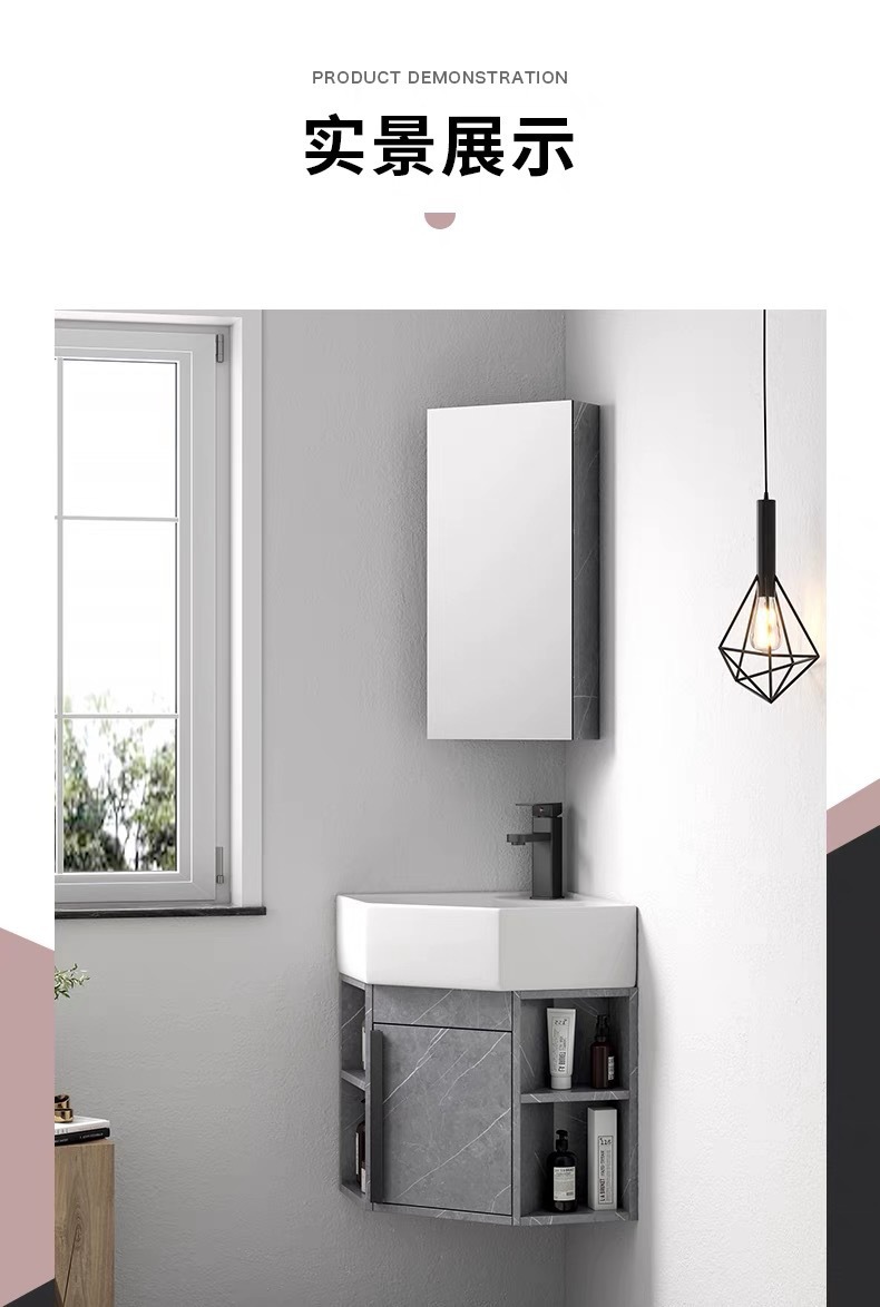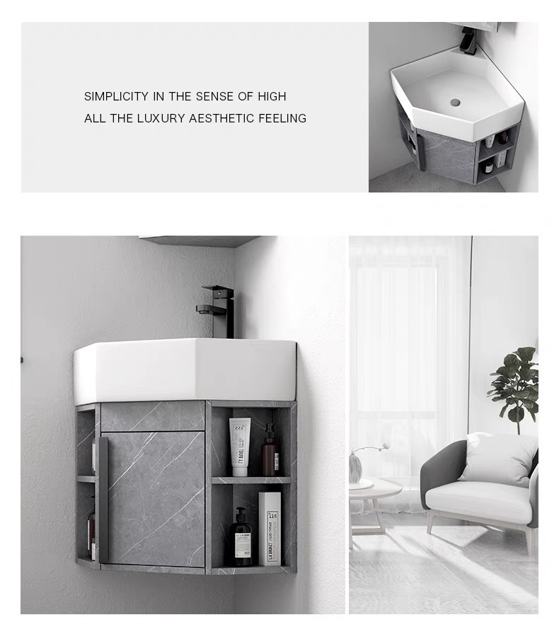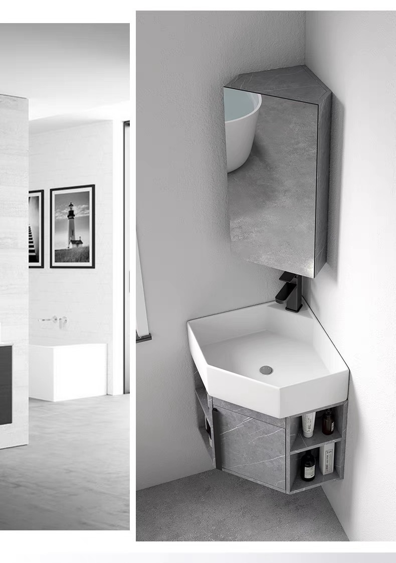 gabinete de lavabo triangular combinado tipo pequeño gabinete de baño de PVC esquina lavabo de pared esquina lavabo