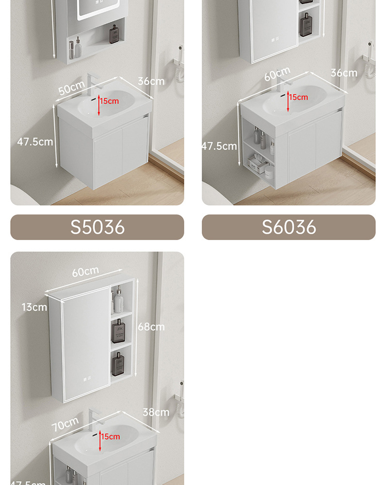 | Color | Gabinete principal S5036, Gabinete principal S5036 - Espejo redondo inteligente, Gabinete principal S5036 - Gabinete de lente de almacenamiento, Gabinete principal S5036 - Gabinete de espejo inteligente, S60 |