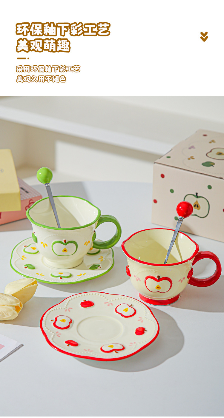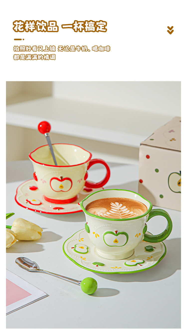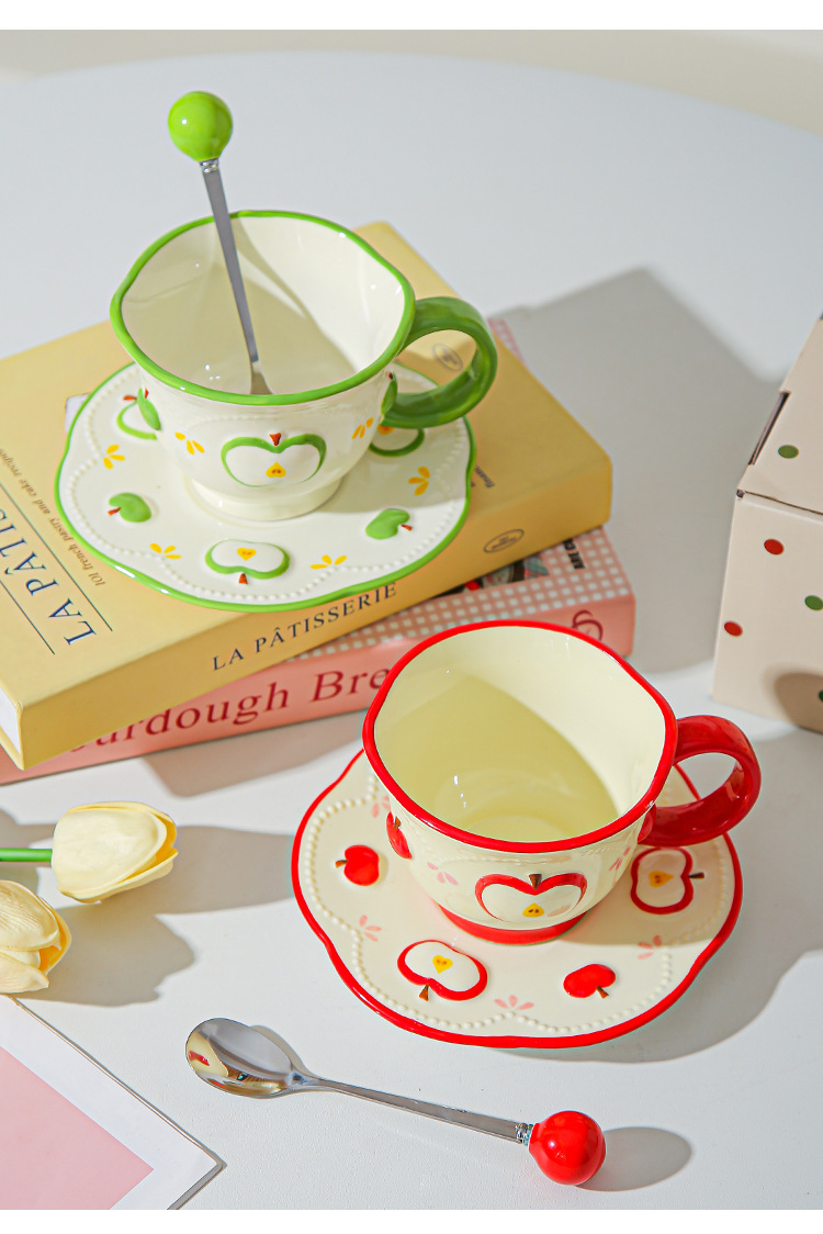 Tazas de café de cerámica de manzana, plato, taza de marca, diseño de relieve pintado a mano original, taza de agua, taza de leche de desayuno