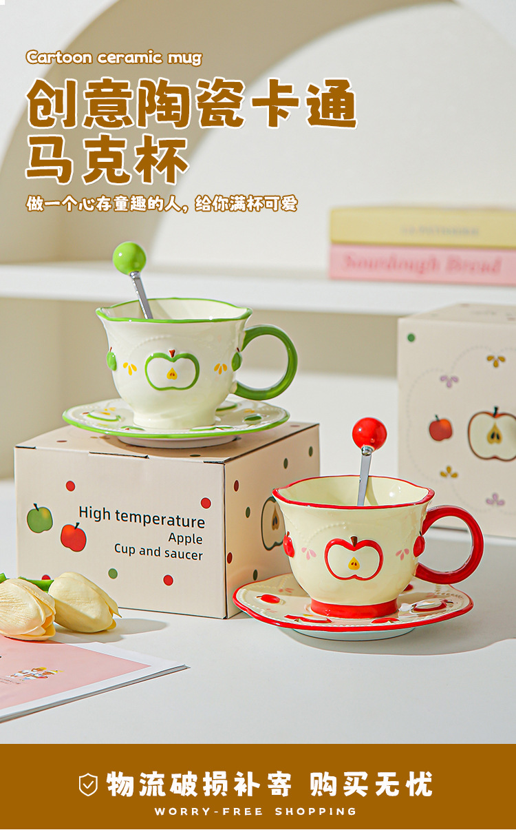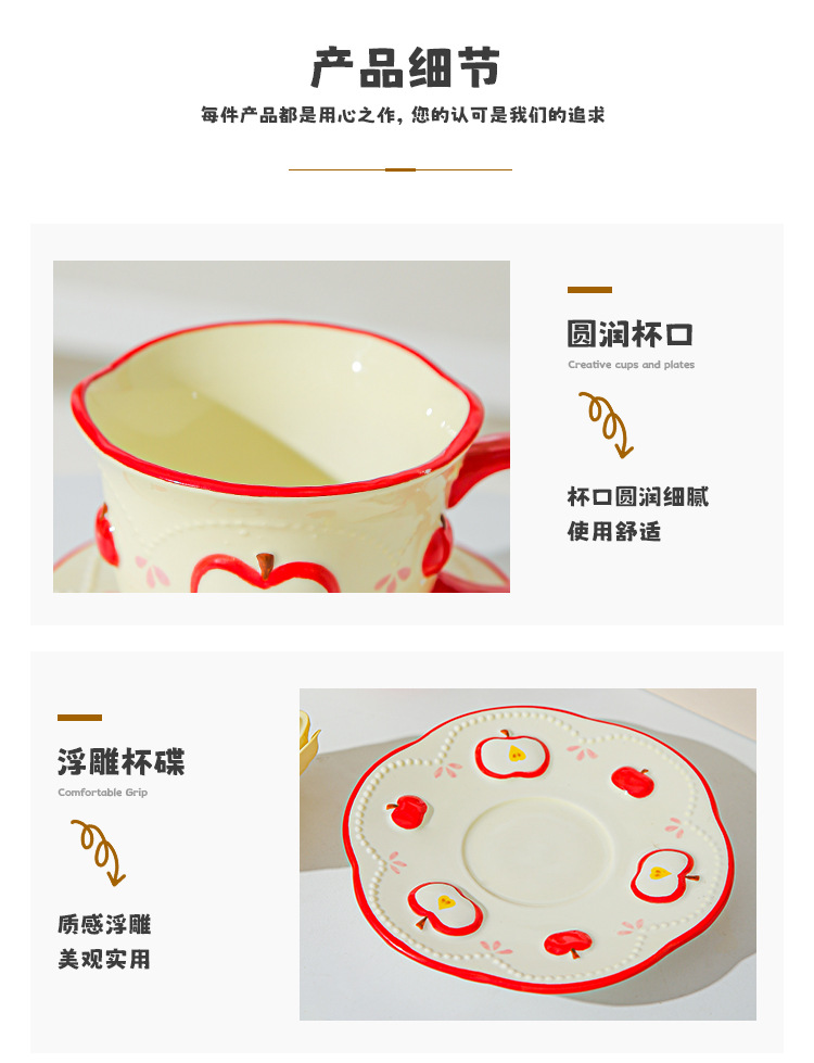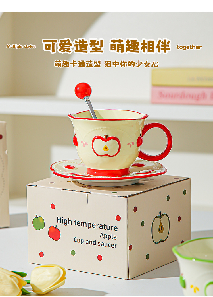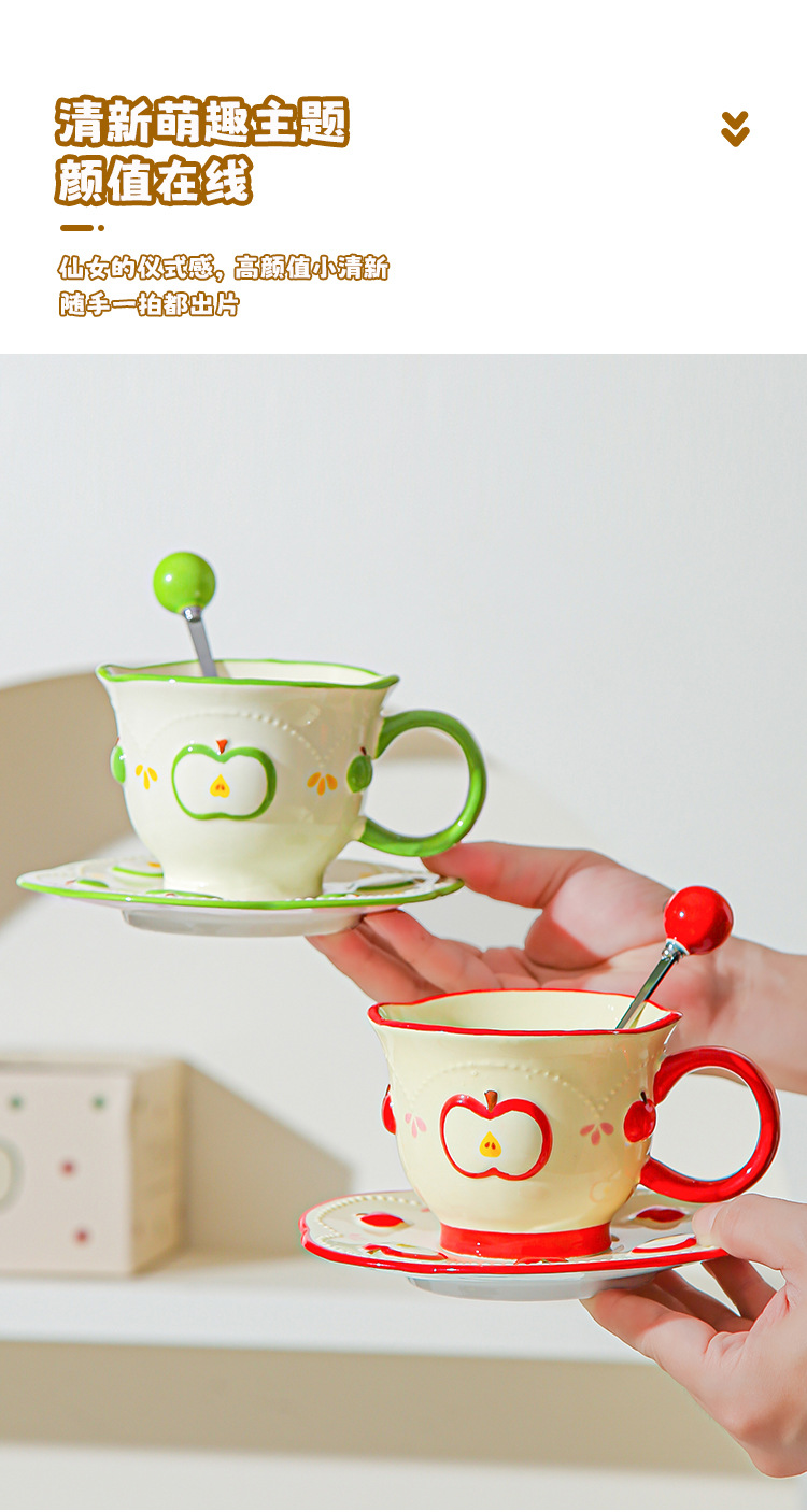 Tazas de café de cerámica de manzana, plato, taza de marca, diseño de relieve pintado a mano original, taza de agua, taza de leche de desayuno