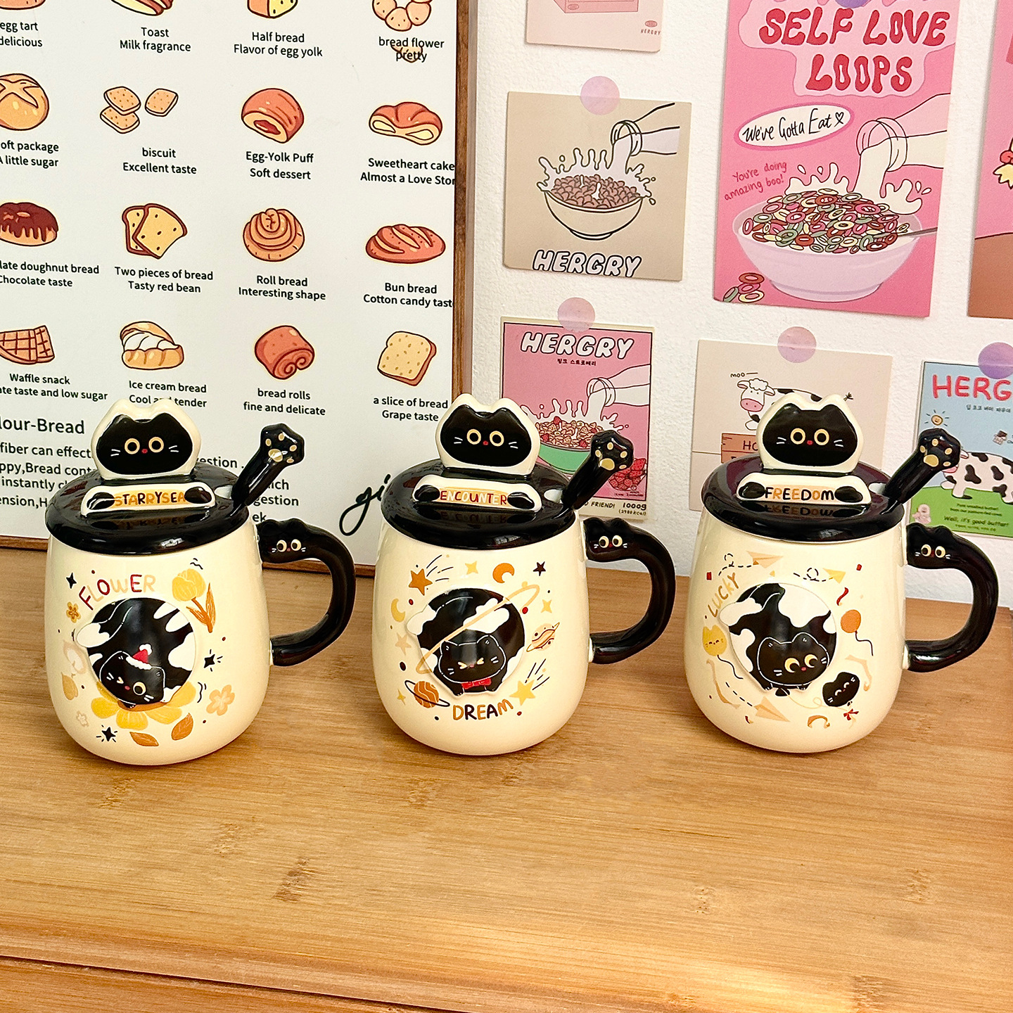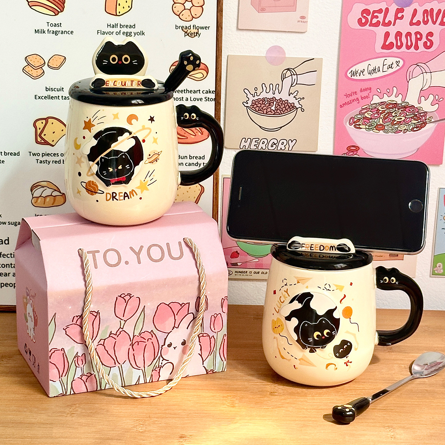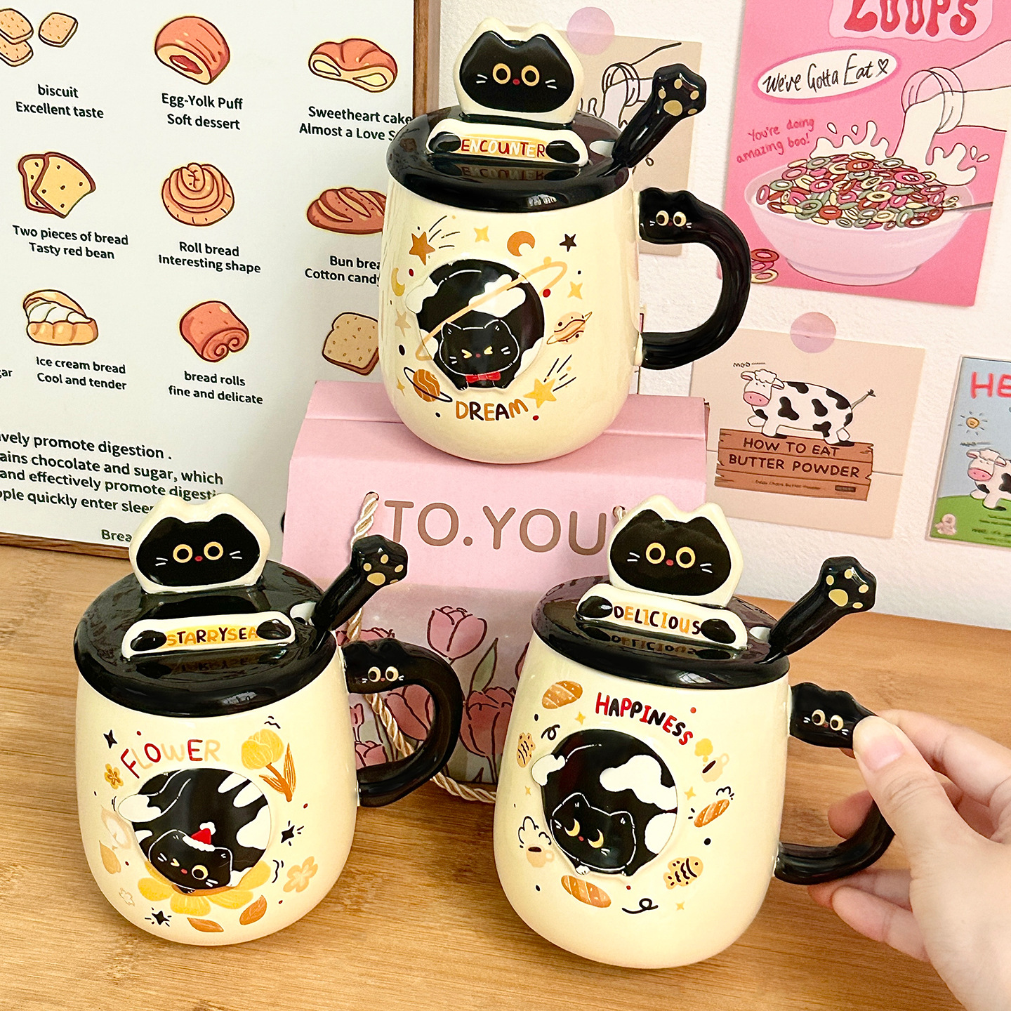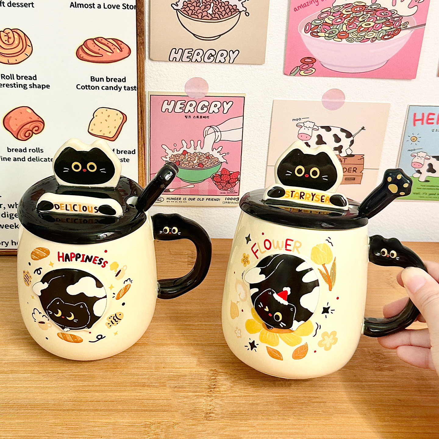 Cute gato cerámica taza con cubierta taza de cuchara de taza de agua de alto valor para niñas taza de regalo de cumpleaños casera taza de pareja