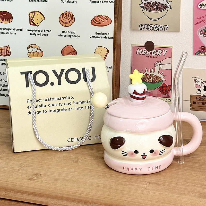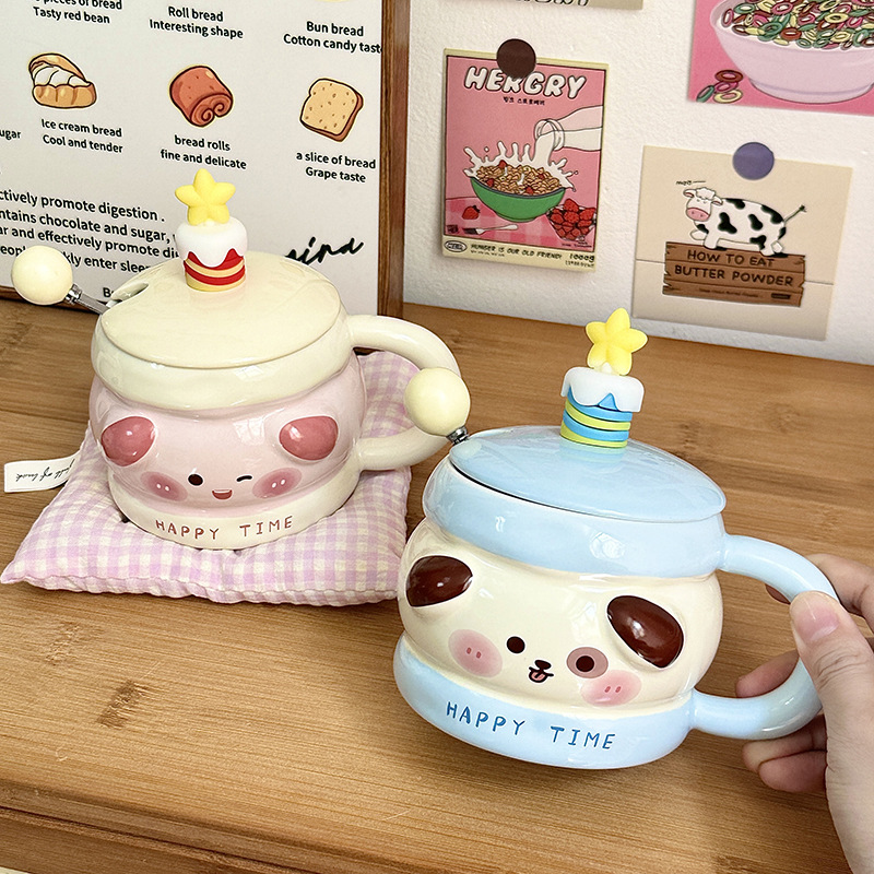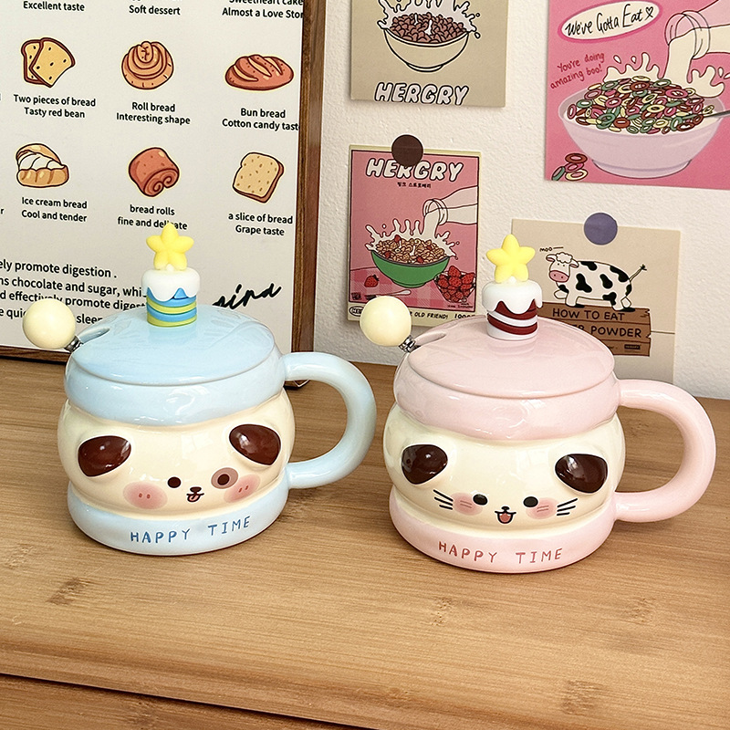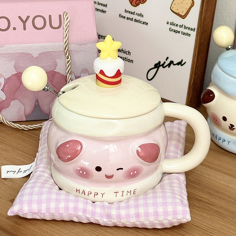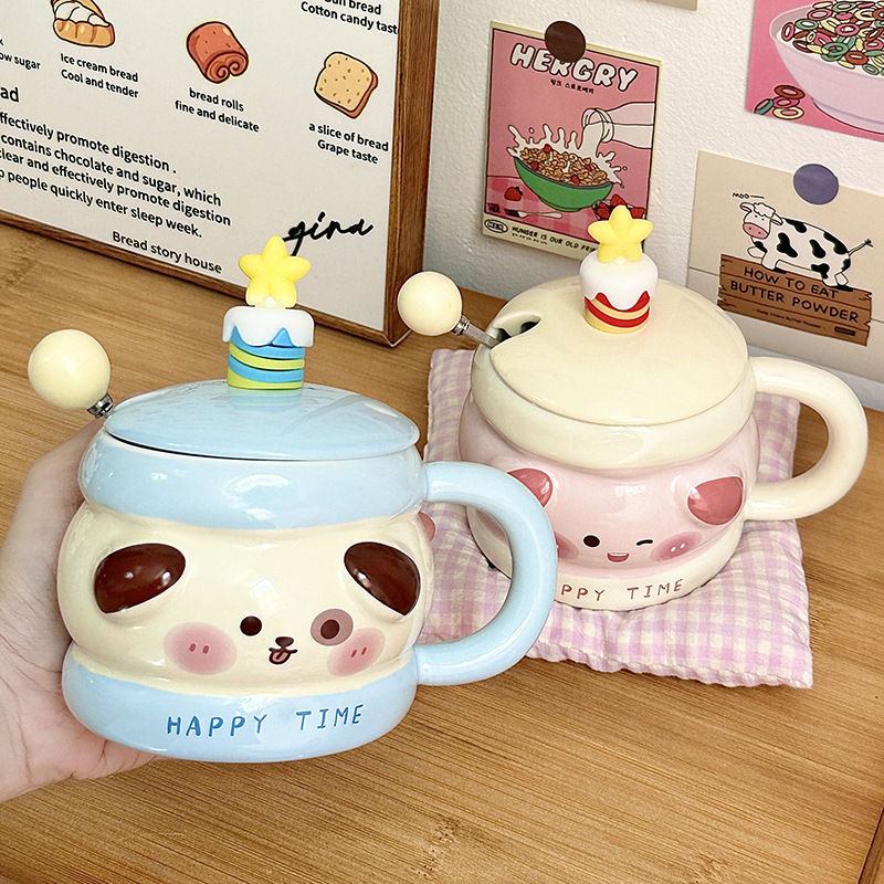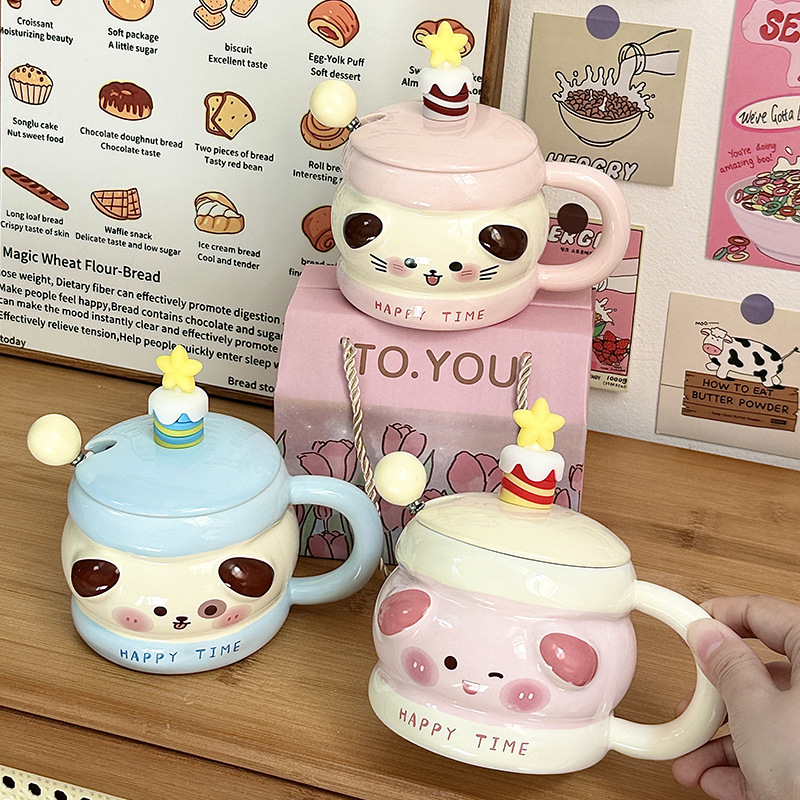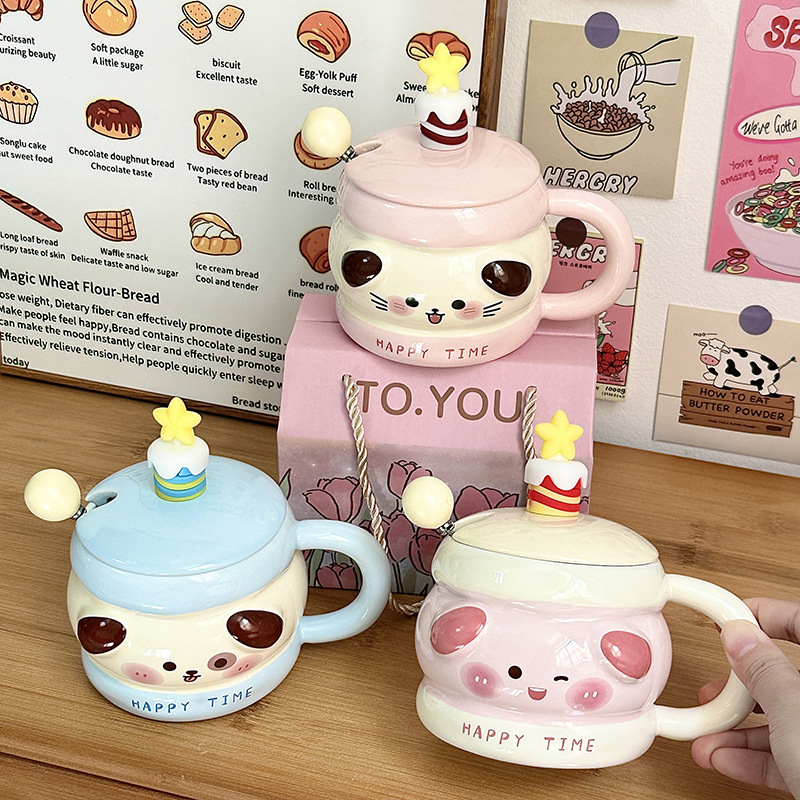 Regalo de cumpleaños taza de cerámica con cubierta de cuchara taza de agua de dibujos animados taza de regalo de mano taza de café doméstica de oficina mujer