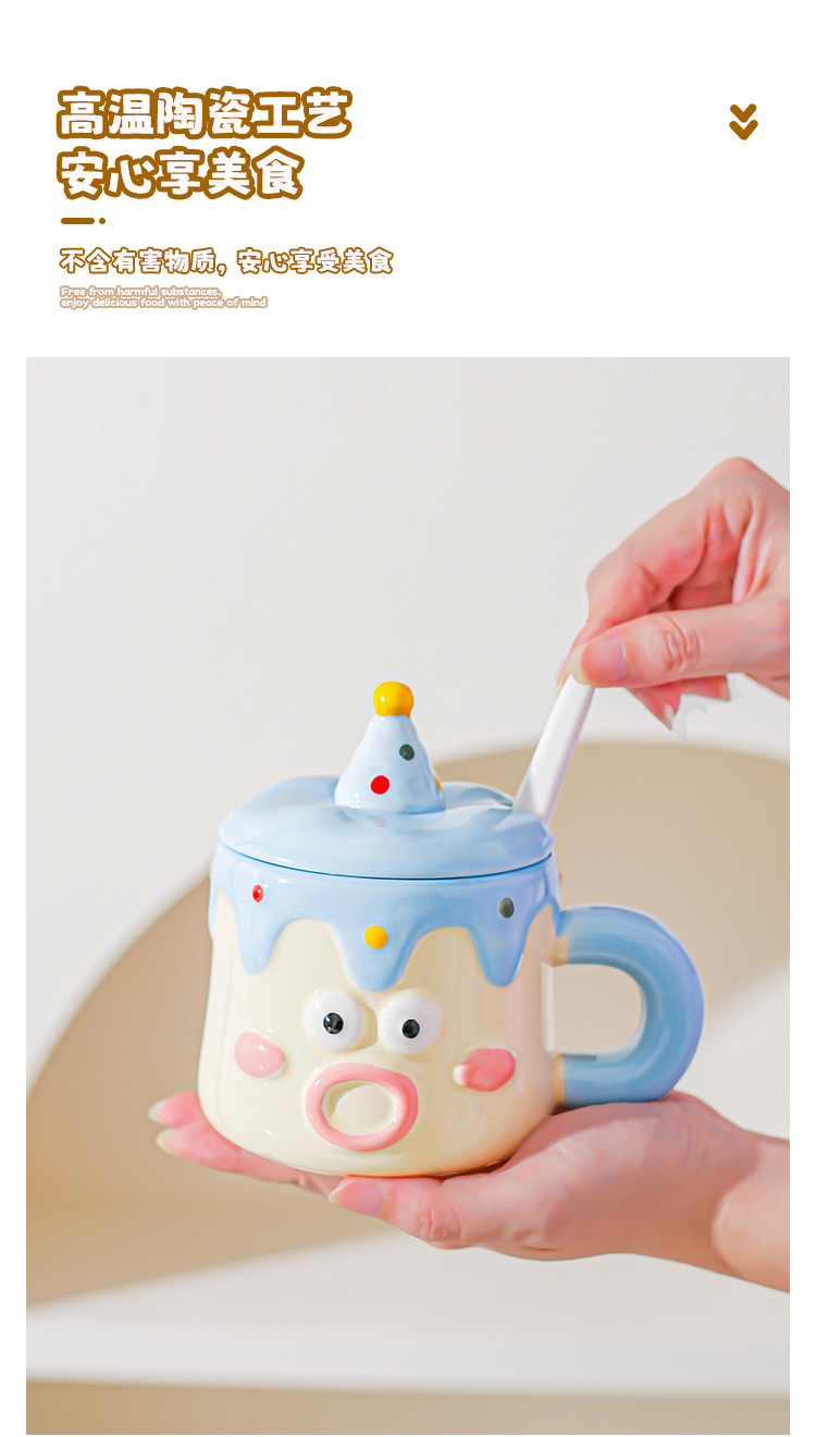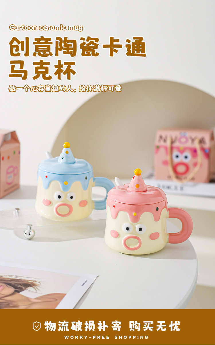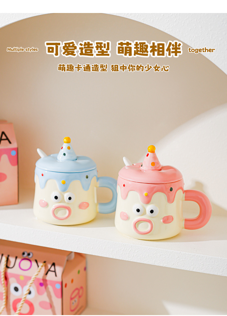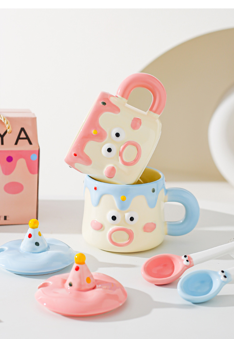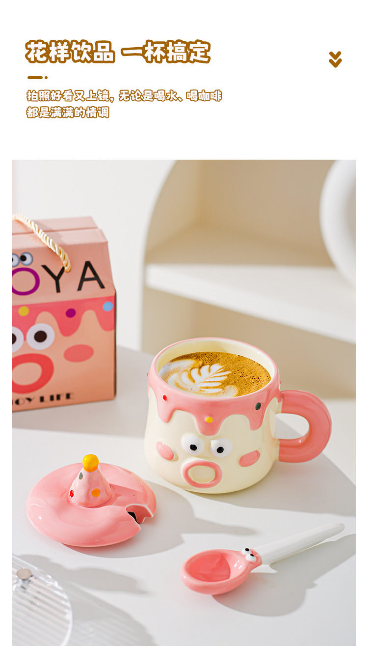 Tazas de dibujos animados pintadas a mano con cubierta de cuchara pareja taza de agua extraña taza de regalo de emoticon casera taza de desayuno de leche