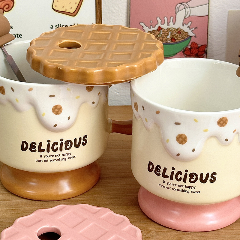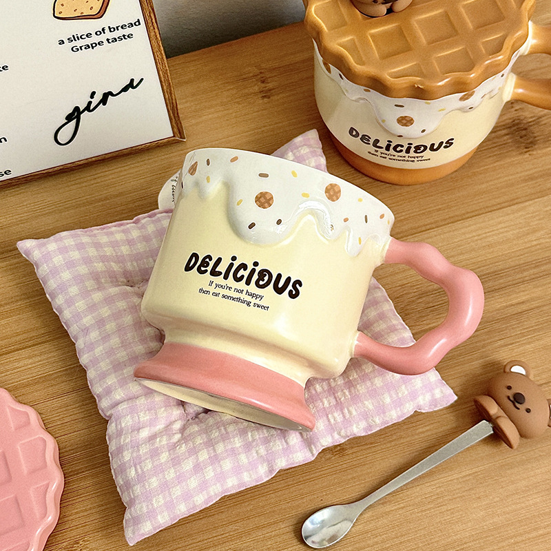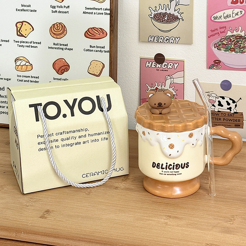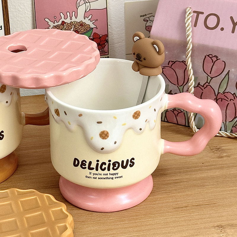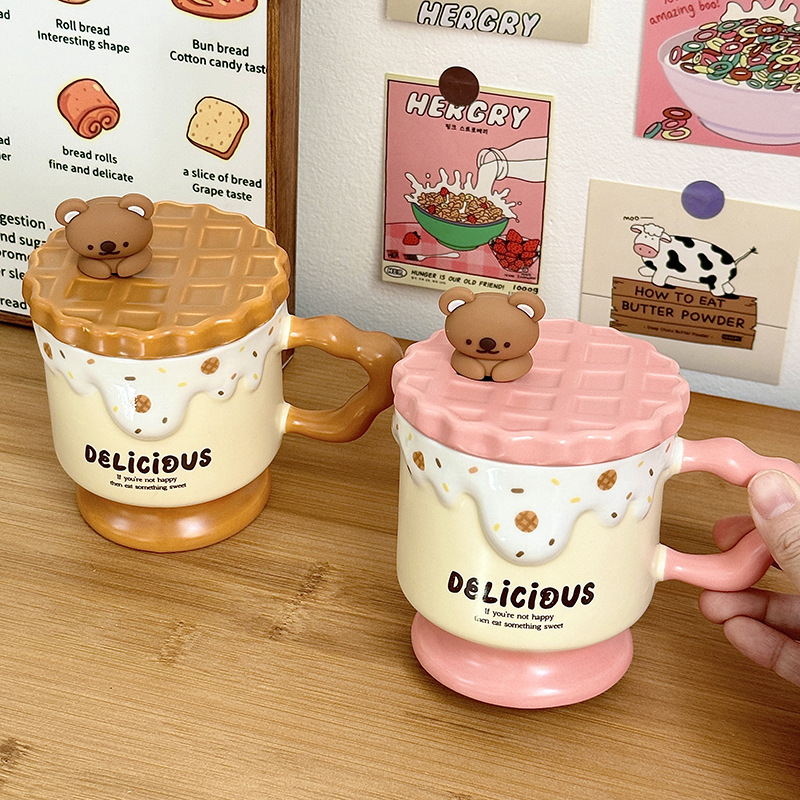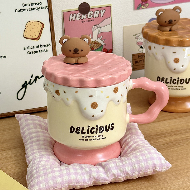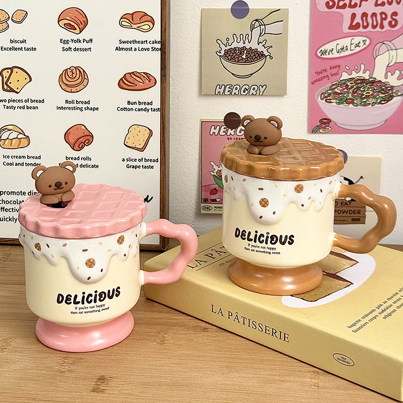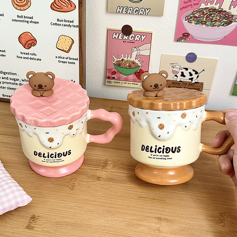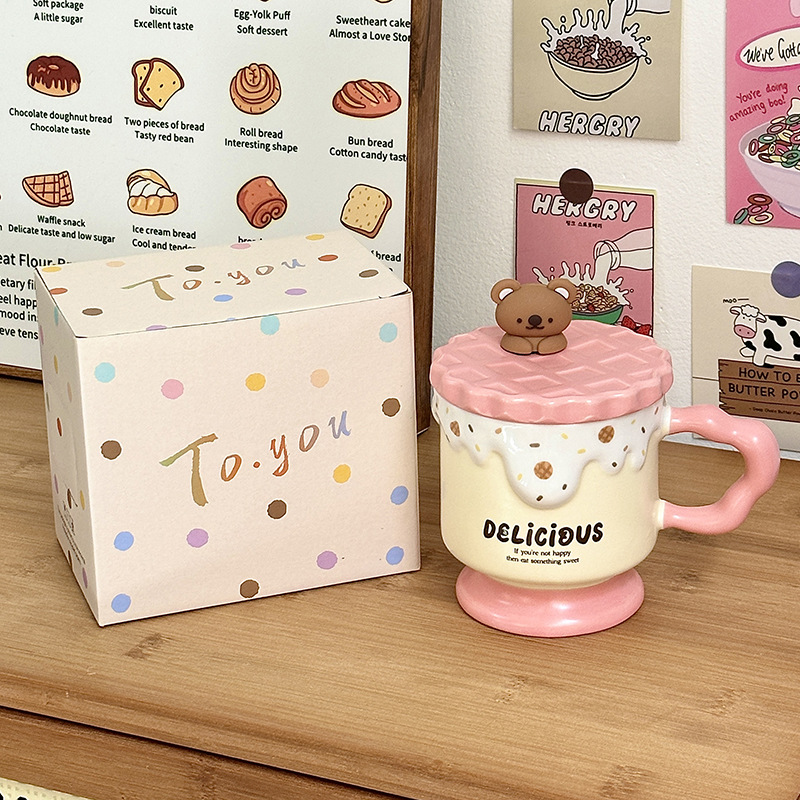 Oso taza de pie alto con regalo de cumpleaños taza de café taza de agua para mujer taza de cerámica de alto valor con tapa taza de cuchara